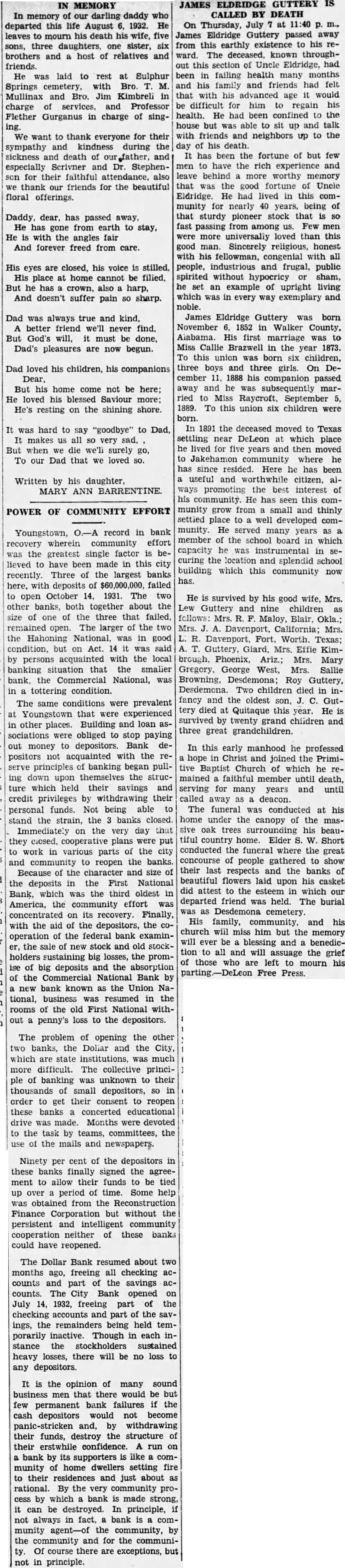 MEMORY In memory of our darling daddy departed this life August 1932. He leaves mourn his death his wife, five sons, three daughters, one sister, six brothers host of relatives and friends. He laid to rest at Sulphur Springs with Bro. Mullinax and Bro. Jim Kimbreli charge of and Professor Flether Gurganus in charge of We want to thank for their sympathy and kindness during the sickness and death of especially Scrivner and Dr. Stephenfor their faithful also thank our friends for the beautiful floral offerings. Daddy, dear, has passed away, He has gone from earth to stay, He with the angles And forever freed from care. His eyes are closed, his voice is His place at home cannot be filied, But he has crown, also harp, And doesn't suffer pain sharp. Dad was always true and kind, A better friend we'll never find, But God's must be done, Dad's pleasures are now begun. Dad loved his children, his companions Dear, But his home come not be here; He loved his blessed Saviour more; He's resting on the shining shore. was hard to say "goodbye" to Dad, It makes all very But when we die surely go, To our Dad that we loved so. Written by his daughter, MARY ANN BARRENTINE POWER OF COMMUNITY EFFORT Youngstown, record in bank recovery wherein community effort was the greatest single factor is believed to have been made in this city recently. Three of the largest banks with deposits of failed to open October 14, 1931. The two other banks, both together about the size of one of the three that failed, open. The larger of the two the Hahoning was in good condition, Act. said acquainted with the local persons banking situation that the smaller bank, Commercial National, was in tottering condition. The same conditions were prevalent Youngstown that were experienced in other places. Building and loan sociations were obliged to stop paying money to depositors. Bank positors acquainted with the serve banking began pulling down upon themselves the structure which held their savings and credit privileges by withdrawing their personal funds. being able stand the strain, the banks closed Immediately on the very day that they closed, cooperative plans were put to work in various parts of city and community to reopen the banks. Because of the character and size of the deposits in the First National Bank, which the third oldest America, the community effort was concentrated on its recovery. Finally, with the aid the depositors, operation of the federal bank examinthe sale new stock and old stockholders sustaining big losses, the promise of deposits the absorption of the Commercial National Bank by new bank known as the Union National, resumed in the rooms of the old First National without penny's loss to the depositors. The problem of opening the other two banks, the Dollar the City, which are state was much more difficult. The collective princiof banking was unknown to their thousands of small depositors, so in order get their consent reopen these banks concerted educational was made. Months were devoted to the task by teams, committees, the use of the mails and newspapers. Ninety per cent of the depositors in these banks finally signed agreement allow their funds to be tied up over period of time. Some help was from the Reconstruction Finance Corporation without the persistent and intelligent community cooperation neither of these banks could have reopened. The Dollar Bank resumed about two months ago, freeing all checking counts part the savings counts. City Bank opened on July 1932, freeing part of the accounts and part of the ings, the remainders being held porarily inactive. Though in each stance stockholders sustained heavy losses, there be no loss to any depositors. It is the opinion of many sound business men that there would be but few permanent bank failures the cash depositors would become and, by withdrawing their funds, destroy the structure of their erstwhile confidence. run on bank by its supporters like munity home dwellers setting fire their just about rational. By the very community by which bank made strong, be destroyed. In principle, not always in bank is munity the community, by the and for the communiOf there are exceptions, in principle. ELDRIDGE GUTTERY IS CALLED BY DEATH On Thursday, July at James Eldridge Guttery passed away from this earthly to ward. The deceased, known throughthis section of Uncle Eldridge, had been in failing health many months and his family and friends had felt that with his advanced age would be difficult him regain his health. He had been confined to the house but was able to sit and talk with friends and neighbors up to the day of his death. It has been the fortune of but few men to have rich leave behind more worthy memory that the good fortune Uncle Eldridge. He had lived in this community for nearly 40 years, being of that sturdy pioneer stock that is SO fast passing among us. Few men more universally loved than this good man Sincerely religious, honest with his fellowman, congenial with all people, industrious and frugal, public spirited without hypocricy sham, he set an example of upright living which was in every way exemplary and noble. James Eldridge Guttery was born November 1852 in Walker County, Alabama. first marriage was to Miss Callie Brazwell in the year 1873. To this union was born six children, three and three girls. On December 11. 1888 his companion passed away and he subsequently married to Miss Raycroft, September 1889. To this union six children were born. In deceased moved to Texas settling near DeLeon at which place he lived for five years and then moved to Jakehamon where he has since resided. Here he been useful worthwhile citizen, alpromoting best interest of his community. He has seen this community grow from small and thinly settied place to well developed community. He served many years as member of the school board in which capacity he was instrumental in curing the location and splendid school building which this community now has. He surv