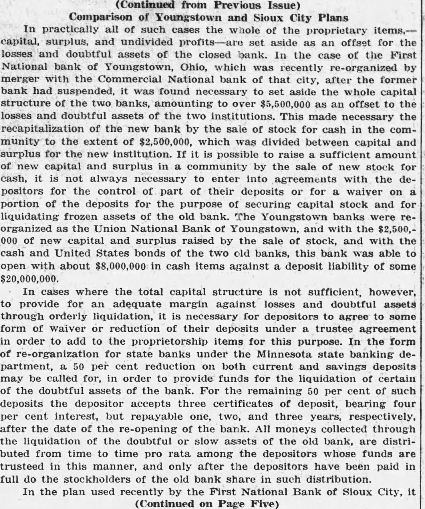 (Continued from Previous Issue) Comparison Youngstown and Sioux City Plans In practically all such the whole the proprietary capital, surplus, and undivided set aside an offset for the losses and doubtful assets of the closed bank. In the of the First National bank of Youngstown, Ohio, which recently by with the Commercial National bank of that city, after the former bank had suspended, found necessary to set aside the whole capital structure the two banks, amounting $5,500,000 offset the losses and doubtful assets the two institutions. This made necessary the recapitalization of the new bank by the sale of stock for cash in the munity to the extent $2,500,000, which divided between capital and surplus for the institution. If possible to raise sufficient amount capital and surplus community by the sale of stock for cash, not always necessary to enter into agreements with the depositors for the control of part of their deposits for waiver portion of the deposits for the purpose of securing capital stock and for liquidating frozen assets the bank. Youngstown banks organized the Union National Bank of and the $2,500,000 of capital and surplus raised by the sale of stock, and with the cash and United States bonds of the two old banks, this bank able with about $8,000,000 in cash items against deposit liability of some In cases where the total capital structure is not sufficient, however, provide for adequate margin against losses doubtful assets through orderly liquidation, necessary for depositors to agree some form of waiver or reduction of their deposits under trustee agreement order to add to the proprietorship items for this purpose. In the form for state banks under the Minnesota state banking department, per cent reduction both current savings deposits may called for, order to provide funds for the liquidation of certain of the doubtful assets of the bank. For the remaining 50 per cent of such deposits the depositor accepts three certificates of deposit, bearing four per cent interest, but repayable one, two, and three years, after the date the re-opening the bank. All moneys collected through the liquidation of doubtful or slow assets of the old bank, distributed from time to time pro rata among the depositors whose funds trusteed in this manner, and only after the depositors have been paid in full do the stockholders of the old bank share in such distribution. In the plan used recently by the First National Bank Sioux City, (Continued on Page Five)