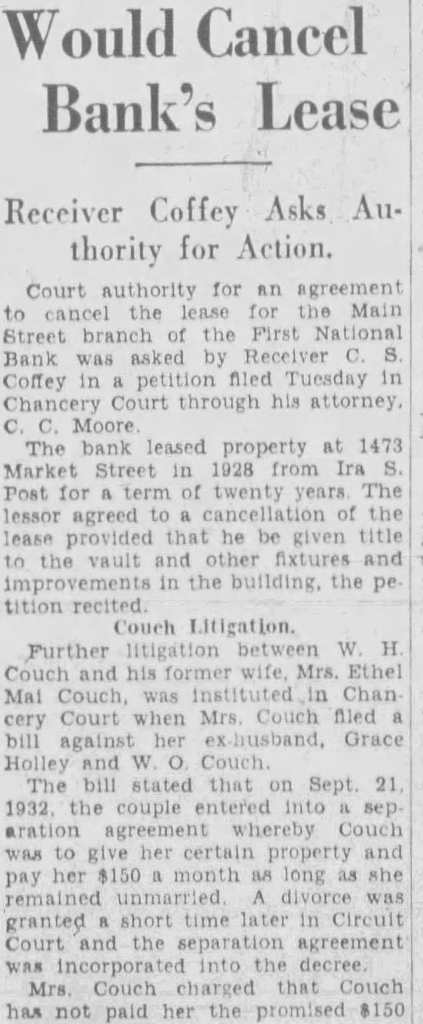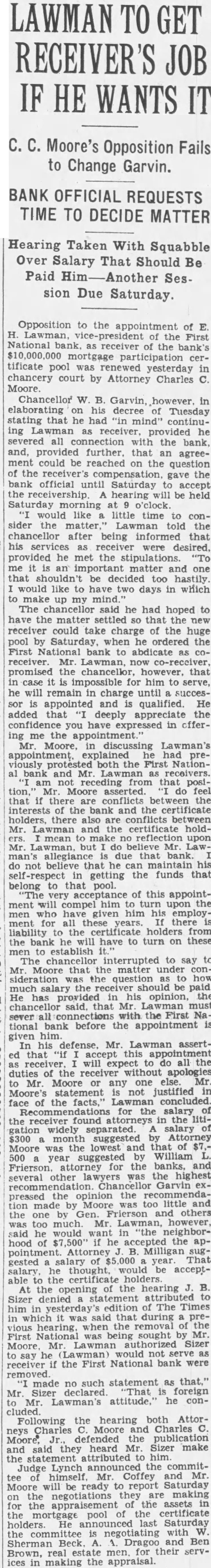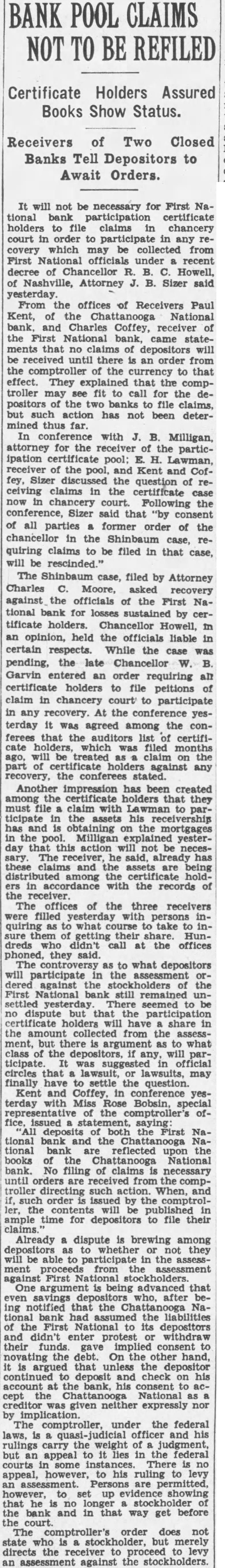 Frierson Asks Advance. The three firms filing claims include Sizer, Chambliss Kefauver, Thomas, Coffey & Folts. In behalf of the firm of Williams & Frierson, William Frierson is asking an "advance" of for fees. Charles S. Coffey and J. B. Sizer filed petition for $10,000 to be divided between their two firms. Neither firm has stated how much it eventually expects to Taylor Durham, vice-president of the First National bank; Hoskins and other stockholders and officers who were present when the board voted to place the mortgage pool into receivership will testify that Mr. Frierson was hired the attorney of the bank and that the bank arranged for payment of all expenses incident to the receivership, learned. In his statement, Mr. Milligan states that the bank wrote certificate holders establishing of the receivership the pool that bear all expenses protect the certificate holders all expense for attorneys' and resolution has been placed upon the minutes First National bank which shows that board of directors Mr. fee of $10,for his in connection with the Frierson however, that the fee was paid him defend the bank and not pool, was revealed yesterday. Of the $10,000 fee, the attorney collected $8,000, according to Mr. Milligan.