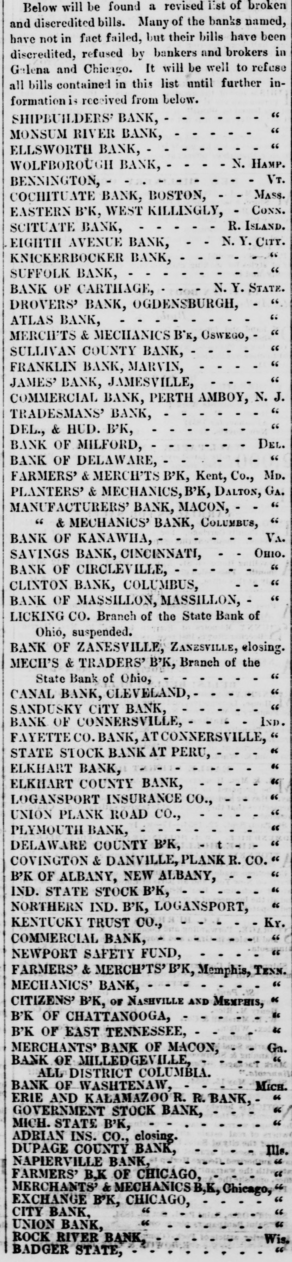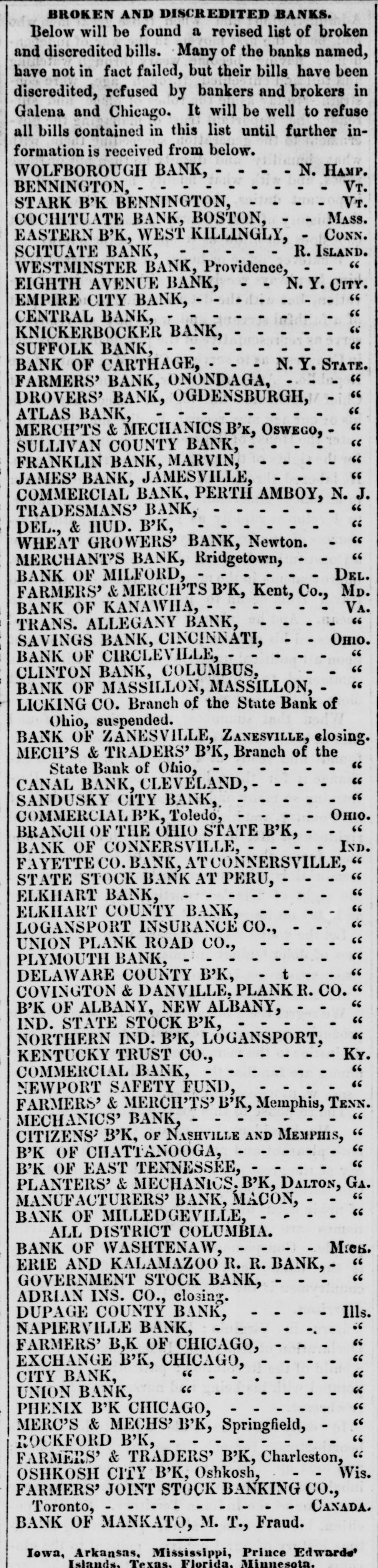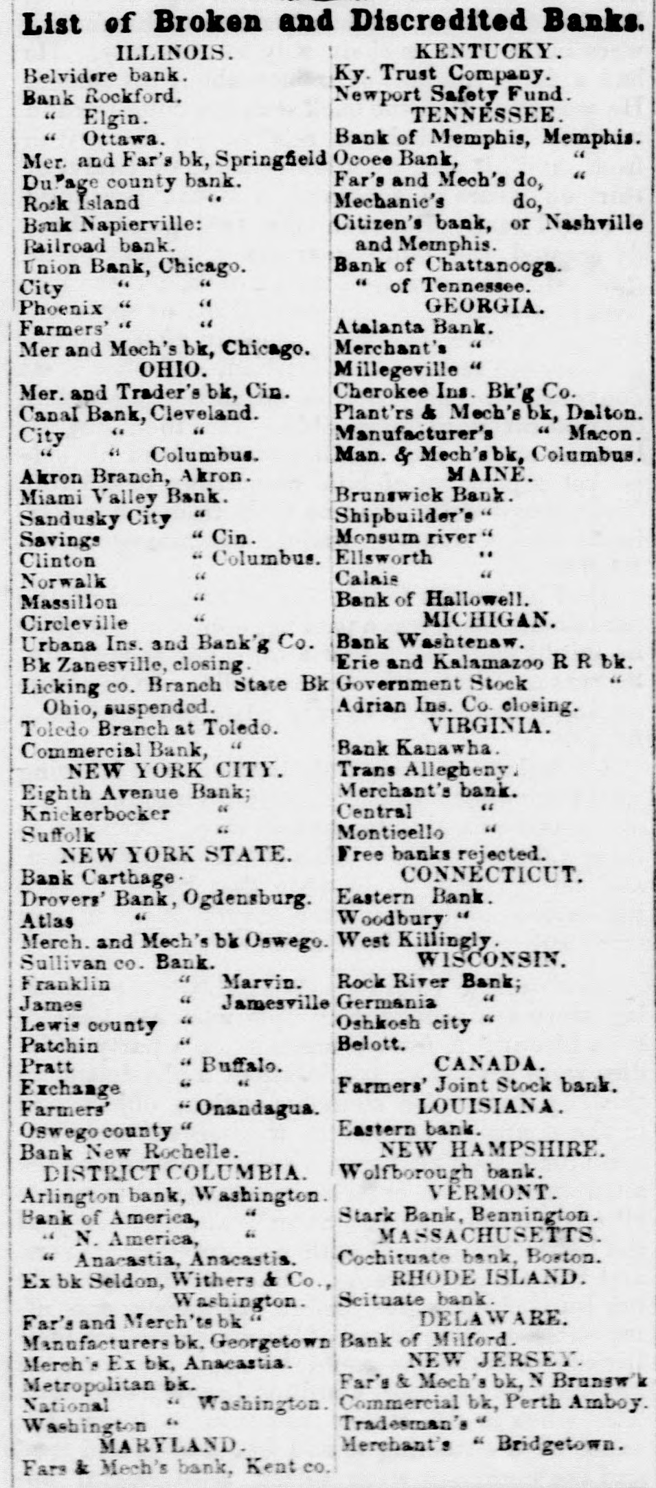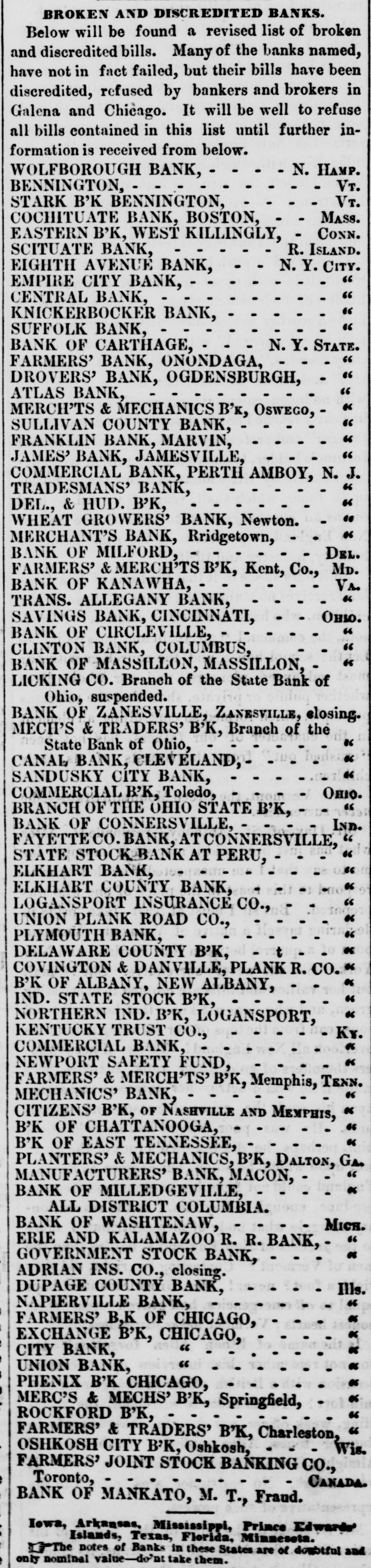 # BROKEN BANKS. We have been furnished the following list of broken and discredited Banks, which will be found of interest aud benefit to our readers. BRUNSWICK BANK, - - - - - MAINE. SHIPBUILDERS' BANK, - - - - - “ MONSUM RIVER BANK, - - - - - “ ELLSWORTH BANK, - - - - - “ WOLFBOROUGH BANK, - - - - - N. HAMP. BENNINGTON, - - - - - Ѵт. COCHITUATE BANK, BOSTON, - - - - - MASS. EASTERN B'K, WEST KILLINGLY, - - - - - CONN. SCITUATE BANK, - - - - - R. ISLAND. EIGHTH AVENUE BANK, - - - - - N. Y. CITY. KNICKERBOCKER BANK, - - - - - “ SUFFOLK BANK, - - - - - “ BANK OF CARTHAGE, - - - - - N. Y. STATE. DROVERS' BANK, OGDENSBURGH, - - - - - “ ATLAS BANK, - - - - - “ MERCH'TS & MECHANICS B'K, OSWEGO, - - - - - “ SULLIVAN COUNTY BANK, - - - - - “ FRANKLIN BANK, MARVIN, - - - - - “ JAMES' BANK, JAMESVILLE, - - - - - “ COMMERCIAL BANK, PORT AMBOY, N. J. TRADESMANS' BANK, - - - - - “ BANK OF MILFORD, - - - - - DEL. BANK OF DELAWARE, - - - - - “ FARMERS' & MERCH'TS B'K, Kent, Co., MD. PLANTERS' & MECHANICS, B'K, DALTON, GA. MANUFACTURERS' BANK, MACON, - - - - - “ “ & MECHANICS' BANK, COLUMBUS, “ BANK OF KANAWHA, - - - - - V.A. SAVINGS BANK, CINCINNATI, - - - - - Сто. BANK OF CIRCLEVILLE, - - - - - “ CLINTON BANK, COLUMBUS, - - - - - “ BANK OF MASSILLON, MASSILLON, - - - - - “ LICKING CO. Branch of the State Bank of Ohio, suspended. BANK OF ZANESVILLE, ZANESVILLE, closing. BANK OF CONNERSVILLE, - - - - - IND. FAYETTE CO. BANK, AT CONNERSVILLE, “ STATE STOCK BANK AT PERU, - - - - - “ ELKHART BANK, - - - - - “ ELKHART COUNTY BANK, - - - - - “ LOGANSPORT INSURANCE CO., - - - - - “ UNION PLANK ROAD CO., - - - - - “ PLYMOUTH BANK, - - - - - “ DELAWARE COUNTY B'K, - t - - - - “ COVINGTON & DANVILLE, PLANK R. CO. “ B'K OF ALBANY, NEW ALBANY, - - - - - “ IND. STATE STOCK B'к, - - - - - “ NORTHERN IND. B'K, LOGANSPORT, - - - - - “ KENTUCKY TRUST CO., - - - - - KY. NEWPORT SAFETY FUND, - - - - - “ FARMERS' & MERCH'TS' B'K, Memphis, TENN. MECHANICS' BANK, - - - - - “ CITIZENS' B'K, OF NASHVILLE AND MENTHIS, “ B'K OF CHATTANOOGA, - - - - - “ B'K OF EAST TENNESSEE, - - - - - “ BANK OF WASHTENAW, - - - - - MICH. ERIE AND KALAMAZOO R. R. BANK, - - - - - “ GOVERNMENT STOCK BANK, - - - - - “ MICH. STATE B'K, - - - - - “ ADRIAN INS. CO., closing.
