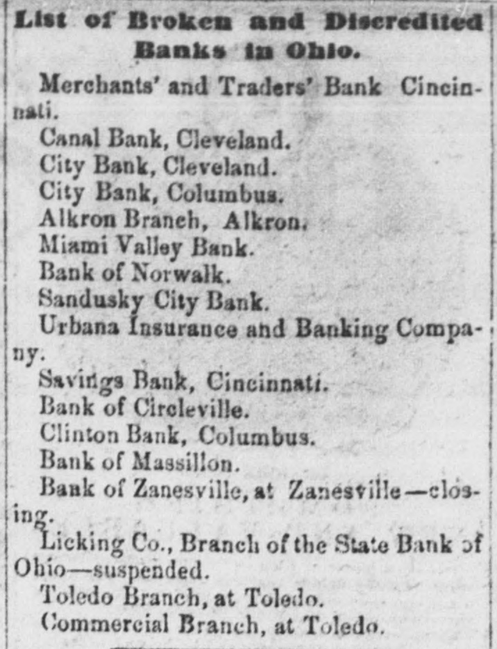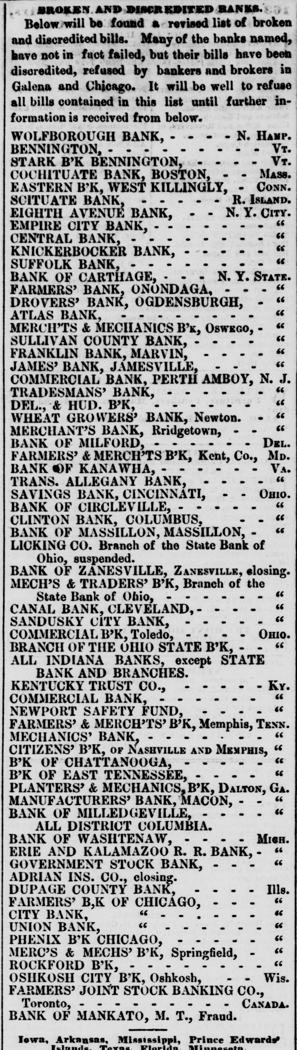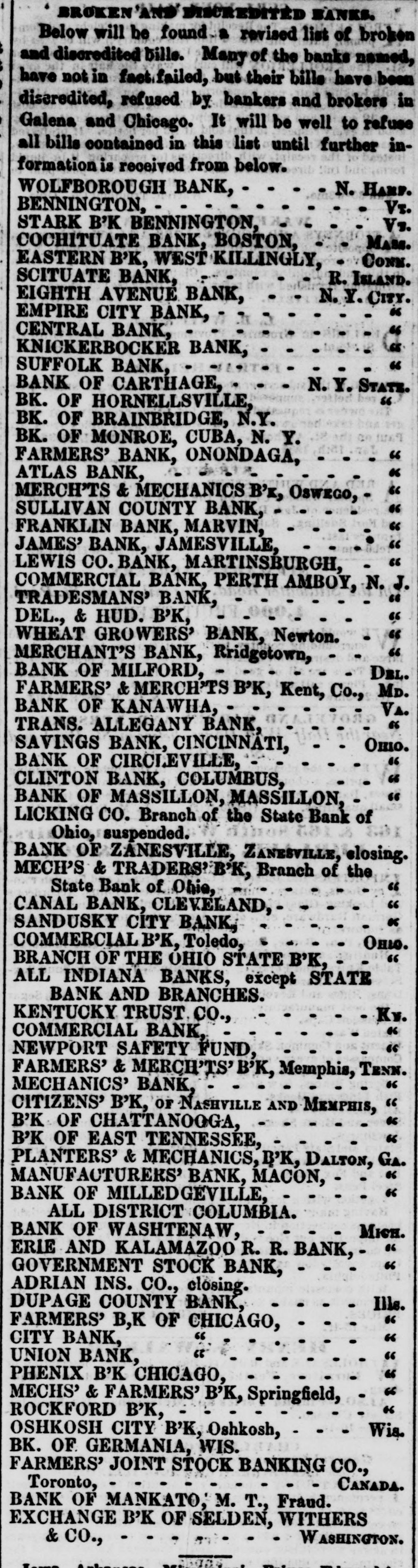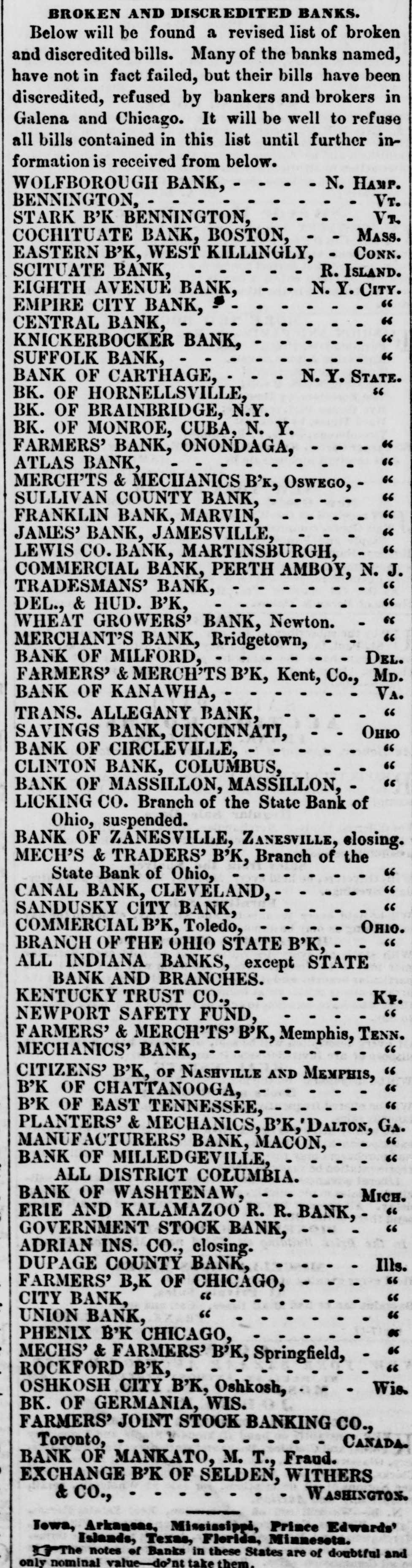 # BROKEN BANKS. We have been furnished the following list of broken and discredited Banks, which will be found of interest aud benefit to our readers. BRUNSWICK BANK, - - - - - MAINE. SHIPBUILDERS' BANK, - - - - - “ MONSUM RIVER BANK, - - - - - “ ELLSWORTH BANK, - - - - - “ WOLFBOROUGH BANK, - - - - - N. HAMP. BENNINGTON, - - - - - Ѵт. COCHITUATE BANK, BOSTON, - - - - - MASS. EASTERN B'K, WEST KILLINGLY, - - - - - CONN. SCITUATE BANK, - - - - - R. ISLAND. EIGHTH AVENUE BANK, - - - - - N. Y. CITY. KNICKERBOCKER BANK, - - - - - “ SUFFOLK BANK, - - - - - “ BANK OF CARTHAGE, - - - - - N. Y. STATE. DROVERS' BANK, OGDENSBURGH, - - - - - “ ATLAS BANK, - - - - - “ MERCH'TS & MECHANICS B'K, OSWEGO, - - - - - “ SULLIVAN COUNTY BANK, - - - - - “ FRANKLIN BANK, MARVIN, - - - - - “ JAMES' BANK, JAMESVILLE, - - - - - “ COMMERCIAL BANK, PORT AMBOY, N. J. TRADESMANS' BANK, - - - - - “ BANK OF MILFORD, - - - - - DEL. BANK OF DELAWARE, - - - - - “ FARMERS' & MERCH'TS B'K, Kent, Co., MD. PLANTERS' & MECHANICS, B'K, DALTON, GA. MANUFACTURERS' BANK, MACON, - - - - - “ “ & MECHANICS' BANK, COLUMBUS, “ BANK OF KANAWHA, - - - - - V.A. SAVINGS BANK, CINCINNATI, - - - - - Сто. BANK OF CIRCLEVILLE, - - - - - “ CLINTON BANK, COLUMBUS, - - - - - “ BANK OF MASSILLON, MASSILLON, - - - - - “ LICKING CO. Branch of the State Bank of Ohio, suspended. BANK OF ZANESVILLE, ZANESVILLE, closing. BANK OF CONNERSVILLE, - - - - - IND. FAYETTE CO. BANK, AT CONNERSVILLE, “ STATE STOCK BANK AT PERU, - - - - - “ ELKHART BANK, - - - - - “ ELKHART COUNTY BANK, - - - - - “ LOGANSPORT INSURANCE CO., - - - - - “ UNION PLANK ROAD CO., - - - - - “ PLYMOUTH BANK, - - - - - “ DELAWARE COUNTY B'K, - t - - - - “ COVINGTON & DANVILLE, PLANK R. CO. “ B'K OF ALBANY, NEW ALBANY, - - - - - “ IND. STATE STOCK B'к, - - - - - “ NORTHERN IND. B'K, LOGANSPORT, - - - - - “ KENTUCKY TRUST CO., - - - - - KY. NEWPORT SAFETY FUND, - - - - - “ FARMERS' & MERCH'TS' B'K, Memphis, TENN. MECHANICS' BANK, - - - - - “ CITIZENS' B'K, OF NASHVILLE AND MENTHIS, “ B'K OF CHATTANOOGA, - - - - - “ B'K OF EAST TENNESSEE, - - - - - “ BANK OF WASHTENAW, - - - - - MICH. ERIE AND KALAMAZOO R. R. BANK, - - - - - “ GOVERNMENT STOCK BANK, - - - - - “ MICH. STATE B'K, - - - - - “ ADRIAN INS. CO., closing.