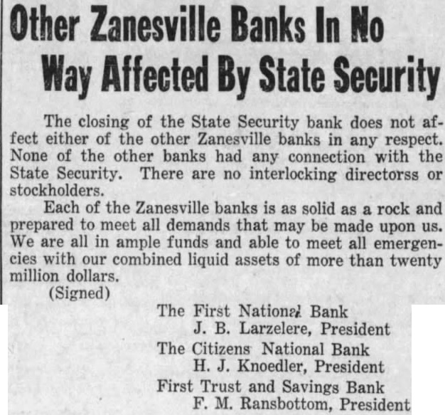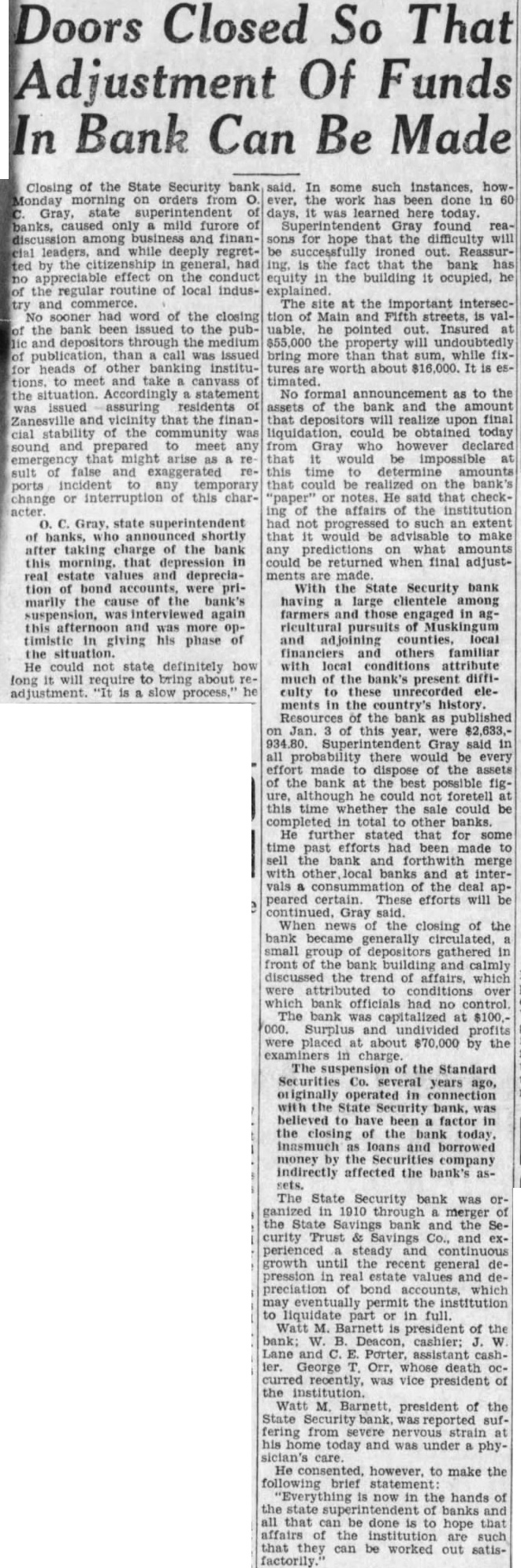 Doors Closed So That Adjustment Of Funds In Bank Can Be Made Closing of the State Security bank Monday morning on orders Gray, state superintendent banks, caused only mild furore among and finanand while regretby effect on the conduct the regular of local indusand No sooner had word of the closing the bank been issued to the puband depositors the call heads instituto meet and canvass of the Accordingly statement issued assuring residents and vicinity that the financial the sound prepared meet any might sult false and exaggerated reports temporary change or interruption of this char- C. Gray, state superintendent of shortly taking of the bank this that in real estate values and depreciation of bond accounts, primarily the cause of the bank's suspension, again this and was in giving phase the could not state definitely how long will require to about adjustment. slow process,' said. In some such instances, however, the work has been done in was learned here today. Superintendent Gray found reasons for hope that the difficulty will is the that the bank has equity the building it ocupied, he explained. The at the important intersection of Main and Fifth streets, valhe pointed Insured the property bring more than that while fixabout $16,000. timated. No formal as to the assets the bank and the amount that depositors will realize final could be today be time to could realized the bank's notes. He said that checkthe affairs of the institution had not an extent would be advisable to make any amounts could be returned final adjustments are With the State Security bank having large clientele among farmers engaged in agothers familiar with local conditions attribute much of the bank's present difficulty to these unrecorded elements in the country's history. the bank Jan. of this year, $2,633,Gray said all probability there be every effort made to dispose of the assets the bank the best possible figure, although he could not foretell this time the sale could be total that for been to the bank merge with other local banks and intervals the deal appeared certain. These efforts will Gray When the closing of the generally circulated, small group gathered front the and calmly discussed the trend of which attributed conditions over which bank officials had no bank at Surplus and were placed $70,000 by the The of the Standard Co. years ago, originally operated in with the bank, factor the closing the today and borrowed money by the Securities indirectly affected the bank's as- The State Security bank was orthe bank and the curity Trust and steady growth until the recent general pression in estate values and preciation which the institution to part in Watt M. president of bank; W. Deacon, cashier: Lane George Orr, whose death curred recently, was vice president of the Barnett, president of the fering from his today and was under physician's care. He consented, however, to make the following statement: now in the hands of that can be done to hope that affairs the institution are can be worked out