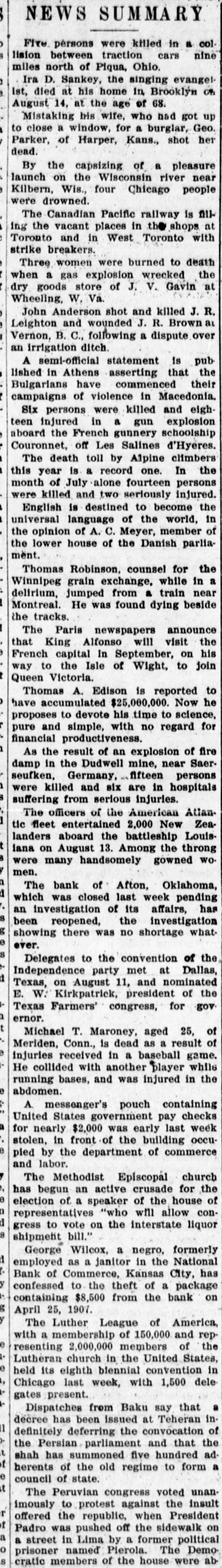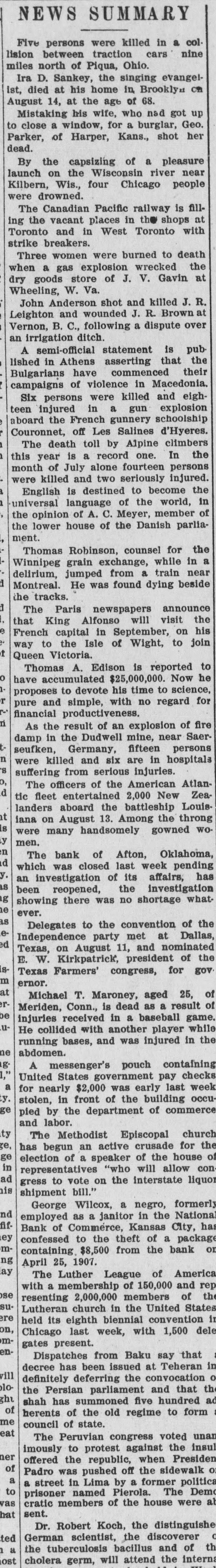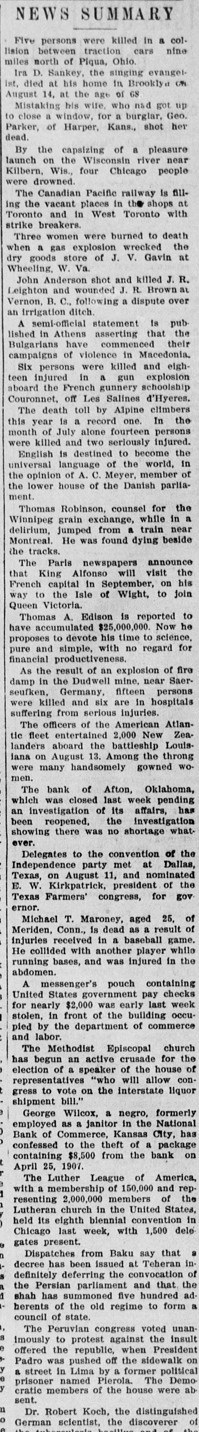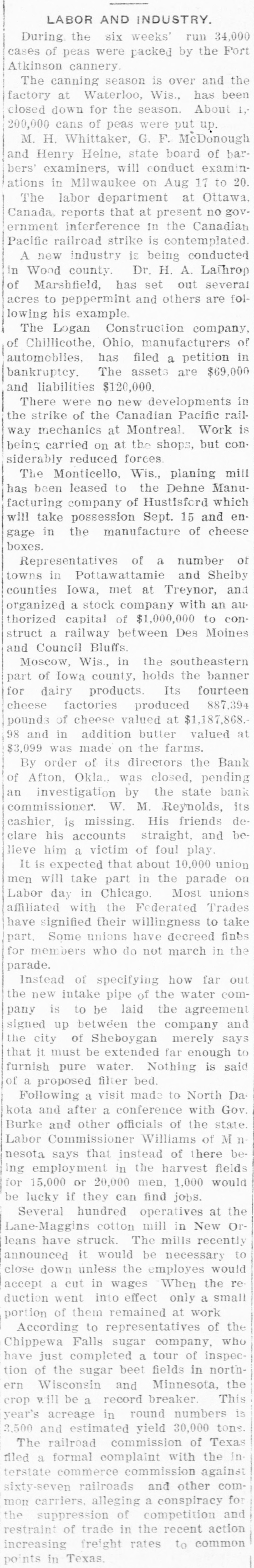During the six weeks' run 34,000 cases of peas were packed by the Fort Atkinson cannery. The canning season is over and the factory at Waterloo, Wis, has been closed down for the season. About 1,200,000 cans of peas were put up. M. H. Whittaker, G. F. McDonough and Henry Heine, state board of barbers' ex aminers, will conduct examinations in Milwaukee on Aug 17 to 20. The labor department at Ottawa, Canada, reports that at present no government inferference in the Canadian Pacific railroad strike is contemplated. A new industry is being conducted in Wond county. Dr. H. A. Lathrop of Marshfield. has set out several acres to peppermint and others are-following his example. The Logan Construction company, of Chillicothe, Ohio, manufacturers of automoblies, has filed a petition in bankruptey. The assets are $69,000 and liabilities $120,000. There were no new developments in the strike of the Canadian Pacific railway mechanics at Montreal. Work is being carried on at the shops, but considerably reduced forces. The Monticello. Wis., planing mill has been leased to the Dehne Manufacturing company of Hustisford which will take possession Sept. 15 and engage in the manufacture of cheese boxes. Representatives of a number of towns In Pottawattamie and Shelby counties Iowa, met at Treynor. and organized a stock company with an authorized capital of $1,000,000 to construct a railway between Des Moines and Council Bluffs. Moscow, Wis., in the southeastern part of Iowa county. holds the banner for dairy products. Its fourteen cheese factories produced 887,394 pounds of cheese valued at $1.187,868.98 and in addition butter valued at $3,099 was made on the farms. By order of its directors the Bank of Afton, Okla., was closed, pending an investigation by the state bank commissioner. W. M. Reynolds, its cashier. is missing. His friends declare his accounts straight, and believe him a victim of foul play. It is expected that about 10,000 union men will take part in the parade on Labor day in Chicago. Most unions affiliated with the Federated Trades have signified their willingness to take part. Some unions have decreed fines for members who do not march in the parade. Instead of specifying how far out the new intake pipe of the water company is to be laid the agreement signed up between the company and the city of Sheboygan merely says that it must be extended far enough to furnish pure water. Nothing is said of a proposed filter bed. Following a visit made to North Da kota and after a conference with Gov. Burke and other officials of the state Labor Commissioner Williams of M'nnesota says that instead of there being employment in the harvest fields for 15,000 or 20,000 men, 1,000 would be lucky If they can find jobs. Several hundred operatives at the Lane-Maggins cotton mill in New Orleans have struck. The mills recently announced it would be necessary to close down unless the employes would accept a cut in wages When the reduction went into effect only a small portion of them remained at work According to representatives of the Chippewa Falls sugar company, who have just completed a tour of inspection of the sugar beet fields in northern Wisconsin and Minnesota, the crop will be a record breaker This year's acreage in round numbers is 3,500 and estimated yield 30,000 tons. The railroad commission of Texas filed a formal complaint with the in terstate commerce commission against sixty-seven railroads and other common carriers. alleging a conspiracy for the suppression of competition and 00 restraint of trade in the recent action acreasing freight rates to common points In Texas At a meet ng of the directors of the Canadian Pacific railway company to day. a dividend of 2 per cent on preferred stock and 3 per cent on common $ stock for the half year ended June 30 last, was declared. An additional payment of one-half of 1 per cent on common stock will be paid hereon at the same time out of the interest on the proceeds of land sales.