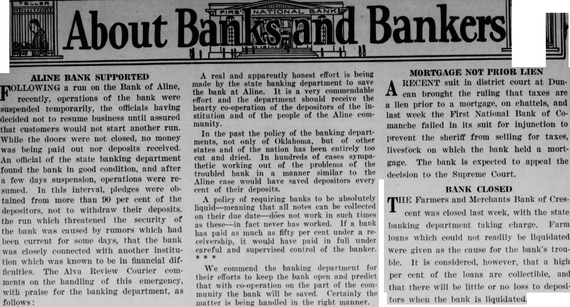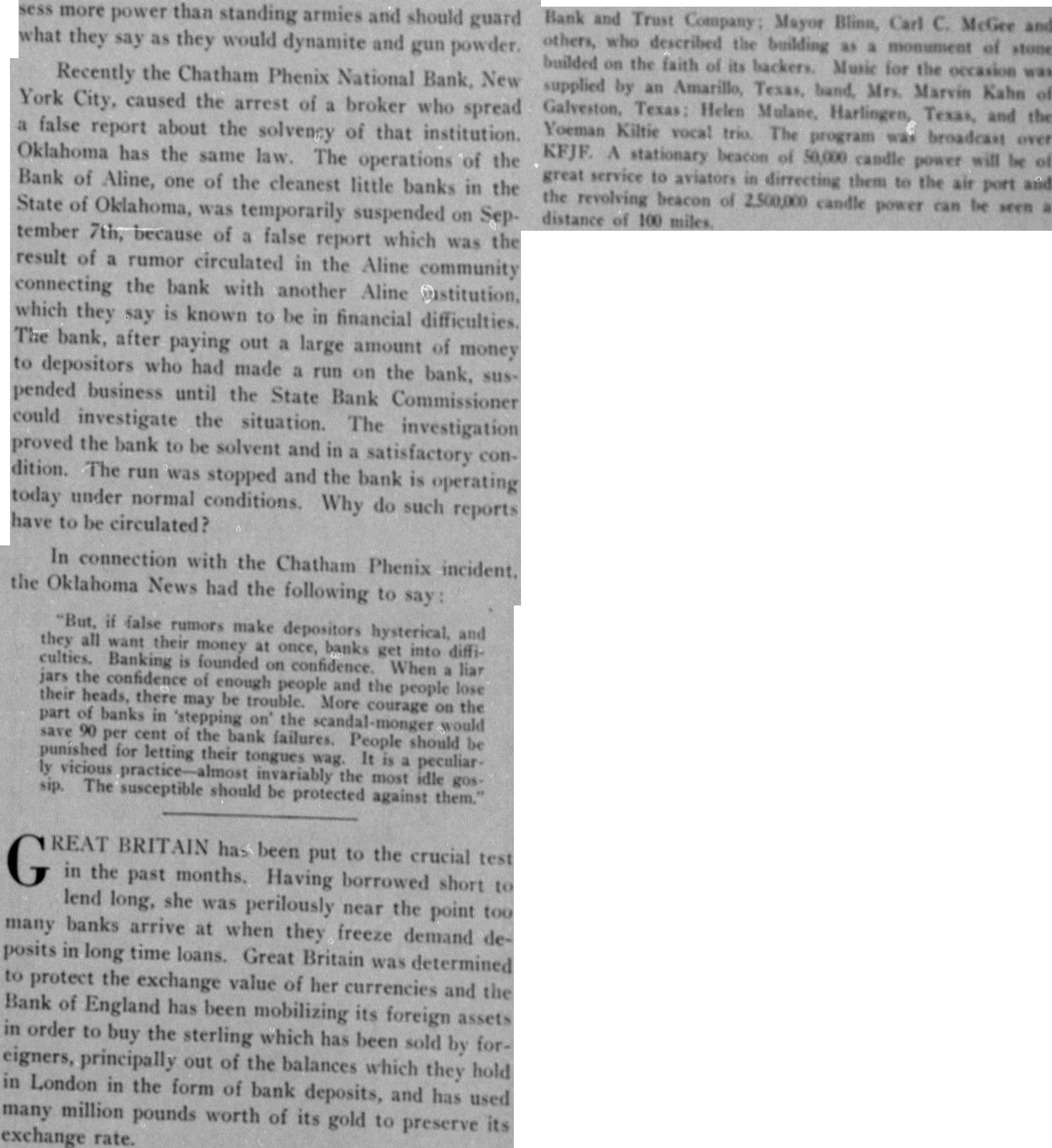 sess more power than standing armies and should guard what they say as they would dynamite and gun powder. Recently the Chatham Phenix National Bank, New York City, caused the arrest of a broker who spread a false report about the solvency of that institution. Oklahoma has the same law. The operations of the Bank of Aline, one of the cleanest little banks in the State of Oklahoma, was temporarily suspended on September 7th, because of a false report which was the result of a rumor circulated in the Aline community connecting the bank with another Aline @stitution, which they say is known to be in financial difficulties. The bank, after paying out a large amount of money to depositors who had made a run on the bank, suspended business until the State Bank Commissioner could investigate the situation. The investigation proved the bank to be solvent and in a satisfactory condition. The run was stopped and the bank is operating today under normal conditions. Why do such reports have to be circulated? In connection with the Chatham Phenix incident. the Oklahoma News had the following to say: "But, if false rumors make depositors hysterical, and they all want their money at once, banks get into difficulties. Banking is founded on confidence. When a liar jars the confidence of enough people and the people lose their heads, there may be trouble. More courage on the part of banks in 'stepping on' the scandal-monger would save 90 per cent of the bank failures. People should be punished for letting their tongues wag. It is a peculiarly vicious practice-almost invariably the most idle gossip. The susceptible should be protected against them." REAT BRITAIN has been put to the crucial test G in the past months. Having borrowed short to lend long, she was perilously near the point too many banks arrive at when they freeze demand deposits in long time loans. Great Britain was determined to protect the exchange value of her currencies and the Bank of England has been mobilizing its foreign assets in order to buy the sterling which has been sold by foreigners, principally out of the balances which they hold in London in the form of bank deposits, and has used many million pounds worth of its gold to preserve its exchange rate. Bank and Trust Company : Mayor Blinn, Carl C. McGee and others, who described the building as a monument of stone builded on the faith of its backers. Music for the occasion was supplied by an Amarillo, Texas, band, Mrs. Marvin Kahn of Galveston, Texas : Helen Mulane, Harlingen, Texas, and the Yoeman Kiltie vocal trio. The program was broadcast over KFJF. A stationary beacon of 50,000 candle power will be of great service to aviators in dirrecting them to the air port and the revolving beacon of 2,500,000 candle power can be seen a distance of 100 miles.
