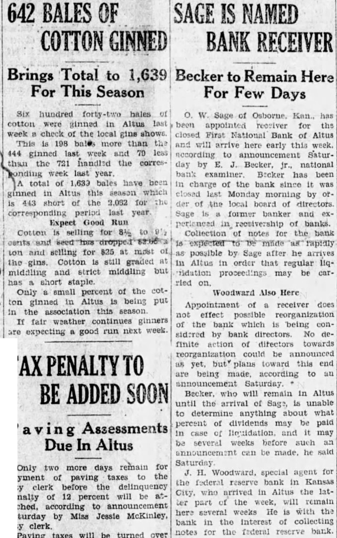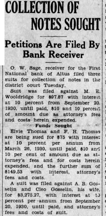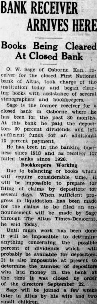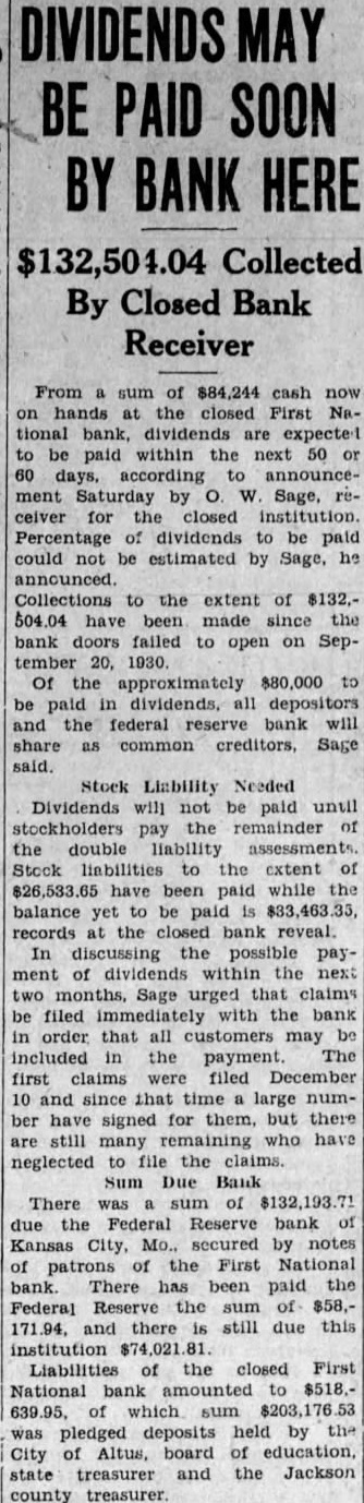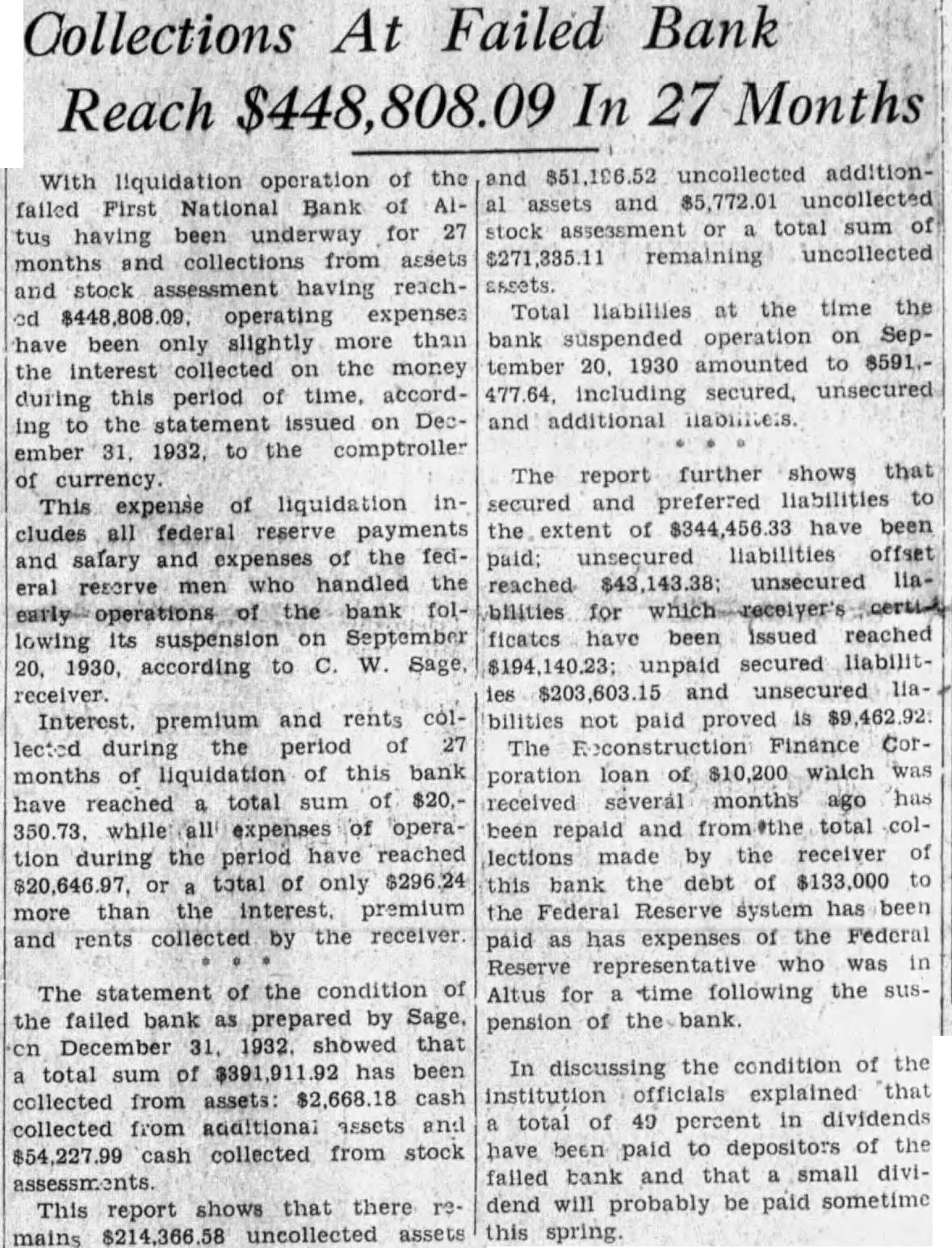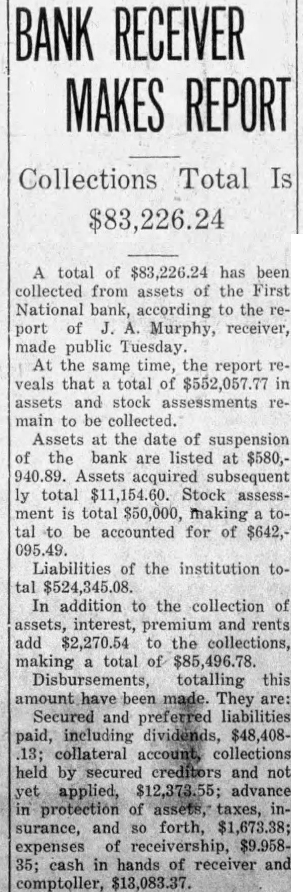 A total of $83,226.24 has been collected from assets of the First National bank, according to the report of J. A. Murphy, receiver, made public Tuesday. At the same time, the report reveals that total of $552,057.77 in assets and stock assessments remain to be collected. Assets at the date of suspension of the bank are listed at $580,940.89. Assets acquired subsequent ly total $11,154.60. Stock assessment is total $50,000, making total to be accounted for of $642,095.49. Liabilities of the institution total $524,345.08. In addition to the collection of assets, interest, premium and rents add $2,270.54 to the collections, making total of Disbursements, totalling this amount been made. They are: Secured and preferred liabilities paid, including dividends, 13; collateral account, collections held by secured creditors and not yet applied, $12,373.55; advance in protection of assets, taxes, insurance, and so forth, $1,673.38; expenses of receivership, $9.95835; cash in hands of receiver and comptoller, $13,083.37.