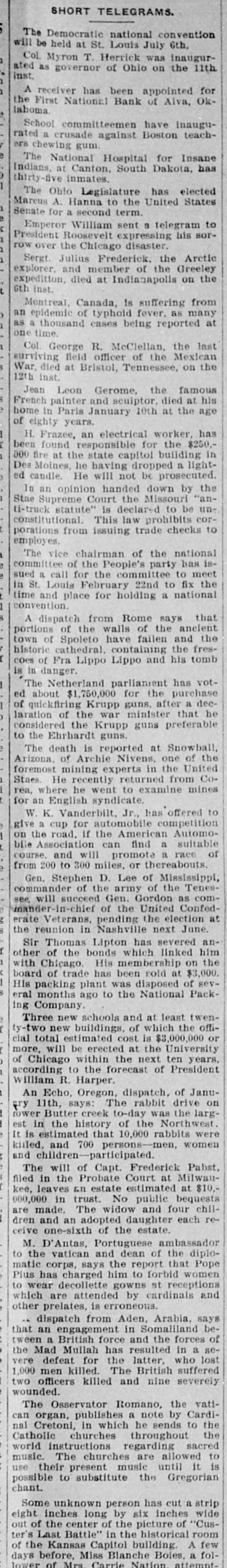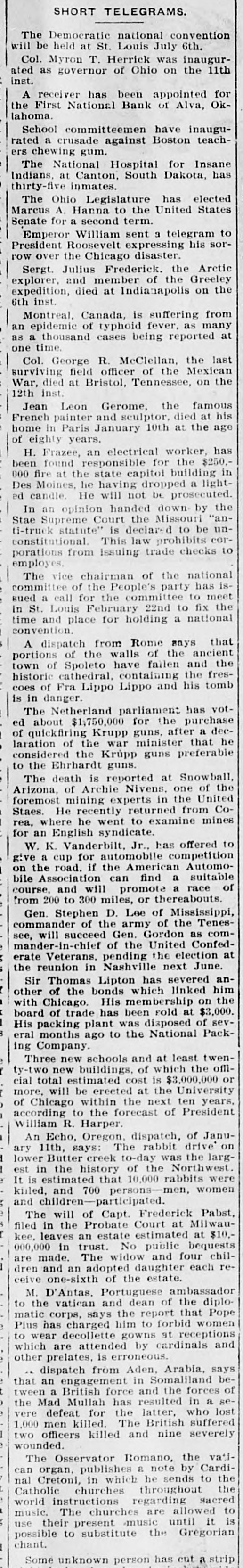 TELE SHORT convention The Democratic St. national Louis July 6th. inauguras governor will Col. be Myron held at T. Herrick of Ohio was on the 11th for appointed inst. ated A First receiver National has been Bank of Alva, inaugu- Okrated a crusade lahoma. the School committeemen against Boston have teachchewing gum. for Insane Indians. inmates. has ers The National at Canton, Hospital South Dakota, elected has thirty The five Ohio Legislature to the United States Marcus A. a Hanna second term. to telegram Senate Emperor for William sent expressing a his sorArctic President Roosevelt Chicago disaster. the row over the Frederick the Greeley expedition, explorer. Sergt. Julius and died membed at of on from the suffering 6th Canada, fever. a as Montreal. inst. of typhoid being is reported as many at last an epidemic thousand cases the time. R. McClellan. of the Mexican the War, 12th inst. the one surviving Col. died George field at Bristol, officer Tennessee, famous on Gerome. at his died French Paris Jean painter Leon January and sculptor, 10th at the age has of home eighty Frazee, in years. esponsible electrical for worker, building the $250. in H. found responsi state capitol dropped a light- uted. been 000 fire at the he having DE prosect the Des Moines. He will down by "aned candle. opinion handed not Missouri unIn an Court the to be corStae Supreme statute" is law checks to porations of the constitution ti-truck ional. issuing This trade national ishas employes. vice chairman People's D party to meet the committee The of for the the committee to fix Rued in St. a Louis call place February for holding a that from of the and the time convention. and walls Rome mays national ancient A dispatch of the have failen the fresof Fra is coes danger. has historic town portions of cathedral. Spoleto Lippo containing Lippo and his tomb votparliament purchase The in Netherland $1,750,000 for guns, the after that a dec- he laration the guns. of ed quickfriend about of Krupp Krupp war ministerpeferable guns Snowball considered the Ehrhardt reported at one of the to death is Nivens. in the United CoThe Archie experts from rea. where syndicate. Staes. foremost Arizona, He of mining recently he went returnamine to offered mines to on for an English Jr., competition Automo- suitable W. K. cup for American a of give the a road. sociation if the can promothereabouts. find a race to 300 of Tenesbile course. from Associa 200 Stephen and will miles, D. army Lee or of Mississippi, the as comGen. nder of the Gen. Gordon United Confed- at commande will of the the election see, n-chief pending next June. Veterans, severed mandom erate reunion in Lipton Nashville which has linked him an- the of the Sir Thomas of the bonds His mem membership Fold at on $3,000. sevChicago. been disposed eral board other His with packing months of trade plant ago has to was the National least Pack- twenCompany schools and which at the 000 offi- or the ing Three buildings. cost of is $3,000. University years. -two estimated erected at ten cial of ty-t more. Chicago total will to be within the forecast the next of President of JanuWilliam ccording R. Harper. Oregon. dispatch. rabbit drive larg- on Echo. The was the west. An 11th, says: creek to-day of the North were It is and 700 lower history women of Court at est and ary in estimated Butter the participrederick that dicipated. 10.000men. rabbits Milwau- Pabst. $10.The will the Probate Capt. estimated at bequests chilkee. leaves trust. and each refiled 000,000 in in an The estate widowughter No public four made. an adopted the estate. are and one-sixth Portuguese of of amba the bassador diploD'Antas. and dean report that the vatican says the to to wear dren matic ceive to M. corps. him for deceptions gt women Pope and Pius has decollette charged gowns by cardinals says prelates. from is Aden, omalland dispatch gement in and the in a that an engage British force has resulted who other which tween a are Mullah latter. forces suffered lost be- se- of Mad for the British severely vere the defeat killed. The and nine The he two Romano, 2 sends by to wounded 1,000 organ. officers men in killed throughout the sacred Cardi- vati the the to can regardingowed possible Catholic nal instructure are until it is music use their to substitute chant. world The present the Gregorian has cut a strip
