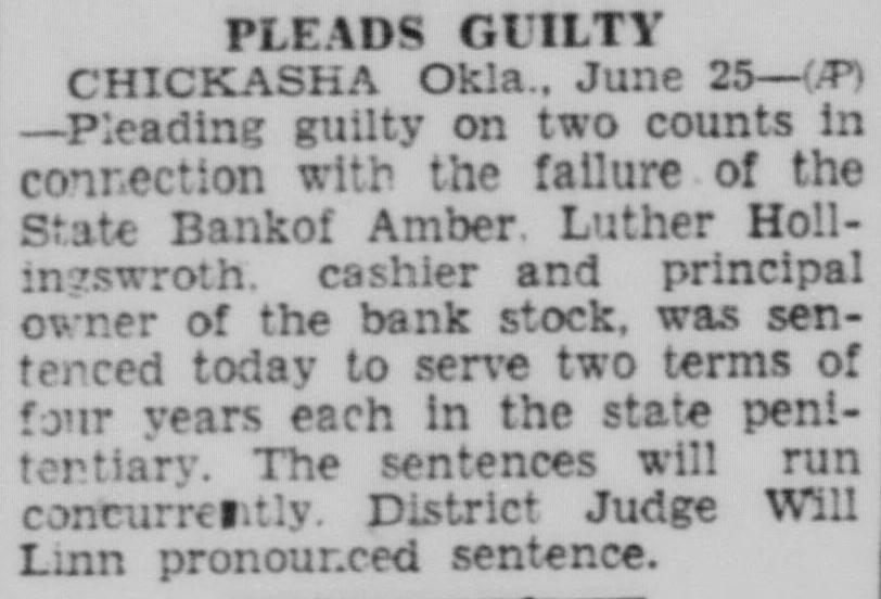 PLEADS GUILTY CHICKASHA Okla., June 25-(P) -Pleading guilty on two counts in connection with the failure of the State Bankof Amber. Luther Hollingswroth. cashier and principal owner of the bank stock, was sentenced today to serve two terms of four years each in the state penitentiary. The sentences will run concurrently. District Judge Will Linn pronounced sentence.