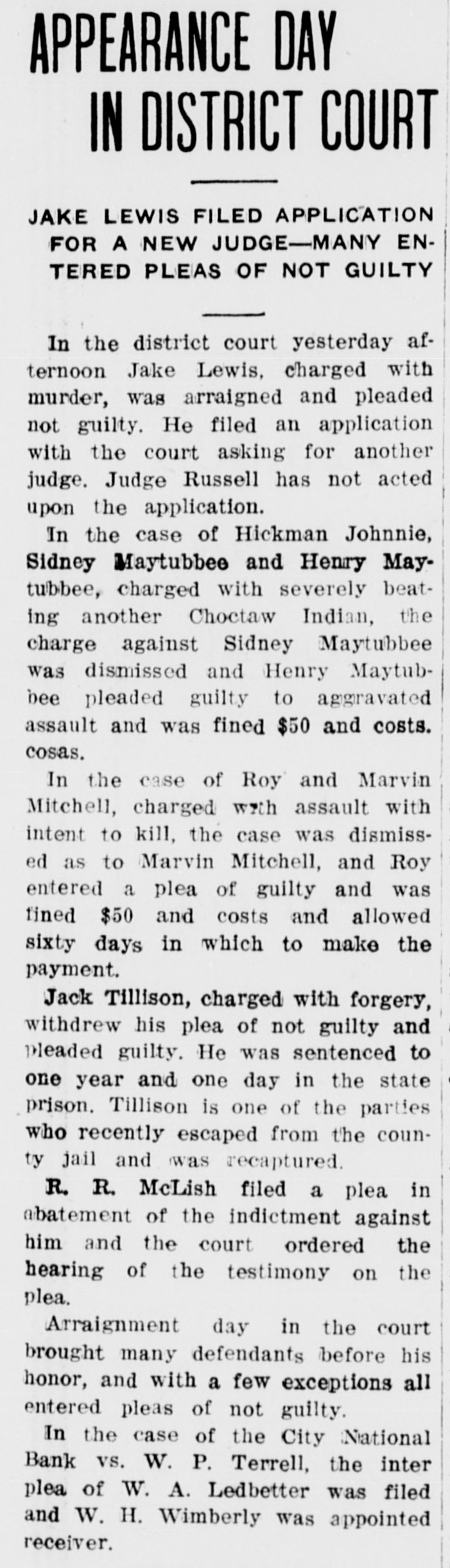 APPEARANCE DAY IN DISTRICT COURT JAKE LEWIS FILED APPLICATION FOR A NEW JUDGE-MANY ENTERED PLEAS OF NOT GUILTY In the district court yesterday afternoon Jake Lewis, charged with murder, was arraigned and pleaded not guilty. He filed an application with the court asking for another judge. Judge Russell has not acted upon the application. In the case of Hickman Johnnie, Sidney Maytubbee and Henry Maytubbee, charged with severely beating another Choctaw Indian, the charge against Sidney Maytubbee was dismissed and Henry Maytubbee pleaded guilty to aggravated assault and was fined $50 and costs. cosas. In the case of Roy and Marvin Mitchell, charged with assault with intent to kill, the case was dismissed as to Marvin Mitchell, and Roy entered a plea of guilty and was fined $50 and costs and allowed sixty days in which to make the payment. Jack Tillison, charged with forgery, withdrew his plea of not guilty and pleaded guilty. He was sentenced to one year and one day in the state prison. Tillison is one of the parties who recently escaped from the county jail and was recaptured. R. R. McLish filed a plea in abatement of the indictment against him and the court ordered the hearing of the testimony on the plea. Arraignment day in the court brought many defendants before his honor, and with a few exceptions all entered pleas of not guilty. In the case of the City National Bank vs. W. P. Terrell, the inter plea of W. A. Ledbetter was filed and W. H. Wimberly was appointed receiver.