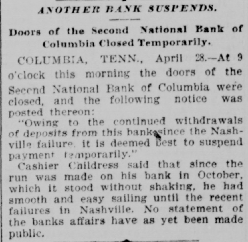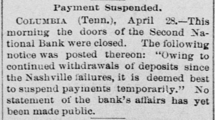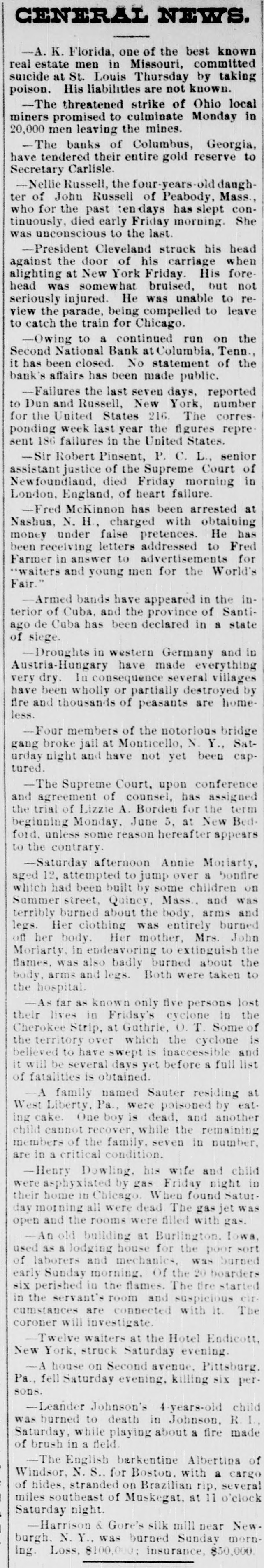 NEWS. -A. K. Florida, one of the best known real estate men in Missouri, committed suicide at St. Louis Thursday by taking poison. His liabilities are not known. -The threatened strike of Ohio local miners promised to culminate Monday in 20,000 men leaving the mines. -The banks of Columbus, Georgia, have tendered their entire gold reserve to Secretary Carlisle. -Nellie Russell, the four-years-old daughter of John Russell of Peabody, Mass., who for the past tendays has slept continuously, died early Friday morning. She ras unconscious to the last. -President Cleveland struck his head against the door of his carriage when alighting at New York Friday. His forehead was somewhat bruised, but not seriously injured. He was unable to review the parade, being compelled to leave to catch the train for Chicago. -Owing to a continued run on the Second National Bank Columbia, Tenn., it has been closed. No statement of the bank's affairs has been made public. -Failures the last seven days, reported to Dun and Russell, New York, number for the United States 216. The corresponding week last year the figures represent 186 failures in the United States. -Sir Robert Pinsent, P. C. L., senior assistant justice of the Supreme Court of Newfoundland, died Friday morning in London, England, of heart failure. -Fred McKinnon has been arrested at Nashua, N. H. charged with obtaining money under false pretences. He has been receiving letters addressed to Fred Farmer in answer to advertisements for "waiters and young men for the World's Fair." Armed bands have appeared in the interior of Cuba, and the province of Santiago de Cuba has been declared in a state of siege. -Droughts in western Germany and in Austria-Hungary have made everything very dry. In consequence several villages have been wholly or partially destroyed by fire and thousands of peasants are homeless. -Four members of the notorious bridge gang broke jail at Monticello, N. Y., Saturday night and have not yet been captured. -The Supreme Court, upon conference and agreement of counsel, has assigned the trial of Lizzie A. Borden for the term beginning Monday. June 5. at New Bed. ford. unless some reason hereafter appears to the contrary. -Saturday afternoon Annie Moriarty, aged 12, attempted to jump over a bonfire which had been built by some children on Summer street, Quincy, Mass. and was terribly burned about the body. arms and legs. Her clothing was entirely burned off her body. Her mother, Mrs. John Moriarty, in endeavoring to extinguish the flames, was also badly burned about the body, arms and legs. Both were taken to the hospital. -As far as known only five persons lost their lives in Friday's cyclone in the Cherokee Strip, at Guthrie, O. T. Some of the territory over which the cyclone is believed to have swept is inaccessible and it will be several days yet before a full list of fatalities is obtained. -A family named Sauter residing at West Liberty, Pa., were poisoned by eat. ing cake One boy is dead, and another child cannot recover, while the remaining members of the family. seven in number, are in a critical condition. -Henry Dowling, his wife and child were asphyxiated by gas Friday night in their home in Chicago. When found Saturday morning all were dead The gas jet was open and the rooms were filled with gas. An old building at Burlington. Iowa, used as a lodging house for the poor sort of laborers and mechanics, was burned early Sunday morning. Of the 20 boarders six perished in the flames. The the started in the servant's room and suspicious circumstances are connected with it. The coroner will investigate -Twelve waiters at the Hotel Endicott, New York, struck Saturday evening -A house on Second avenue, Pittsburg. Pa., fell Saturday evening. killing six perSODS. -Leander Johnson's 4 years-old child was burned to death in Johnson, R. I., Saturday, while playing about a fire made of brush in a field -The English barkentine Albertina of Windsor, N.S. for Boston. with a cargo of hides, stranded on Brazilian rip. several miles southeast of Muskegat, at 11 o'clock Saturday night. -Harrison & Gore's silk mill near New. burgh. N. Y., was burned Sunday morning. Loss, 8100,000; insurance, 850,000.