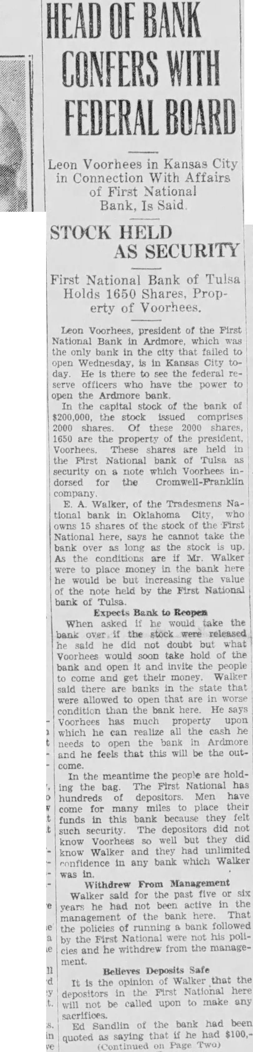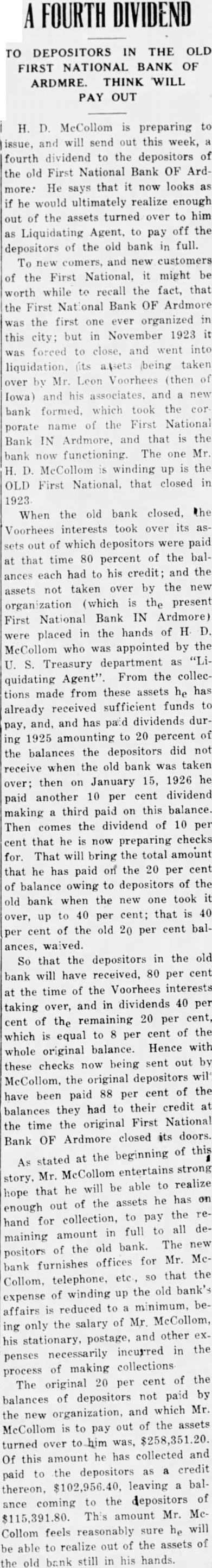 TO DEPOSITORS IN THE OLD NATIONAL BANK OF FIRST ARDMRE. THINK WILL PAY OUT H. McCollom is preparing to and will send out this week, dividend to the depositors of fourth the old First National Bank OF ArdHe that it now looks as more: says if he would ultimately realize enough out of the assets turned over to him as Liquidating Agent, to pay off the depositors of the old bank in full. To comers, and new customers National, it might be of the First worth while to recall the fact, that the First Bank OF Ardmore the first one ever organized in this city; but in November 1923 forced to close, and went liquidation. its alsets being taken by Mr. Leon Voorhees (then of Iowa) and his associates, and bank formed. which took the cor of the First National porate name Bank IN Ardmore, and that is the The one Mr. bank now McCollom winding up is the First National, that closed in 1923 When the old bank closed, the Voorhees interests took over its out of which depositors were paid at that time 80 percent of the balances each had to his credit; and the assets not taken over by the organization (which is the present First National Bank IN Ardmore) placed in the hands of H McCollom who was appointed by the U. Treasury department as quidating Agent". From the collections made from these assets he has already received sufficient funds to pay, and, and has dividends dur1925 amounting to 20 percent of the balances the depositors did not receive when the old bank was taken over; then on January 15, 1926 he paid another 10 per cent dividend making third paid on this balance. Then comes the dividend of 10 per cent that he is now preparing checks for. That will bring the total amount that he has paid on the 20 per cent of balance owing to depositors of the old bank when the new one took it over, up to 40 per cent; that is 40 per cent of the old 20 per cent balances, waived. So that the depositors in the old bank will have received. 80 per cent at the time of the Voorhees interests taking over, and in dividends 40 per cent of the remaining 20 per cent, which is equal to per cent of the whole original balance. Hence with these checks now being sent out by McCollom, the original depositors will have been paid 88 per cent of the balances they had to their credit at First National time the original the Bank OF Ardmore closed its doors. of the beginning stated at As strong entertains McCollom Mr. story, realize will be able to that he hope he has of the assets enough out the collection, to pay hand for full to all amount in maining bank. The the old of positors Mr. Mcoffices for bank furnishes that the so Collom, telephone, the old bank's of winding up expense reduced to minimum, affairs Mr McCollom, the salary of only and other his stationary, postage, incurred in necessarily penses process of making collections The original 20 per cent of the balances of depositors not paid by and which Mr. the new organization, of the assets is to out McCollom pay turned over was, Of this amount he has collected and credit to the depositors as paid balleaving thereon, of to the depositors ance coming Mr. McThis amount Collom feels reasonably sure he will be realize out of the assets of the old bank still in his hands.