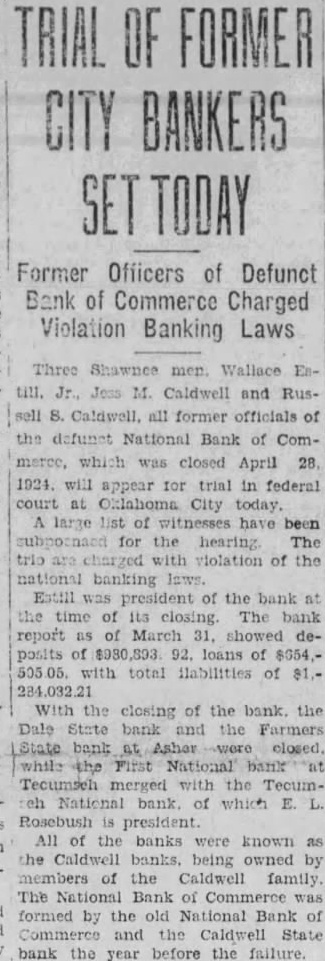 BANKERS Former Officers of Defunct Bank of Commerce Charged Violation Banking Laws Three Wallace Caldwell and RusCaldwell, all former officials of the National Bank of Comclosed April 1924. appear for trial in federal City of been for the hearing The violation of the national banking Estill was president of the bank time its closing. bank report March showed posits $980,893 92, loans of with total ilabilities of With the closing of the bank. the bank the Farmers State bank Asher closed. the First National Tecumsch merged with the TecumNational which Rosebush president. All the banks known the Caldwell banks. being owned by members the Caldwell family The Commerce formed by old National and Caldwell bank the year before the failure.