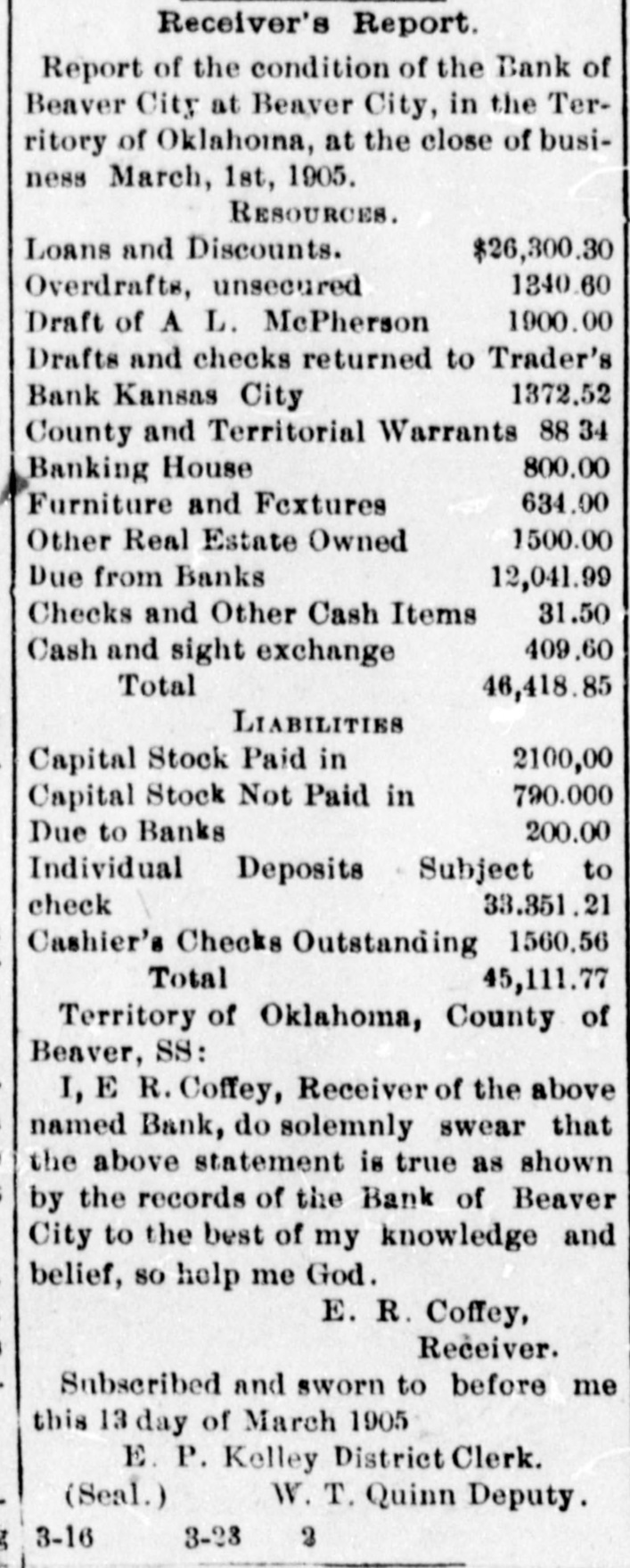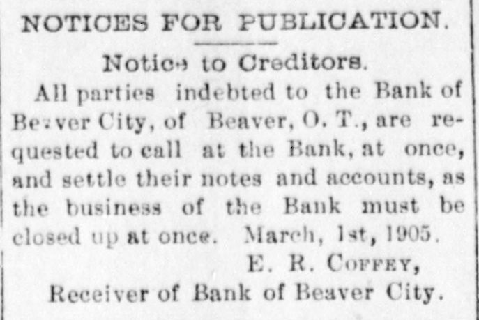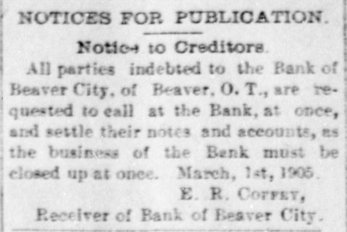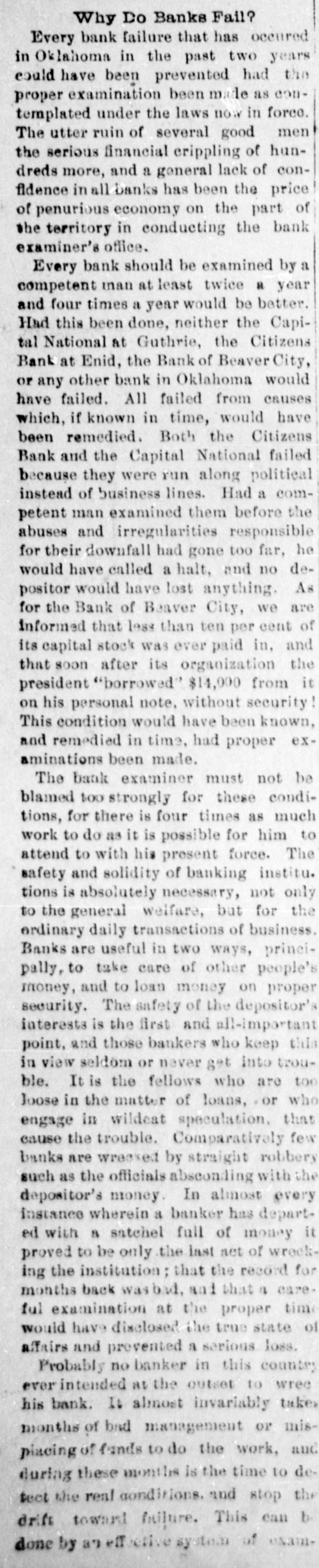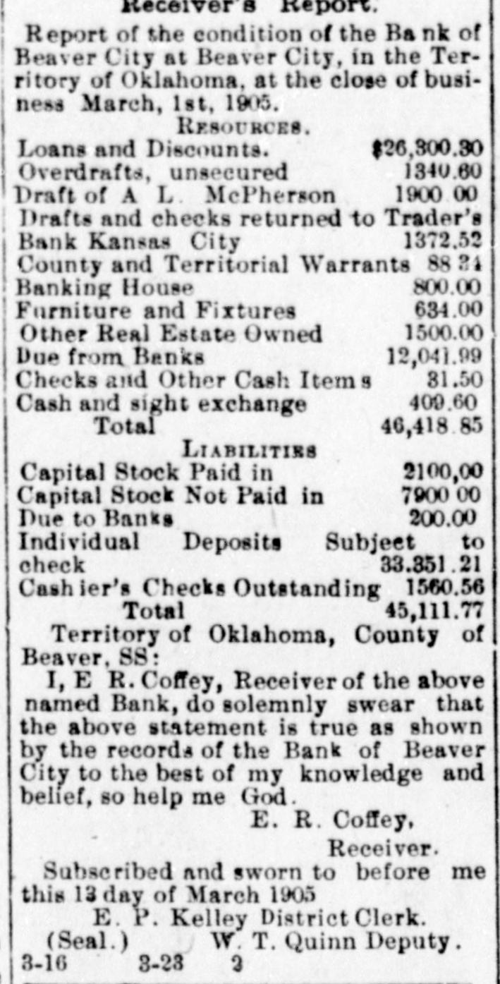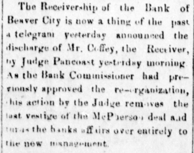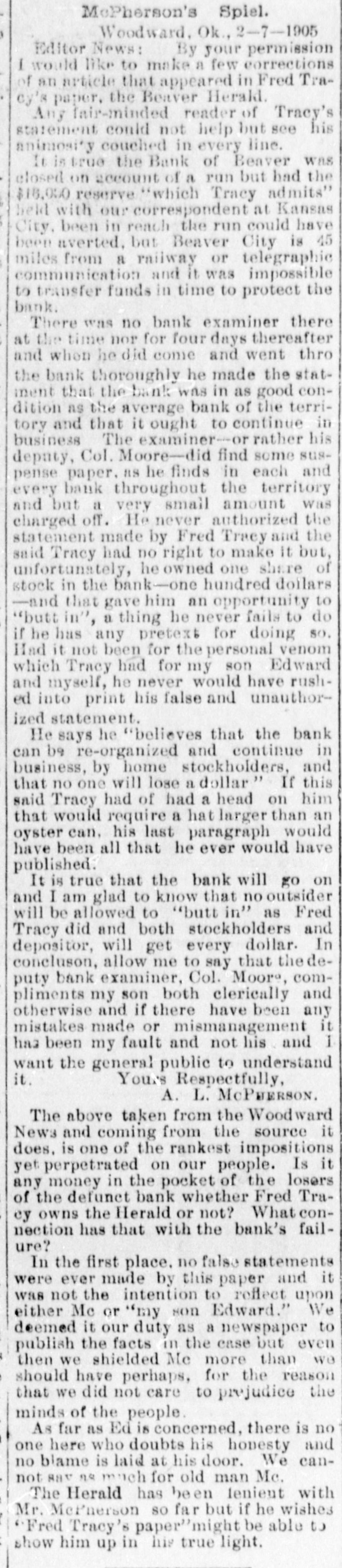cy's paper, the Beaver Herald. Ang fair-minded reader of Tracy's statement could not help but see his animosity couched in every line. It is true the Bank of Beaver was closed on account of a run but had the $18,000 reserve "which Tracy admits" held with our correspondent at Kansas City, been in reach the run could have been averted, but Beaver City is 45 miles from a railway or telegraphic communication and it was impossible to transfer funds in time to protect the bank. There was no bank examiner there at the time nor for four days thereafter and when he did come and went thro the bank thoroughly he made the statment that the bank was in as good condition as the average bank of the territory and that it ought to continue in business The examiner-or rather his deputy, Col. Moore-did find some suspense paper. as he finds in each and every bank throughout the territory and but a very small amount was charged off. He never authorized the statement made by Fred Tracy and the said Tracy had no right to make it but, unfortunately, he owned one share of stock in the bank-one hundred dollars -and that gave him an opportunity to "butt in", a thing he never fails to do if he has any pretext for doing so. Had it not been for the personal venom which Tracy had for my son Edward and myself, he never would have rushed into print his false and unauthorized statement. He says he "believes that the bank can be re-organized and continue in business, by home stockholders, and that no one will lose a dollar If this said Tracy had of had a head on him that would require a hat larger than an oyster can. his last paragraph would have been all that he ever would have published. It is true that the bank will go on and I am glad to know that no outsider will be allowed to "butt in" as Fred Tracy did and both stockholders and depositor, will get every dollar. In concluson, allow me to say that thedeputy bank examiner, Col. Moore, compliments my son both clerically and otherwise and if there have been any mistakes made or mismanagement it has been my fault and not his and 1 want the general public to understand it. Yours Respectfully, A. L. McPwerson. The above taken from the Woodward News and coming from the source it does, is one of the rankest impositions yet perpetrated on our people. Is it any money in the pocket of the losers of the defunct bank whether Fred Tracy owns the Herald or not? What connection has that with the bank's failure? In the first place. no false statements were ever made by this paper and it was not the intention to reflect upon either Mc or "my son Edward." We deemed it our duty as a newspaper to publish the facts in the case but even then we shielded Me more than we should have perhaps, for the reason that we did not care to prejudice the minds of the people. 1 As far as Ed is concerned, there is no one here who doubts his honesty and no blame is laid at his door. We cannot aay ne much for old man Mc.