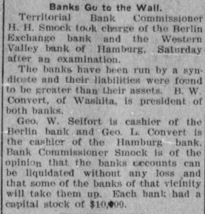 Banks Go to the Wall. Territorial Bank Commissioner H. H. Smock took charge of the Berlin Exchange bank and the Western Valley bank of Hamburg, Saturday after an examination. The banks have been run by a syndicute and their liabilities were found to be greater than their assets. B. W. Convert, of Washita, is president of both banks. Geo. W. Seifort is cashier of the Berlin bank and Geo. L. Convert is the cashier of the Hamburg bank. Bank Commissioner Smock is of the opinion that the banks accounts can be liquidated without any loss and that some of the banks of that vicinity will take them up. Each bank had a capital stock of $10,000.