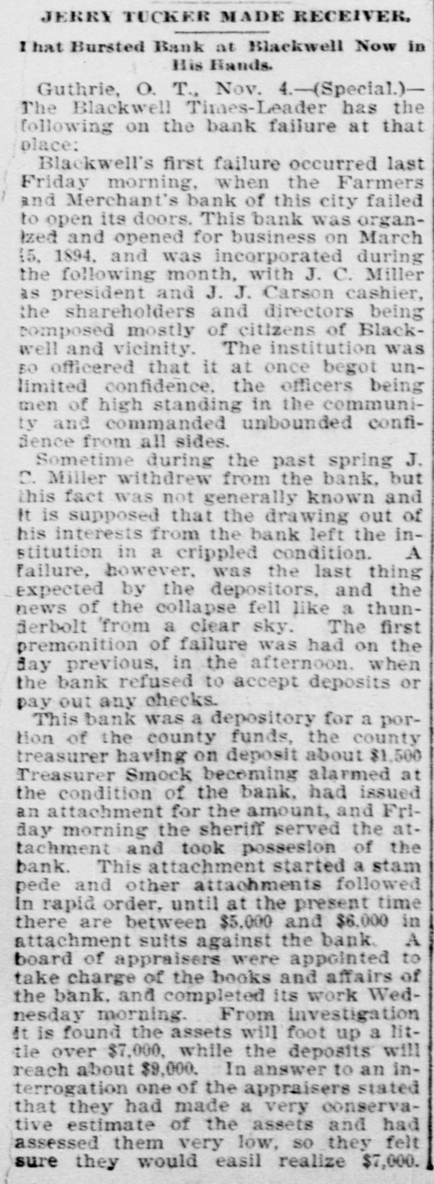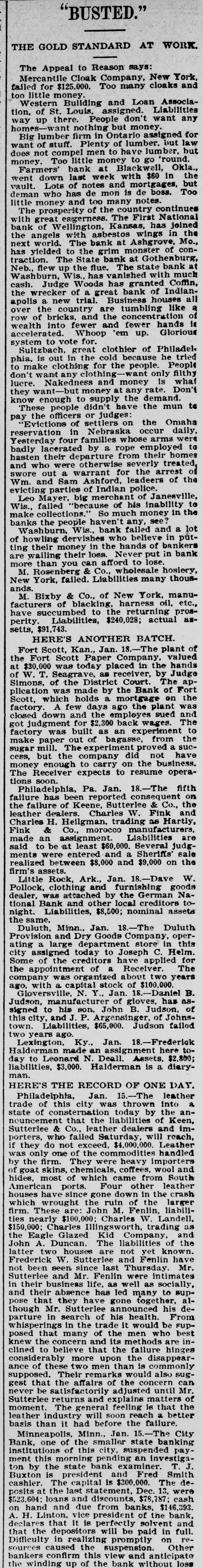 "BUSTED." THE GOLD STANDARD AT WORK. The Appeal to Reason says: Mercantile Cloak Company, New York, failed for $125,000. Too many cloaks and too little money. Western Building and Loan Association, of St. Louis, assigned. Liabilities way up there. People don't want any homes-want nothing but money. Big lumber firm in Ontario assigned for want of stuff. Plenty of lumber, but law does not compel men to have lumber, but money. Too little money to go 'round. Farmers' bank at Blackwell, Okla., went down last week with $60 in the vault. Lots of notes and mortgages, Too but deman who has de mon is de boss. little money and too many notes. The prosperity of the country continues with great eagerness. The First National bank of Wellington, Kansas, has joined the angels with asbestos wings in the next world. The bank at Ashgrove, Mo., has yielded to the grim monster of contraction. The State bank at Gothenburg, Neb., flew up the flue. The state bank at Washburn, Wis., has vanished with much cash. Judge Woods has granted Coffin, the wrecker of a great bank of Indianapolis a. new trial. Business houses all over the country are tumbling like a row of bricks, and the concentration of wealth into fewer and fewer hands is accelerated. Whoop em up. Glorious system to vote for. Sultzbach, great clothier of Philadel. phia, is out in the cold because he tried to make clothing for the people. People don't want any clothing want only filthy lucre. Nakedness and money is what they want-but money at any rate. Don't know enough to supply the demand. These people didn't have the mun to pay the officers or judges: Evictions of settlers on the Omaha reservation in Nebraska occur daily. Yesterday four families whose arms were badly lacerated by a rope employed to hasten their departure from their homes and who were otherwise severly treated, swore out a warrant for the arrest of Wm. and Sam Ashford, leadeers of the evicting parties of Indian police. Leo Mayer, big merchant of Janesville, Wis., failed 'because of his inability to make collections." So much money in the banks the people haven't any, see? Washburn, Wis., bank failed and a lot of howling dervishes who believe in putting their money in the hands of bankers are wailing their loss. Never put in bank more than you can afford to lose. M. Rosenberg & Co., wholesale hosiery, New York, failed. Liabilities many thousands. M. Bixby & Co., of New York, manufacturers of blacking, harness oil, etc., have succumbed to the returning prosperity. Liabilities, $240,028; actual assetts, $91,743. HERE'S ANOTHER BATCH. Fort Scott, Kan., Jan. 18.-The plant of the Fort Scott Paper Company, valued at $30,000 was today placed in the hands of W. T. Seagrave, as receiver, by Judge Simons, of the District Court. The application was made by the Bank of Fort Scott, which holds a mortgage on the factory. A few days ago the plant was closed down and the employes sued and got judgment for $2,300 back wages. The factory was built as an experiment to make paper out of bagasse, from the sugar mill. The experiment proved a success, but the company did not have money enough to carry on the business. The Receiver expects to resume operations soon. Philadelphia, Pa. Jan. 18.-The fifth failure has been reported consequent on the failure of Keene, Sutterlee & Co., the leather dealers. Charles W. Fink and Charles H. Heilgman, trading as Hartly, Fink & Co., morocco manufacturers, made an assignment. Liabilities are said to be at least $60,000. Several judgments were entered and a Sheriffs' sale realized between $8,000 and $9,000 on the firm's assets. Little Rock, Ark., Jan. 18.-Dave W. Pollock, clothing and furnishing goods dealer, was attached by the German National Bank and other local creditors tonight. Liabilities, $8,500; nominal assets the same. Duluth, Minn., Jan. 18.-The Duluth Provision and Dry Goods Company, operating a large department store in this city assigned today to Joseph C. Helm. Some of the creditors have applied for the appointment of a Receiver. The company was organized about two years ago, with a capital stock of $100,000. Gloversville, N. Y., Jan. 18.-Daniel B. Judson, manufacturer of gloves, has assigned to his son, John B. Judson, of this city, and J. P. Argensinger, of Johnstown. Liabilities, $65,000. Judson failed two years ago. Lexington, Ky., Jan. 18.-Frederick Halderman made an assignment here today to Leonard N. Deall. Assets, $2,800; liabilities, $3,000. Halderman is a diaryman. HERE'S THE RECORD OF ONE DAY. Philadelphia, Jan. 15.-The leather a trade of this city was thrown into state of consternation today by the announcement that the liabilities of Keen, Sutterlee & Co., leather dealers and Importers, who failed Saturday, will reach, if they do not exceed, $4,000,000. Leather was only one of the commodities handled by the firm. They were heavy importers of goat skins, chemicals, coffees, wool and hides, most of which came from South American ports. Four other leather houses have since gone down in the crash which wrought the ruin of the larger firm. These are: John M. Fenlin, liabilities nearly $100,000; Charles W. Landell, $150,000; Charles Illingsworth, trading as the Eagle Glazed Kid Company, and John A. Duncan. The liabilities of the latter two houses are not yet known. Frederick W. Sutterlee and Fenlin have not been seen since last Thursday. Mr. Sutterlee and Mr. Fenlin were intimates in their business life, as well as socially, and their absence has led many to suppose that they have gone together, although Mr. Sutterlee announced his departure in search of his health. From whisperings in the trade it would be supposed that many of the men who best knew the concern and its methods are inclined to believe that the failure hinges considerably more upon the disappearance of these two men than is commonly
