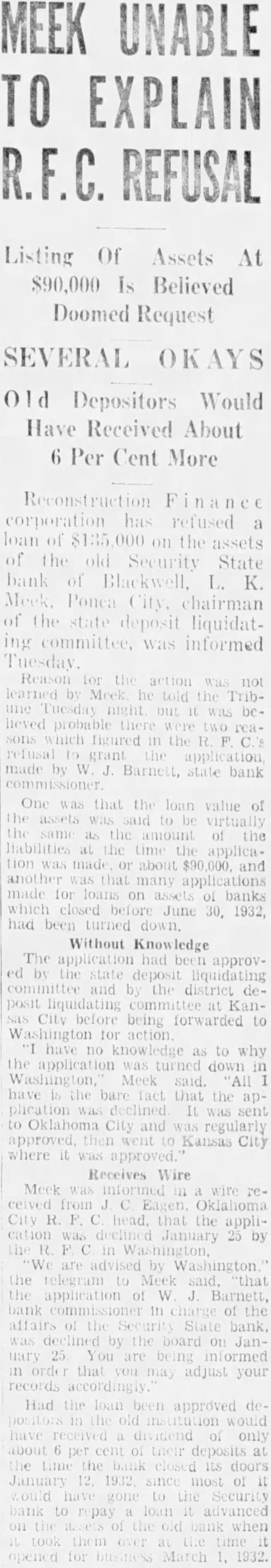 MEEK UNABLE TO EXPLAIN R.F.C. REFUSAL Listing Of Assets At $90,000 Is Believed Doomed Request SEVERAL OKAYS Old Depositors Would Have Received About 6 Per Cent More Reconstruction Finance corporation has refused a loan of $135,000 on the assets of the old Security State bank of Blackwell, L. K. of he state deposit liquidating committee. was informed Tuesday Reason for the action was not learned he Tribout it lieved probable were two reasons which figured in the F. refusal grant applic ation, made W.J. Barnett, state bank One that the loan value of assets virtually the same as the mount of the tion made about $90,000. and another that many applications made for loans on assets of banks which closed June 1932, had been turned down. Without Knowledge The approved by the state deposit committee and district posit liquidating committee at KanCity before being forwarded to