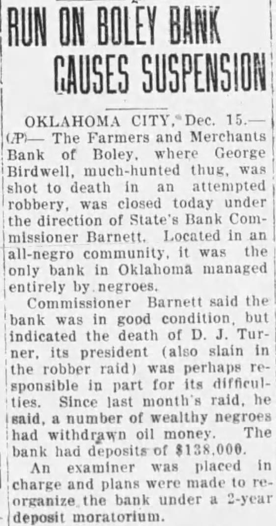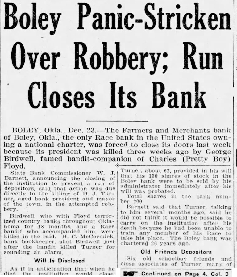 BOLEY, Okla., Dec. 23.-The Farmers and Merchants bank of Boley, Okla., the only Race bank in the United States owning a national charter, was forced to close its doors last week because its president was killed three weeks ago by George Birdwell, famed bandit-companion of Charles (Pretty Boy)