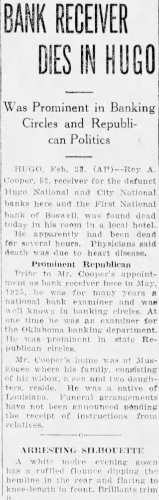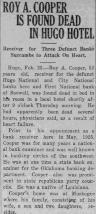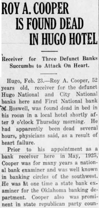 ROY A. COOPER IS FOUND DEAD IN HUGO HOTEL Receiver for Three Defunct Banks Succumbs to Attack On Heart. Hugo, Feb. 23.-Roy A. Cooper, 52 years old, receiver for the defunct Hugo National and City National banks here and First National bank of Boswell, was found dead in bed in his room in a local hotel shortly after 9 o'clock Thursday morning. He had apparently been dead several hours, physicians said, as a result of heart failure. Prior to his appointment as a bank receiver here in May, 1925, Cooper was for many years a national bank examiner and was well known in banking circles of the southwest. He was at one time a state bank examiner for the Oklahoma banking department. Cooper also was prominent in state republican party coun-