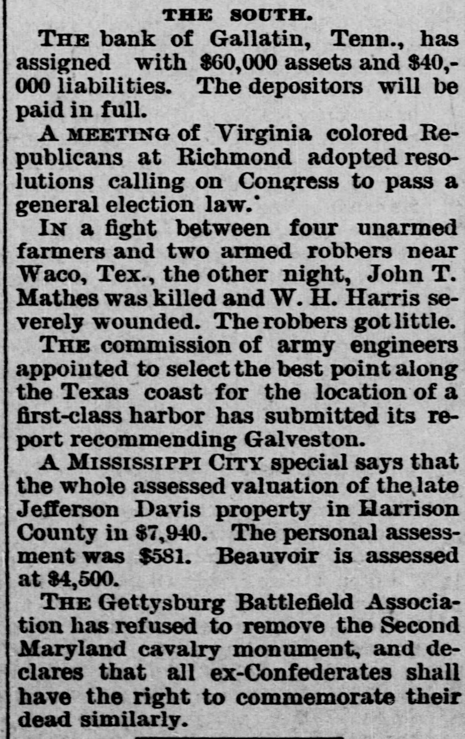 "ISMM SHE JOHN GALLAGHER died at his home in Butte, Mont., recently from the effects of injuries received in a brutal prize fight with G. H. Warte. B. M. CHAMBERS, who shot and killed Lawyer Frank J. Bowman, has JO uns the up neq uo released been $50,000. THE Cronin trial ended at Chicago on the 16th. Coughlin, O'Sullivan and Burke were sentenced to life imprisonment, Kunze to three years, while Beggs was acquitted. THE United States livery stable at Trinidad, Col., was destroyed by fire the other night and forty horses perished. Loss, $25,000. ROBERT S. DALTON was instantly killed and frightfully burned by the current from two electriclight wires on the Lake Shore railway's train shed at O Tolled THREE men were blown to pieces in the Osceola mine near Calumet, Mich., recently by the premature explosion of blast B THE Ohio Supreme Court has decided that the biennial elections amendment to the State Constitution was not legally adopted. Two brothers were blown to pieces in the Cleveland mine near Ishpeming, Mich., the other morning by the delayed explosion of a charge of dynamite. THE capital stock of the Omaha Street Railway Company has been increased to $5,000,000. THE warm, unseasonable weather is said to have been instrumental in closing up two clothing establishments at Minneapolis, Minn. One was the large Rothchilds clothing house, the other J. B. McCristle's merchant tailor store. A FREIGHT train on the Denver & Rio Grande road broke into three parts on a heavy grade near Walsenberg, Col., the other night and in the collision which followed the engineer and fireman were killed and seven cars wrecked. PRATT COUNTY, Kan., voted the $100,000 sugar bonds, notwithstanding the recent scandals. SEVERAL more arrests have been made in Salt Lake City in connection with the recent developments before the grand jury. All gave bonds. WILLIAM S. HARRISON, nephew of the President and assistant to the Chicago, Milwaukee & St. Paul general freight agent died at River Forest, Ill., recently, aged twenty-five. GEORGE CLARK, aged nine years, was run over by a cable car and killed at Sioux City, Iowa, the other morning while on his way to school. INVESTIGATION of two years of the accounts of the suicide secretary of the Milwaukee school board shows a short$12,098 JO ese THE Grand Portage Indians of Minnesota who were in danger of starving have been relieved by the Government agent. THE Western States Railway Passenger Association was dissolved at a meeting of the general managers of the lines at Chicago on the 18th. THE Meade-Van Bokkelen Company, commission merchants, dealing in California fruits at Chicago, recently failed for $250,000. The assets were much less. Ex-CONGRESSMAN JOSEPH LYMAN, of Council Bluffs, Iowa, was stricken with paralysis while at his office. His chances of recovery were slight. By an explosion in a rolling mill at New Philadelphia, O., recently one man was killed, another badly hurt and part of the building wrecked. ONE of the last places reporting the Russian influenza is Kansas City. THE vinery, distillery and stock of liquors of the Fresno (Cal.) Vineyard Company have been seized for alleged violation of the internal revenue laws. The property is valued at $500,000. CULVER, the recalcitrant Cronin juror, has brought suit against the Chicago Herald for $25,000 damages for libel. -0.1 e Supmp accident avs V hearsal of a Christmas entertainment at the Tilden public school, Detroit, Mich. The gauze clothing of a number of girls became ignited and eight or nine were burned, one fatally. THE Prohibitory law has passed both houses of the North Dakota Legislature. THE Guernsey-Scudder Furniture Company's building at Third and Locust, St. Louis, burned recently. The loss was heavy. JUDGE BREWER, in the United States Court at Kansas City, decided adversely to the Beales claim to the Maxwell land grant of 60,000,000 acres in New Mexico, etc. It was said an appeal would be taken to the Supreme Court. The decision affects a Kansas City land company that bought the Beales claim. 'HLNOS THE THE bank of Gallatin, Tenn., has assigned with $60,000 assets and $40,000 liabilities. The depositors will be paid in full. Virginia de
