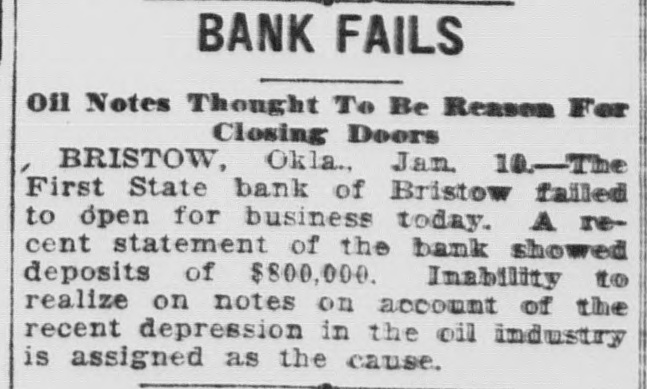 BANK FAILS Oil Notes Thought To Be Reason For Closing Doors BRISTOW, Okla.. Jan. 10.-The First State bank of Bristow failed to open for business today. A recent statement of the bank showed deposits of $800,000. Inability to realize on notes on account of the recent depression in the oil industry is assigned as the cause.
