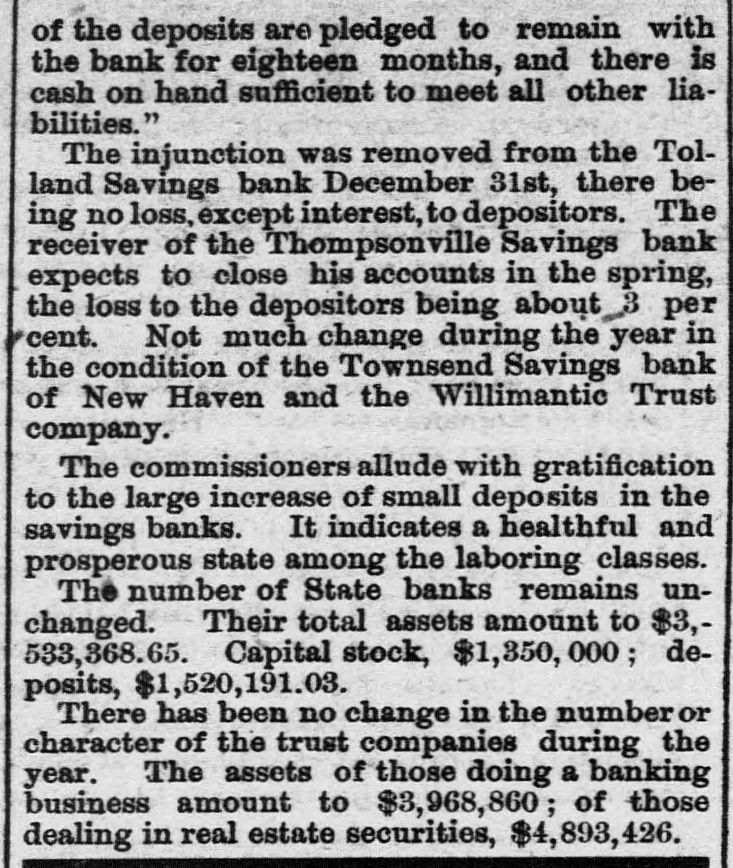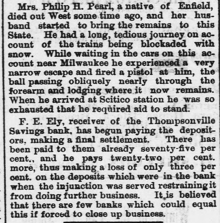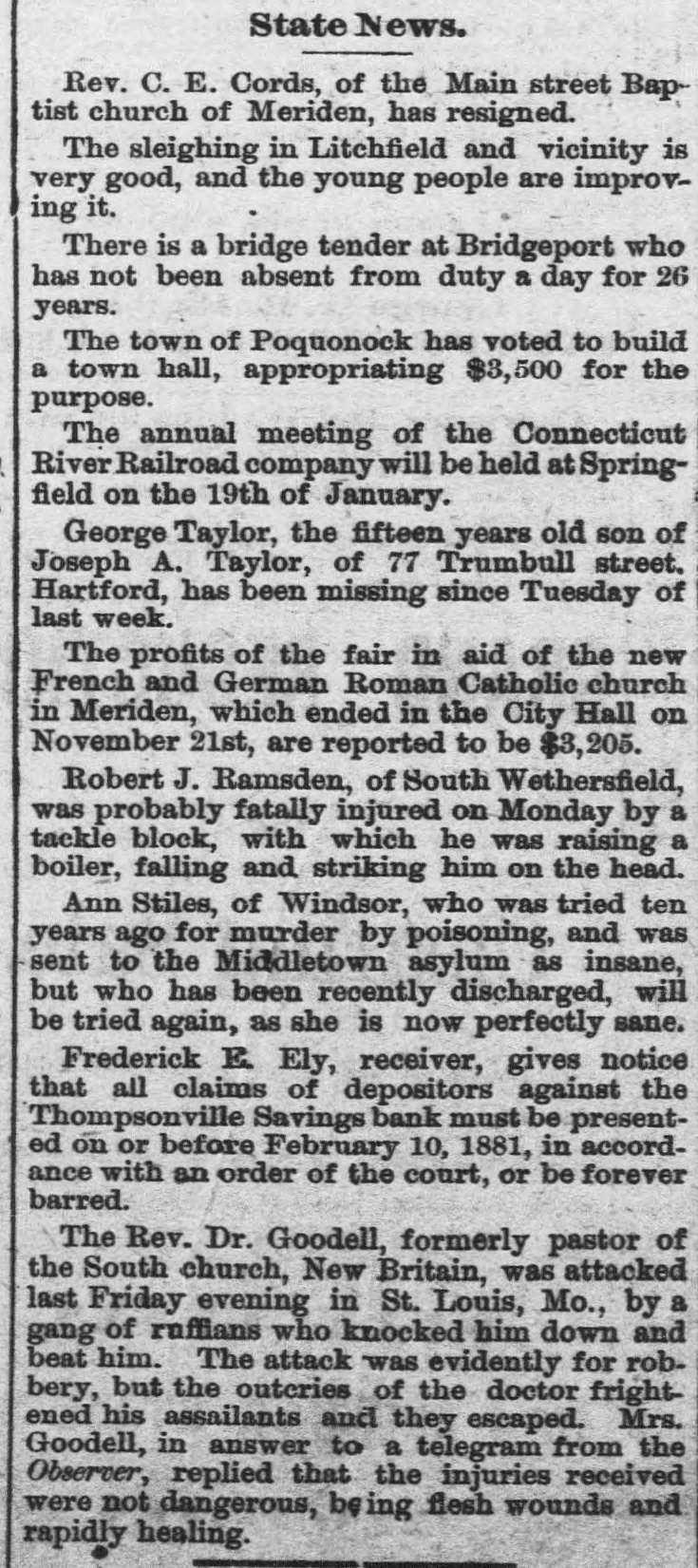 State News. Rev. C. E. Cords, of the Main street Bap~ tist church of Meriden, has resigned. The sleighing in Litchfield and vicinity is very good, and the young people are improving it. There is a bridge tender at Bridgeport who has not been absent from duty a day for 26 years. The town of Poquonock has voted to build a town hall, appropriating $3,500 for the purpose. The annual meeting of the Connecticut River Railroad company will be held at Springfield on the 19th of January. George Taylor, the fifteen years old son of Joseph A. Taylor, of 77 Trumbull street. Hartford, has been missing since Tuesday of last week. The profits of the fair in aid of the new French and German Roman Catholic church in Meriden, which ended in the City Hall on November 21st, are reported to be $3,205. Robert J. Ramsden, of South Wethersfield, was probably fatally injured on Monday by a tackle block, with which he was raising a boiler, falling and striking him on the head. Ann Stiles, of Windsor, who was tried ten years ago for murder by poisoning, and was sent to the Middletown asylum as insane, but who has been recently discharged, will be tried again, as she is now perfectly sane. Frederick E Ely, receiver, gives notice that all claims of depositors against the Thompsonville Savings bank must be presented on or before February 10, 1881, in accordance with an order of the court, or be forever barred. The Rev. Dr. Goodell, formerly pastor of the South church, New Britain, was attacked last Friday evening in St. Louis, Mo., by a gang of ruffians who knocked him down and beat him. The attack was evidently for robbery, but the outeries of the doctor frightened his assailants and they escaped. Mrs. Goodell, in answer to a telegram from the Observer, replied that the injuries received were not dangerous, being flesh wounds and rapidly healing.