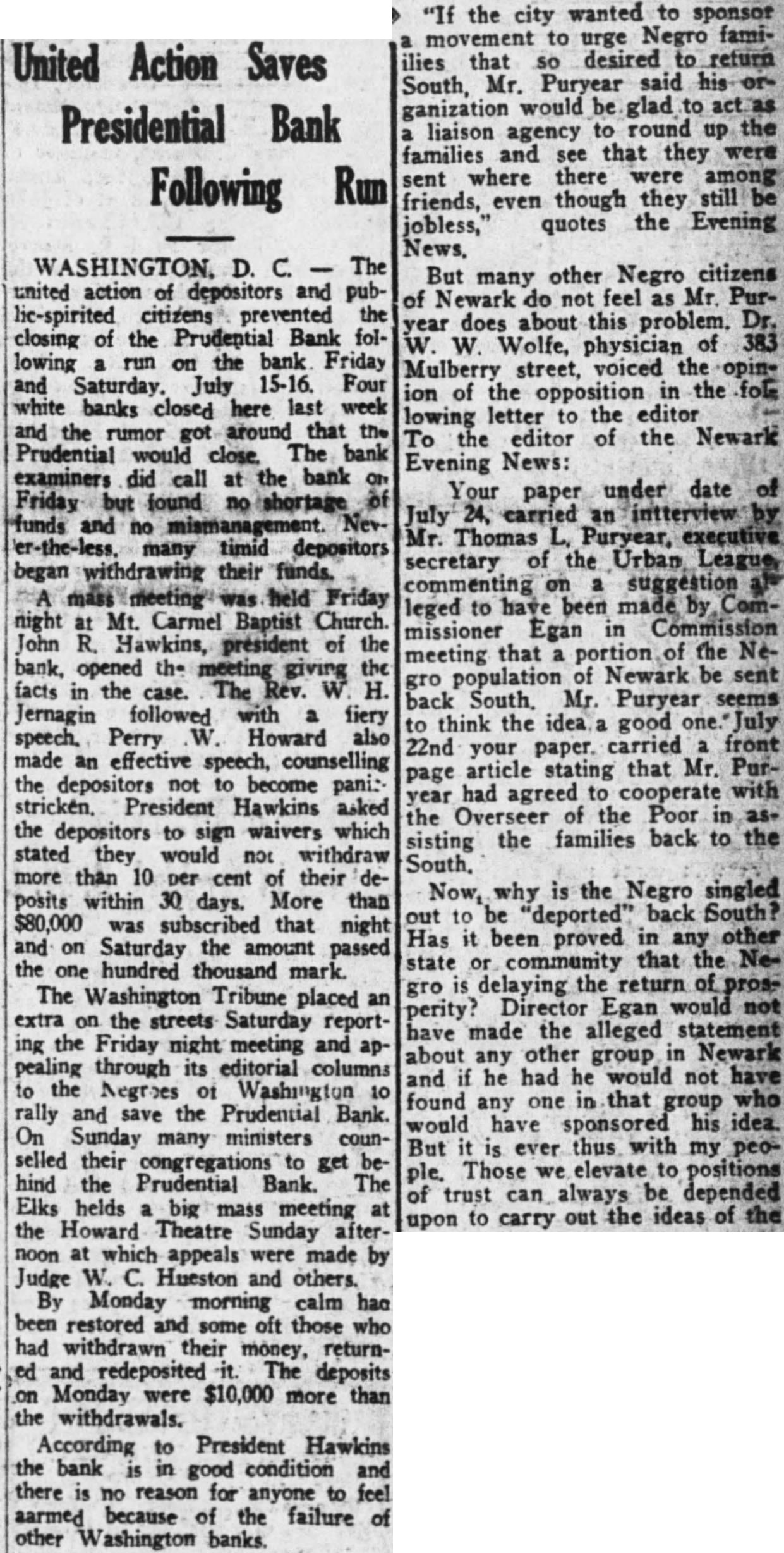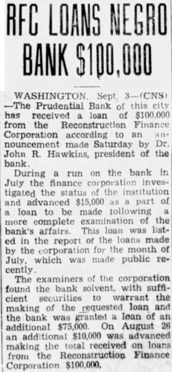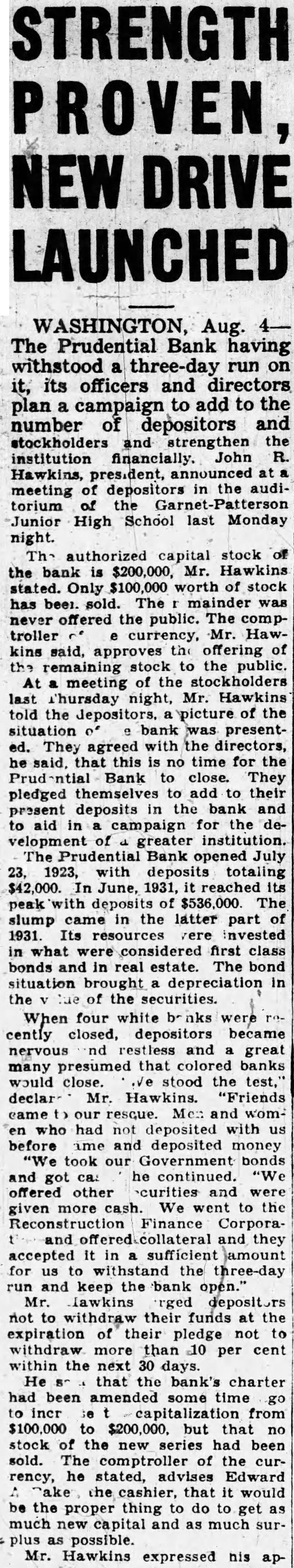 WASHINGTON, Aug. The Prudential Bank having withstood three-day run on it, its officers and directors plan a campaign to add to the number of depositors and stockholders and strengthen the institution financially. John R. Hawkins, president, announced meeting of in the auditorium Junior High School last Monday night. authorized capital stock the bank $200,000, Hawkins stated. Only $100,000 worth stock beer. The mainder never offered the public. The comptroller Mr. Hawkins said, approves the offering of the remaining stock to the public. At meeting of the stockholders last "hursday night, Mr. Hawkins told the picture of the situation bank was presented. They agreed with the directors, he said, that this time for the Bank close. They pledged to add to their present deposits the bank and aid in campaign for the deof greater The Bank opened July 23, 1923, deposits totaling $42,000. June, 1931, its peak $536,000 The slump came in the latter part of 1931. Its what considered first class bonds in real estate. The bond situation brought depreciation in the of the securities. When four white were cently closed, depositors became nervous nd restless and great many presumed that colored banks would close. stood the test," Mr. Hawkins. "Friends resque. and womwho had not with before time and deposited money "We took our Government bonds and he continued. "We got offered other curities were given more cash. We went to the Finance Corporaand they accepted sufficient amount for to withstand the run and keep bank open.' Mr. lawkins rged not to withdraw their furids the expiration their pledge not withdraw more than 10 per cent within the next days. He that bank's charter had been amended time incr from $100,000 $200,000. that no stock of the new series had been sold. The comptroller the currency, he stated, Edward cashier, that would the proper thing to do to get much capital and much surplus possible. Mr. Hawkins expressed his