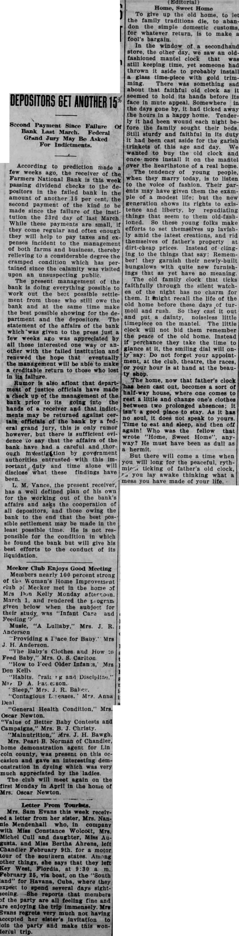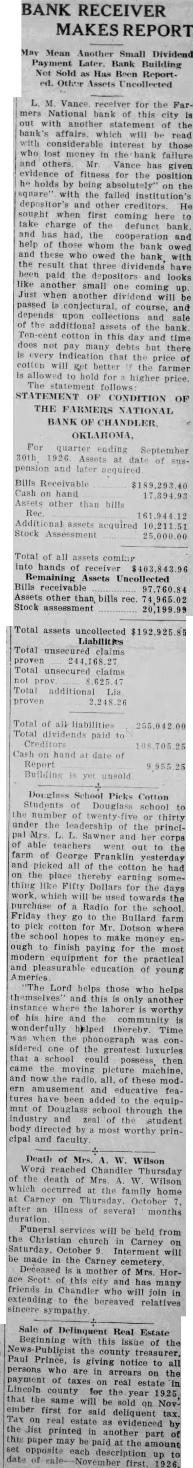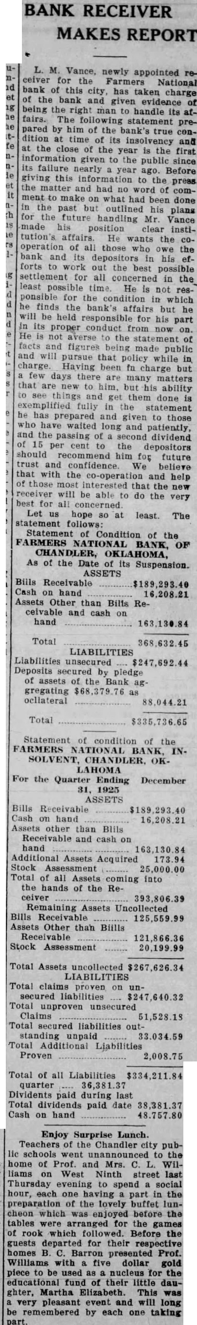 BANK RECEIVER REPORT Vance, newly appointed ceiver for the National bank of this city, has taken charge of bank and given evidence of being the right man to handle its affairs. The following statement pared by him of the bank's true dition at time of its insolvency and the close of the year the first information given to the public since its failure nearly year ago. Before giving this to the press the and had no of comment to make what had been done the past but outlined his plans for the future handling Mr. Vance made his position clear institution's affairs. He wants the operation of all those who owe the bank and depositors in his forts work out the best possible settlement for all in the least possible time. He not ponsible for the condition in which finds the bank's affairs but he be held responsible for his part its proper conduct from now He not averse the statement of facts and figures being made public and will pursue that policy while charge. Having been charge but few days there are many matters that new but his ability things and them get done is exemplified fully in the statement he has prepared and to those who waited long and patiently, and the passing of second dividend cent to the depositors should recommend him for future trust and We believe that with the co-operation and help those interested that the new receiver will be able to do the very best for all concerned. Let hope least. The statement follows: Statement Condition of the FARMERS NATIONAL BANK, OF CHANDLER, As of the Date of its Suspension. ASSETS Bills Receivable Cash hand Assets Other than Bills Receivable and cash on hand Total LIABILITIES Liabilities unsecured Deposits secured by pledge of assets the Bank gregating ocllateral 88,044.21 Total $335,736.65 Statement condition of the FARMERS INSOLVENT. OKLAHOMA For the Quarter Ending December 1925 ASSETS Bills Receivable $189,293.40 Cash hand 16,208.21 Assets other than Blils Receivable and hand 163,130.84 Additional Assets Acquired 173.94 Stock Assessment 25,000.00 Total of all Assets coming into the hands of the Receiver 393,806.39 Remaining Assets Uncollected Bills Receivable 125,559.99 Assets Other than Biills Receivable 121,866.36 Stock Assessment 20,199.99 Total Assets uncollected LIABILITIES Total claims proven unsecured liabilities Total unsecured unproven Claims Total secured liabilities outstanding unpaid 33.034.59 Total Additional Liabilities Proven 2,008.75 Total of all Liabilities quarter 36,381.37 Dividents paid during last Total dividends paid date 38,381.37 Cash on hand 48.757.80 Enjoy Surprise Lunch. Teachers of the Chandler city public schools went unannounced to the home of Prof. and Mrs. Williams West Ninth street last Thursday evening to spend social hour, each one part in the preparation of the lovely buffet luncheon which enjoyed before the tables were arranged for the games rook which followed. Before the guests departed for their respective homes Barron presented Prof. Williams with five dollar gold piece to be used nucleus for the educational fund of their little daughter, Martha Elizabeth. This was very pleasant event and will long remembered by each one taking
