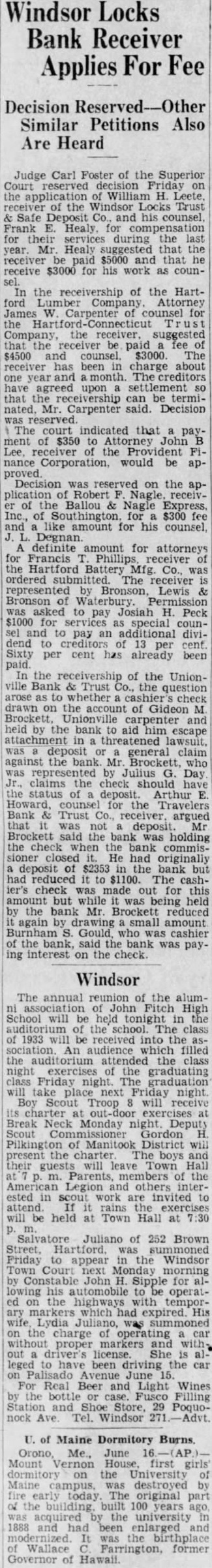 Windsor Locks Bank Receiver Applies For Fee Decision Similar Petitions Also Are Heard Judge Carl Foster of the Superior the William H. Trust Safe Deposit and counsel. Frank Healy. for for their services during the last Mr. Healy suggested that receiver receive $3000 for his work as coun- the receivership of the Hartford Company, receiver suggested receiver be paid $4500 has charge one agreed that the can be termiMr. Carpenter said Decision was reserved court indicated that ment of $350 receiver the Corporation, would be Decision reserved on the plication Robert receiv. of Ballou Nagle Express. of $300 amount for his Degnan definite amount for attorneys for Francis the Battery ordered receiver Lewis Bronson asked to Josiah Peck $1000 for to pay an diviper per cent has already the receivership of the Unionville Bank Trust Co., the question arose whether drawn on of Gideon held by the bank aid escape general against the Mr was Julius Day claims the check should status Arthur Howard, Travelers argued not holding the check commissioner He had originally deposit of $2353 bank had reduced $1100. The check was this held the bank Mr reduced again amount Gould the bank, said the was pay. ing interest on the check Windsor The annual reunion of the alumFitch High School will the 1933 into the audience which filled the auditorium attended class exercises of graduating night graduation Friday night Boy Troop Break Monday night Deputy Scout Gordon Pilkington of District will boys leave Town the Legion others ested in invited attend. rains will held at Town Hall at Juliano of 252 Brown Street, Friday appear Windsor Town Court Constable John Sipple for lowing his automobile operatthe highways with which had expired. His Lydia the charge proper and license leged have driving the car Palisado Avenue June For Real Beer and Light Wines the Filling Store 29 nock Ave Tel. Windsor of Maine Dormitory Burns Orono, Me., June Mount first the University Maine destroyed The original built 100 years the university and enlarged and the Wallace Farrington, former Governor of
