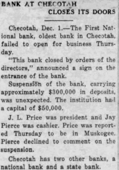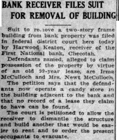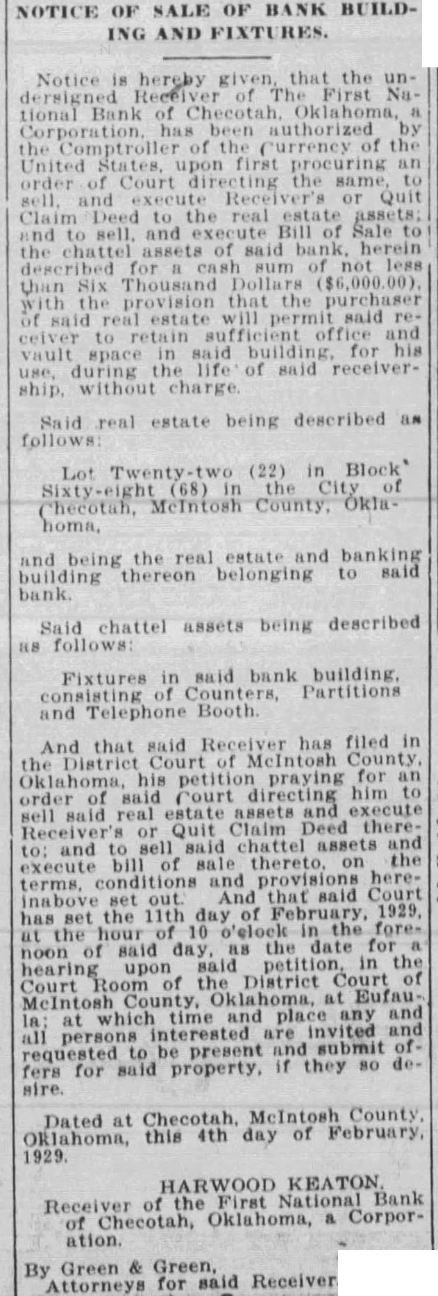 Notice is hereby given, that the undersigned Receiver The First Na. tional Bank of Checotah. Oklahoma, Corporation. has been authorized the Comptroller the Currency of the United States, upon first procuring an order Court directing the same, sell. and execute Receiver's or Quit Claim Deed to the real estate assets: and to sell. and execute Sale to the chattel assets of said bank, herein described for cash sum of not less than Six Thousand Dollars ($6,000.00) with the provision that the purchaser of said real estate will permit said receiver to retain sufficient office and vault space in said building. for his use, during the life of said receivership without charge