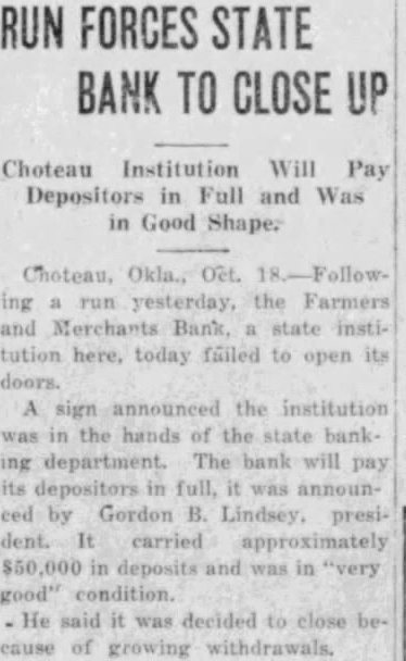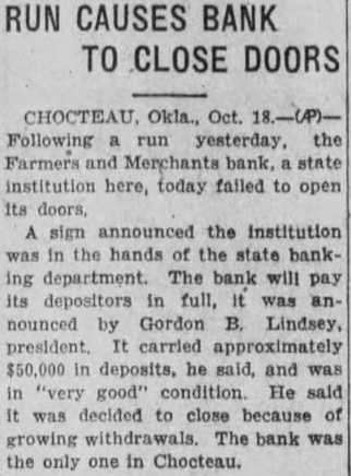 RUN CAUSES BANK TO CLOSE DOORS CHOCTEAU. Okla., Oct. Following a run yesterday. the Farmers and Merchants bank, state institution here, today failed to open its doors, A sign announced the Institution was in the hands of the state banking department. The bank will pay its depositors in full, It was announced by Gordon B. Lindsey, president. It carried approximately $50,000 in deposits, he said, and was in "very good" condition. He said it was decided to close because of growing withdrawals. The bank was the only one in Chocteau.