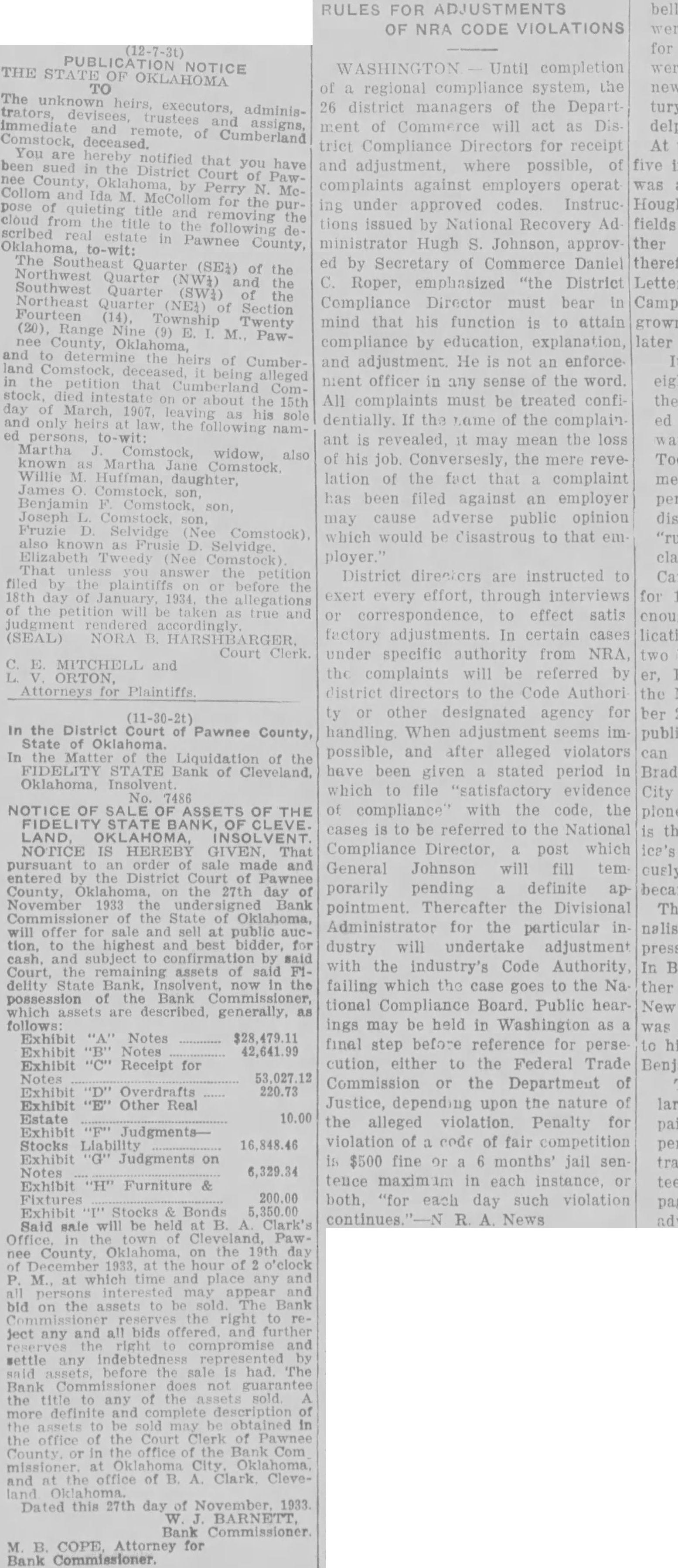 NOTICE THE TO The unknown heirs, administrators, devisees, trustees immediate and remote, of Cumberland Comstock, deceased. You notified that you have sued District Court McCollom Ida M. McCollom for the pose quieting title and removing the from the title scribed in Pawnee Oklahoma, County, to-wit: Northwest The Southeast Quarter Quarter (SE) of the Southwest Quarter the Northeast Quarter Section Fourteen nee (20) County Range Township M. Twenty PawOklahoma, and land to Comstock, heirs of Cumberstock, petition that being alleged the 15th day of and only law the his nampersons, to-wit: Martha Comstock, widow, also known Martha Jane Comstock Willie M Huffman, daughter, James Benjamin Comstock, son, Fruzie Selvidge also known as Frusie Selvidge That the filed by plaintiffs day the the petition will taken true rendered (SEAL) NORA Court Clerk. MITCHELL and ORTON, Attorneys Plaintiffs (11-30-2t) In the District of Court of Pawnee County, State Oklahoma. In Matter Liquidation of the FIDELITY STATE Bank of Cleveland, Oklahoma, 7486 NOTICE OF OF OF THE STATE BANK, OF CLEVE. LAND, OKLAHOMA, NOTICE IS HEREBY GIVEN That pursuant order made and entered the District Court County, Oklahoma, the 27th day November 1933 the Bank Commissioner the State Oklahoma, will offer for sale and public auction, to the highest and best cash, and by said Court, the remaining assets of said State now the possession of Bank which assets are described, generally, Exhibit "A" Notes Exhibit Notes Exhibit Receipt for Notes Exhibit Overdrafts 220.73 Exhibit Other Real Estate 10.00 Exhibit JudgmentsStocks 16,848.46 Exhibit "G" Judgments on Notes 6,329.34 Exhibit "H" Furniture & Fixtures Exhibit Stocks Bonds sale will be held Clark's Office, town Cleveland, PawCounty, the 19th day which time and place any may bid on the assets to Bank right ject any and bids and and compromise settle any indebtedness represented before the sale is had. The Bank Commissioner does not guarantee the title to any the assets sold more definite sold office of the Court Clerk Pawnee in Oklahoma missioner. and the office of Clark, CleveDated this 27th day November 1933. Bank Attorney for Bank Commissioner. RULES FOR ADJUSTMENTS OF NRA CODE VIOLATIONS WASHINGTON Until completion regional compliance system, the 26 district managers of the Depart of Commerce will act as Dis Compliance Directors for receipt and adjustment, where possible, of complaints against employers operat ing under approved codes Instruc tions issued by National Recovery Ad ministrator Hugh S. Johnson, approv ed by Secretary of Commerce Daniel Roper, emphasized "the District Compliance Director must bear in mind that his function is to attain compliance by education, explanation, and adjustment. He is not an enforce nient officer in any sense of the word. All complaints must be treated confidentially. If the name of the complain ant is revealed, it may mean the loss of his job. Conversesly the mere revelation the fact that complaint has been filed against an employer may cause adverse public opinion which would be disastrous to that em ployer. District directors are instructed to exert every effort, through interviews correspondence, to effect satis factory adjustments. In certain cases under specific authority from NRA the complaints will be referred by district directors to the Code Authori or other designated agency for handling. When adjustment seems im possible, and after alleged violators have been given stated period In which to "satisfactory evidence of compliance with the code, the cases is to be referred to the National Compliance Director, post which General Johnson will fill tem porarily pending definite ap pointment. Thereafter the Divisional Administrator for the particular in dustry will undertake adjustment with the industry's Code Authority, failing which the case goes to the Na tional Compliance Board. Public hearings may be held in Washington as final step before reference for perse cution, either to the Federal Trade Commission or the Department of Justice, depending upon the nature of the alleged violation. Penalty for violation of code of fair competition is $500 fine or months' jail sen tence in each instance, or both, "for each day such violation A. News