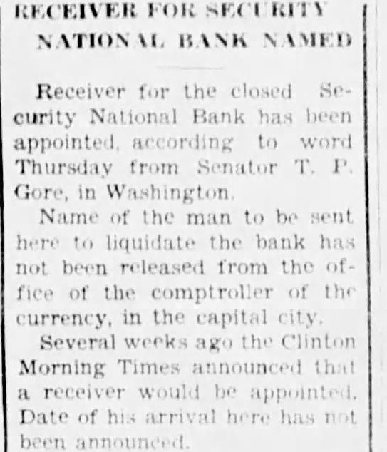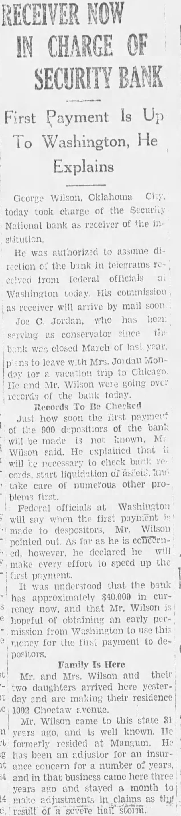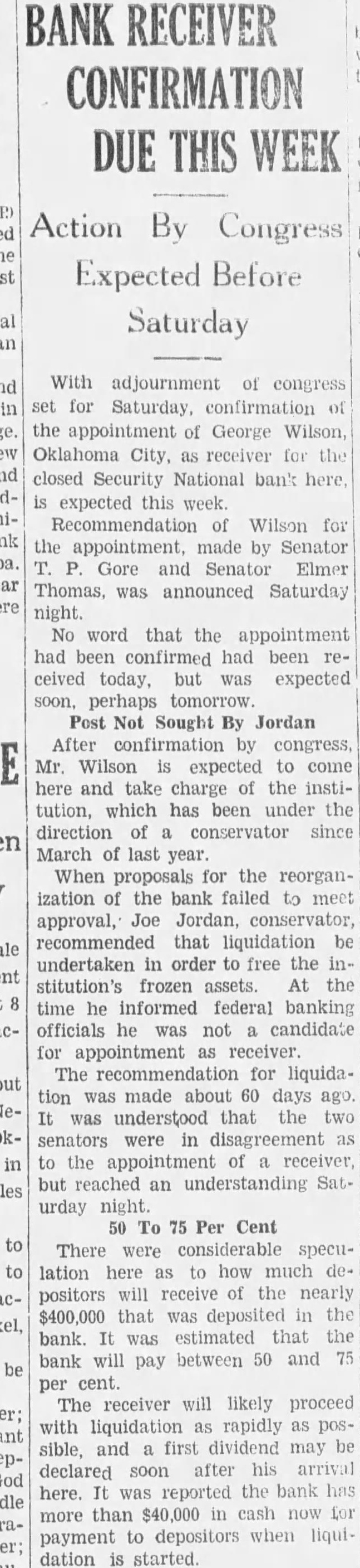 With adjournment of congress set for Saturday, confirmation the appointment of George Oklahoma City, receiver for closed Security National bank here expected this week. Recommendation of Wilson for the appointment, made by Senator Gore Senator Elmer Thomas, was announced Saturday night. No word that the appointment had been confirmed been ceived today, but was expected perhaps tomorrow Post Sought By Jordan After confirmation by congress, Mr. Wilson expected to here and take charge the institution, which has been under the direction of conservator since March last year. When proposals for the reorganization the bank failed to meet approval, Joe Jordan, conservator, recommended that liquidation undertaken order to free the stitution's frozen assets. At the time he informed federal banking officials he not candidate for appointment receiver. The recommendation for liquidation was made about days was understood that the two senators were in disagreement in the appointment of receiver, but reached an understanding urday night. To Per Cent