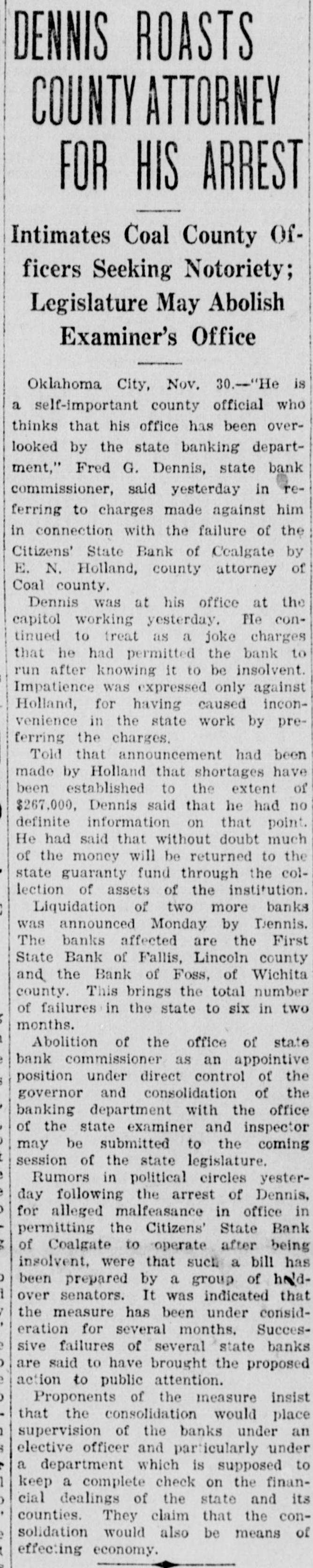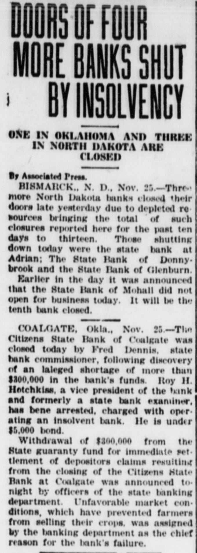 DOORS OF FOUR MORE BANKS SHUT BY INSOLVENCY ONE IN OKLAHOMA AND THREE IN NORTH DAKOTA ARE CLOSED By Associated Press. BISMARCK.. N. D., Nov. 25.-Three more North Dakota banks closed their doors late yesterday due to depleted re. sources bringing the total of such closures reported here for the past ten days to thirteen. Those shutting down today were the state bank at Adrian; The State Bank of Donnybrook and the State Bank of Glenburn. Earlier in the day it was announced that the State Bank of Mohall did not open for business today. It will be the tenth bank closed. COALGATE, Okla., Nov. 25.-The Citizens State Bank of Coalgate was closed today by Fred Dennis, state bank commissioner, following discovery of an laleged shortage of more than $300,000 in the bank's funds. Roy H. Hotchkiss, a vice president of the bank and formerly a state bank examiner, has bene arrested, charged with operating an insolvent bank. He is under $5,000 bond. Withdrawal of $300,000 from the State guaranty fund for immediate settlement of depositors claims resulting from the closing of the Citizens State Bank at Coalgate was announced to. night by officers of the state banking department. Unfavorable market conditions, which have prevented farmers from selling their crops, was assigned by the banking department as the chief reason for the bank's failure.