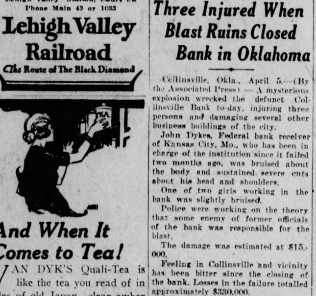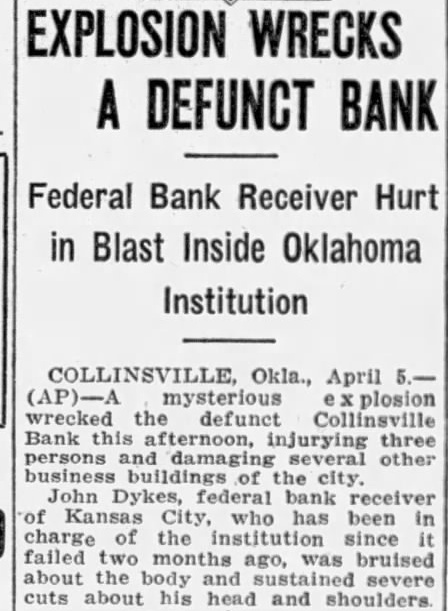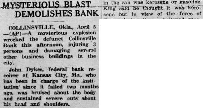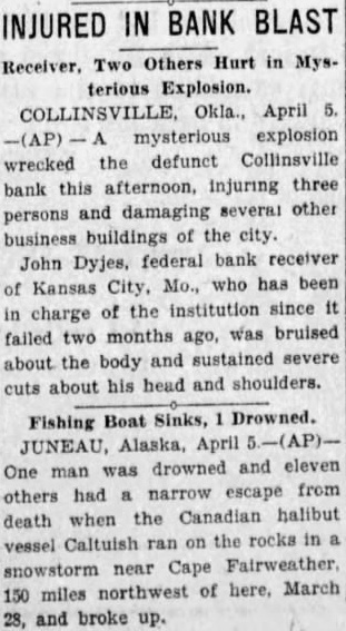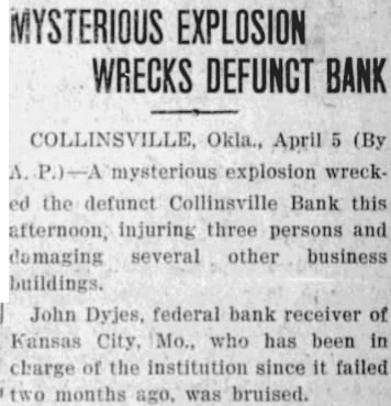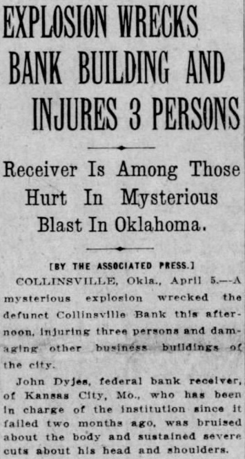 CLOSED BANK DYNAMITED the Associated Press. COLLINSVILLE. Ok., April An explosion. which wrecked the defunct Collinsville Bank, caused injuries to three persons and damaged several other business buildings. John Dajes of Kansas City, Mo., Federal bank receiver. who has been in charge of the depository since it closed its doors two months ago, was bruised about the body and suffered severe cuts about his head and shoulders. Feeling in Collinsville and vicinity has been bitter since the closing of the bank Losses totaled approximately $330,000.