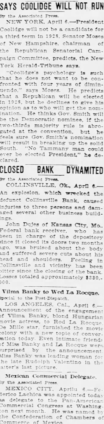 Vilma Banky to Wed La Rocque. Special to the Post Dispatch LOS ANGELES. Cal., April Announcement of the engagement of Vilma Banky, blond Hungarian movie actress, to Rod La Rocque De Mille star furnished the movie colony with a new topic of conversation today Even intimate friends of Miss Banky and LA Rocque were surprised by the announcement Miss Banky was leading woman for the late Rudolph Valentino in the latter's last picture.