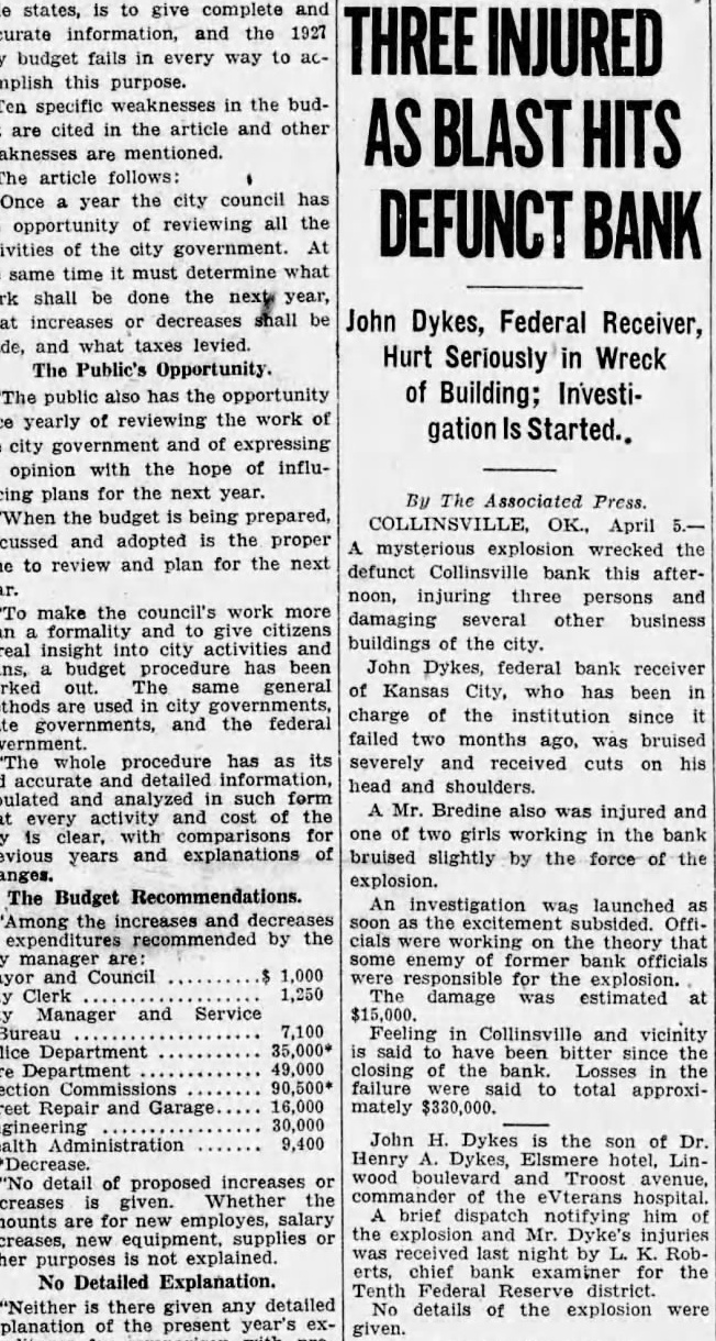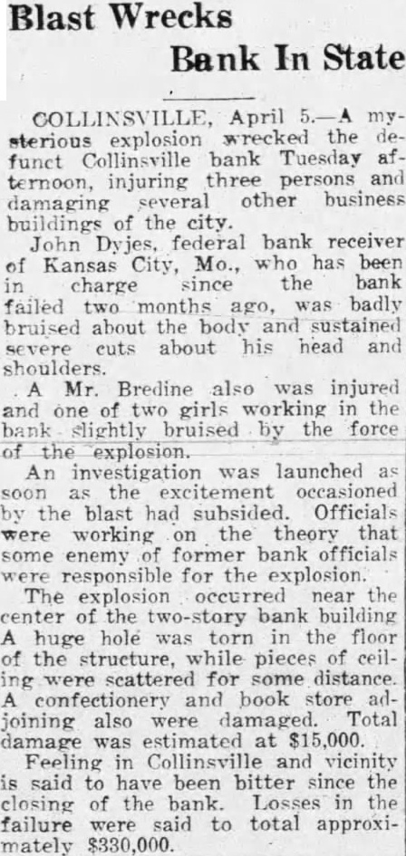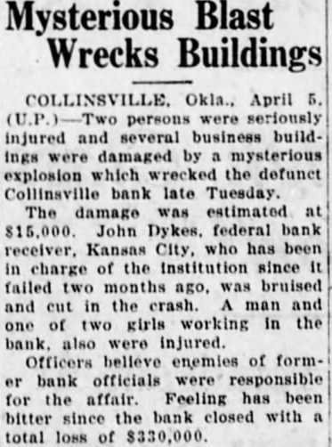By Associated Press. OK., April mysterious explosion wrecked the defunct Collinsville bank this afternoon, injuring three persons and damaging several other business buildings of the city. John Dykes, federal bank receiver Kansas City, who has been in charge the institution since failed two months ago, was bruised severely and received cuts on his head and shoulders. Mr. Bredine also injured and one of two girls working in the bank bruised slightly by the force of the explosion. An investigation was launched the Offiworking on the theory that some enemy officials for the damage estimated Feeling in Collinsville vicinity said been bitter since closing the bank. Losses the failure were said to total approximately $330,000.
