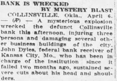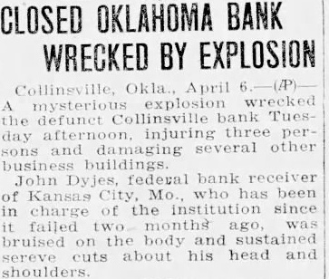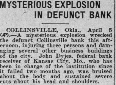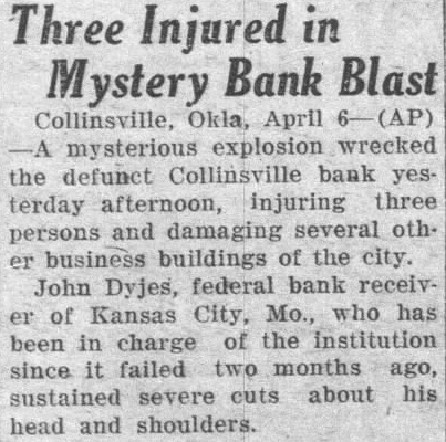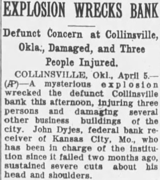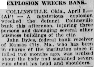 Defunct Concern at Collinsville, Okla:, Damaged, and Three People Injured. Okl., April mysterious wrecked defunct Collinsville bank this afternoon, injuring three persons damaging several other business buildings the city. Dyjes, federal bank ceiver Kansas City, has been in charge of the institufailed months sustained severe cuts about head shoulders.