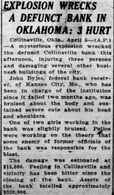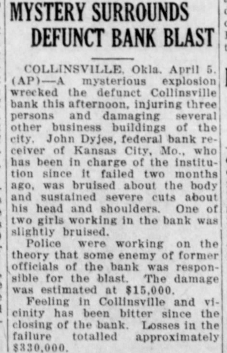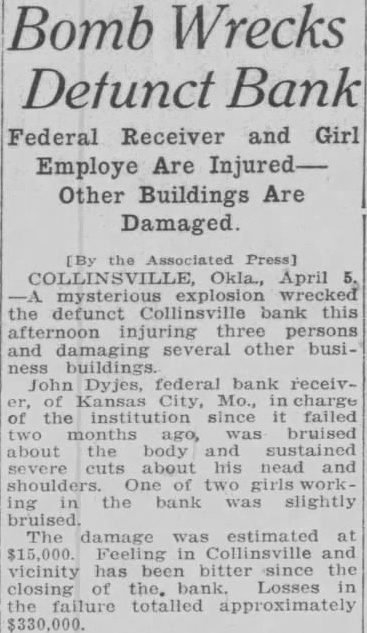 [By the Press] COLLINSVILLE, Okla, April 5. mysterious explosion wrecked the defunct Collinsville bank this afternoon injuring three persons and damaging several other business John Dyjes, federal bank receivKansas City, Mo., in charge of the institution since it failed two months ago, was bruised about the body and sustained severe cuts about his nead and shoulders. of two working in the bank was slightly bruised. The damage was estimated at $15,000. Feeling in Collinsville and vicinity has been bitter since the closing the. bank. Losses in the failure totalled approximately $330,000.
