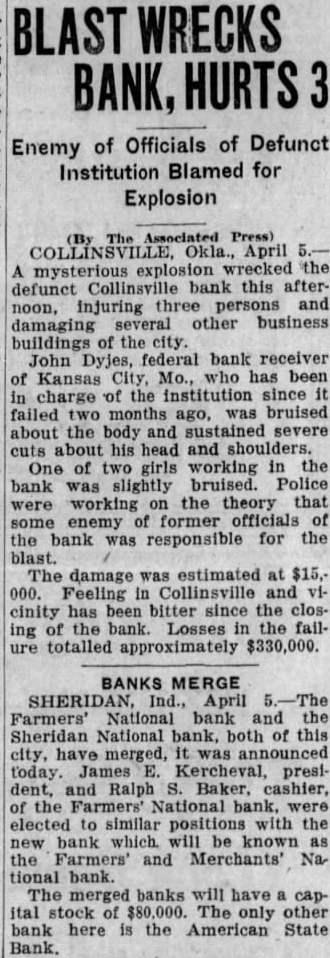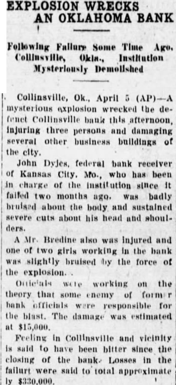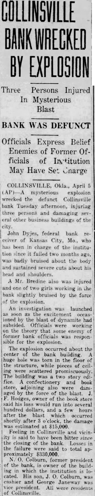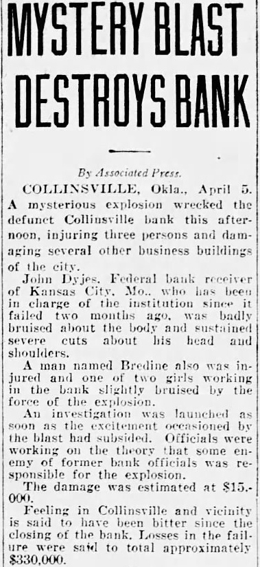 COLLINSVILLE, Okla., April 5. A mysterious explosion wreeked the defunct Collinsville bank this afternoon. injuring three persons and damaging several other business buildings of the city John Dyjes. Federal bank receiver of Kansas has been charge of the institution failed two badly bruised about the body and sustained severe cuts about his head and shoulders. man named Bredine also was injured and one two girls working in the bank slightly bruised by the force of the An investigation was launched as by the blast had subsided. Officials were working on the theory some enemy of former bank officials was responsible for the explosion. The damage was estimated at $15.Feeling in Collinsville and vicinity is said to have bitter since the closing of the bank. Losses in the fail. were said to total approximately $330,000.