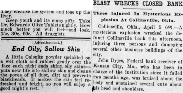 Three Injured In Mysterious Explosion At Collinsville, Okla. Collinsville, Okla., April 5 (P).-A mysterious explosion wrecked the defunct Collinsville bank this afternoon, [Advertisement.] injuring three persons and damaging several other business buildings of the city. A little Calonite powder sprinkled on wet cloth and rubbed gently over the John Dyjes, Federal bank receiver of face each night ends shiny, oily skins- Kansas City, Mo., who has been in puts new life into skin and cleans charge of the institution since it failed the pores of all dust, dirt and prevents two months ago, was bruised about the makes the skin feel refreshed and bright, so you will enjoy body and sustained several cuts about good night's rest. head and shoulders.