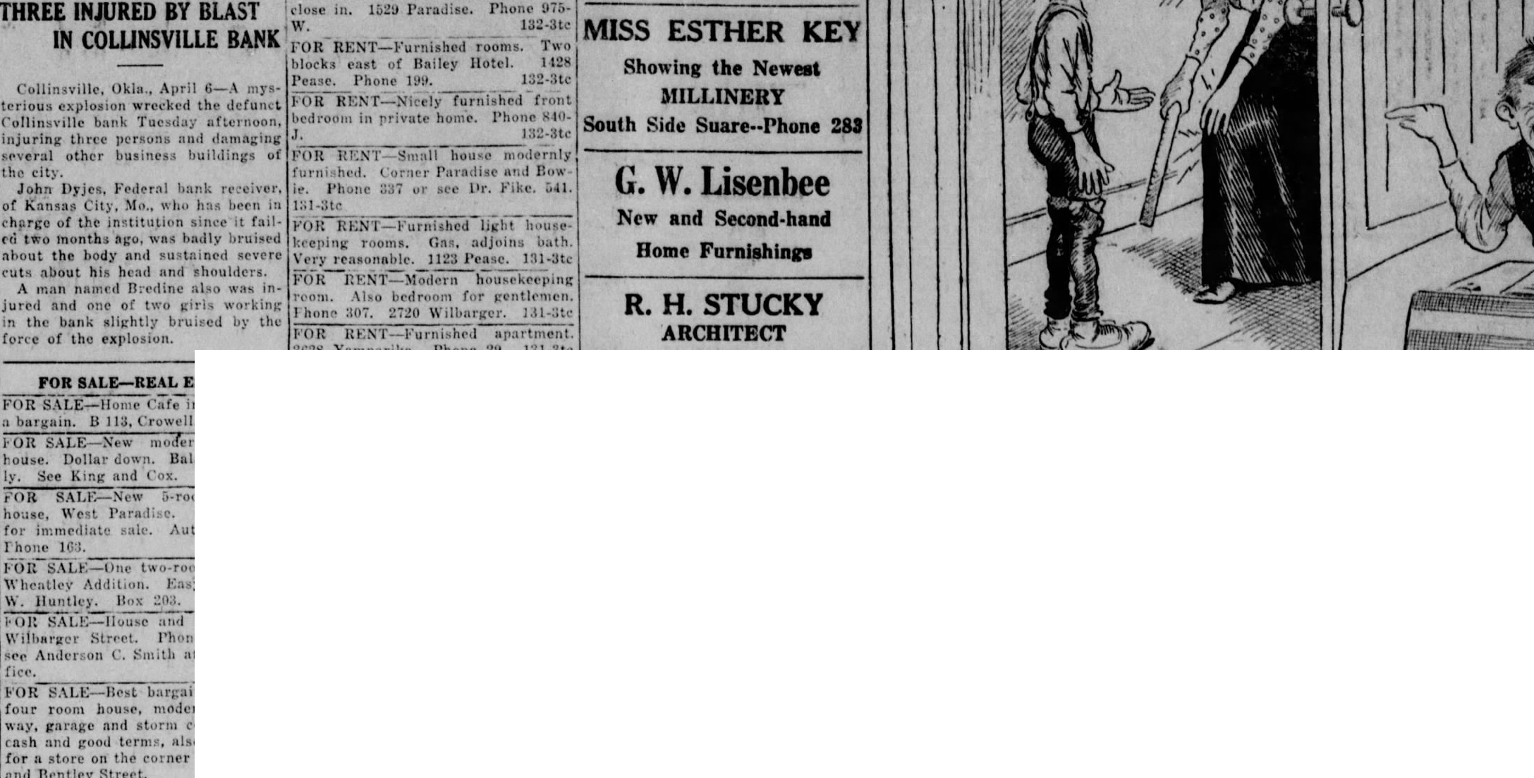 199. Collinsville, Okla., April 6-A mysMILLINERY FOR RENT-Nicely furnished front terious explosion wrecked the defunct bedroom in private home. Phone 840Collinsville bank Tuesday afternoon, South Side Suare--Phone 283 J. injuring three persons and damaging several other business buildings of FOR house modernly the city. furnished. Corner Paradise and Bow. G. W. Lisenbee John Dyjes, Federal bank receiver, ie. Phone 337 or see Dr. Fike. 541. of Kansas City, Mo., who has been in New and Second-hand charge of the institution since it fail- FOR RENT-Furnished light houseed two months ago, was badly bruised keeping rooms. Gas. adjoins bath Home Furnishings about the body and sustained severe Very reasonable. 1123 Pease. 131-3tc cuts about his head and shoulders. FOR RENT-Modern housekeeping A man named Bredine also was inroom. Also bedroom for gentlemen. jured and one of two girls working R. H. STUCKY Phone 307. 2720 Wilbarger. 131-Ste in the bank slightly bruised by the FOR apartment. ARCHITECT force of the explosion.