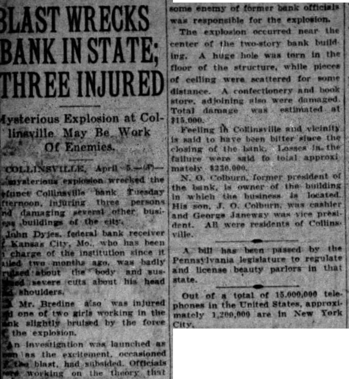 Mysterious Explosion at Collinaville May Be Work Of Enemies. explosion wrecked the Collinsville bank Tuesday Injuring three persons damaging several other busibuildings of the city, John Dyjes. federal bank receiver Kansas City, has been charge of the institution since it months was about the and about his head Mr. Bredine also was injured one of two girls working in the slightly bruised by the force the explosion. Investigation was launched as the excitement. occasioned blast, had subsided. Officials theory that on some enemy of former bank officials responsible for the explosion. The explosion occurred near the center of the two-story bank A hole in the huge of the structure, while pieces floor of celling were for some distance. A and book store. adjoining also were damaged Total estimated at damage was is to been bitter the said of Losses the closing the fathure were said to total approxi mately president of N. former owner of the building the in which the business in located. and George Janeway vice dent. All were residents of Collins ville. by the been legislature to regulate and license beauty parlors in that state.