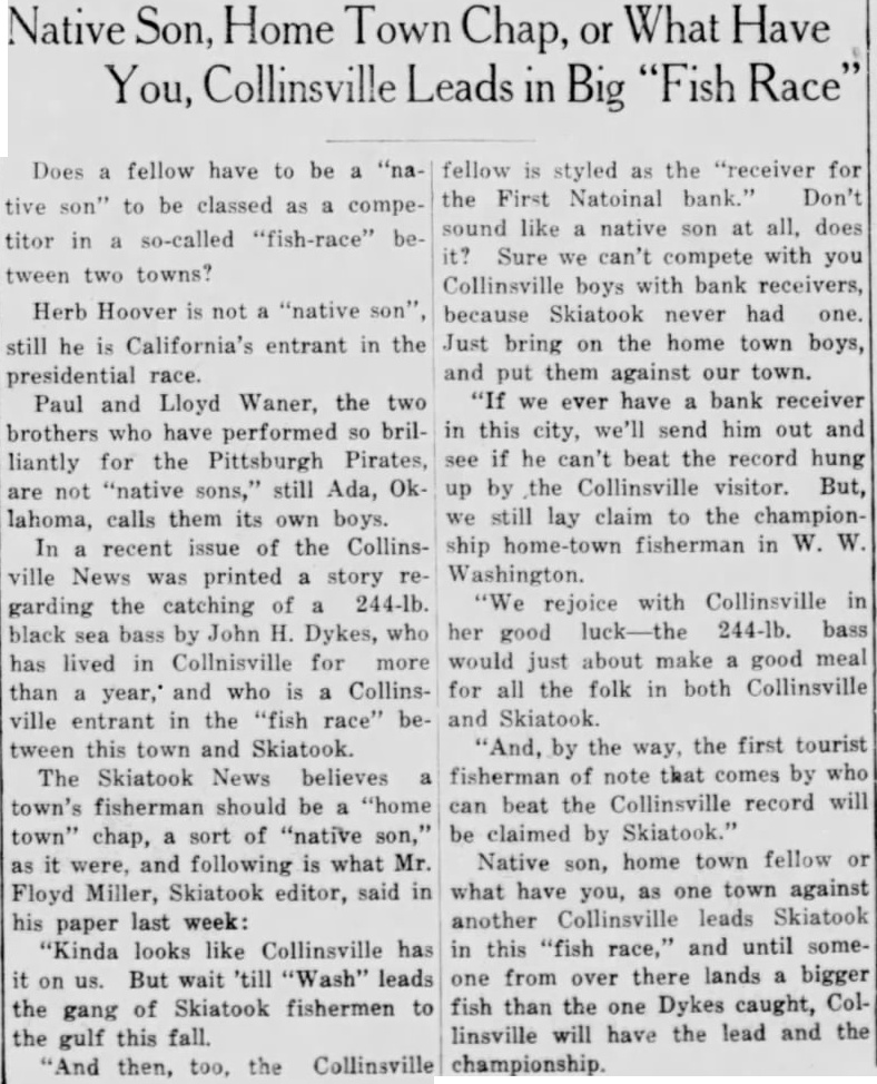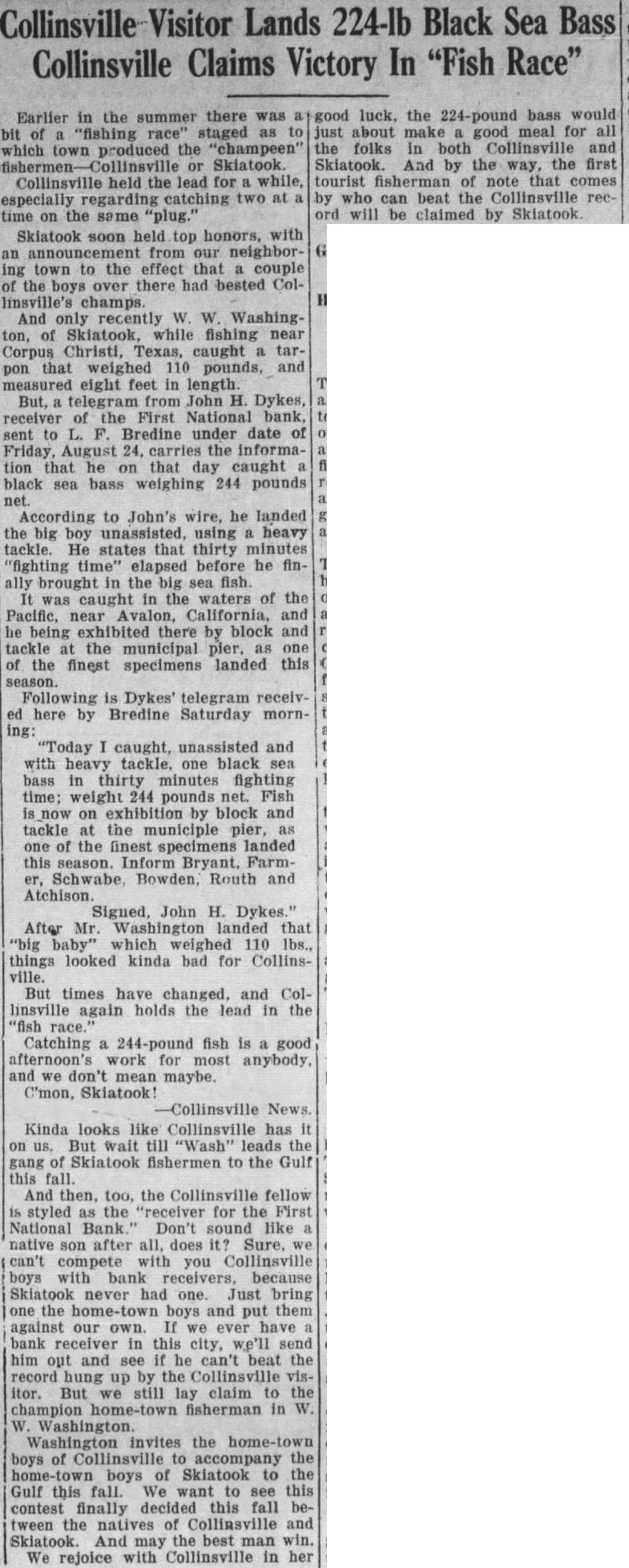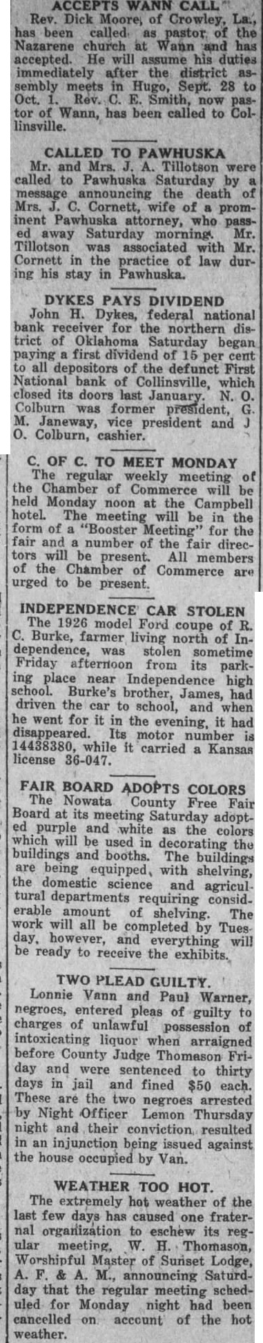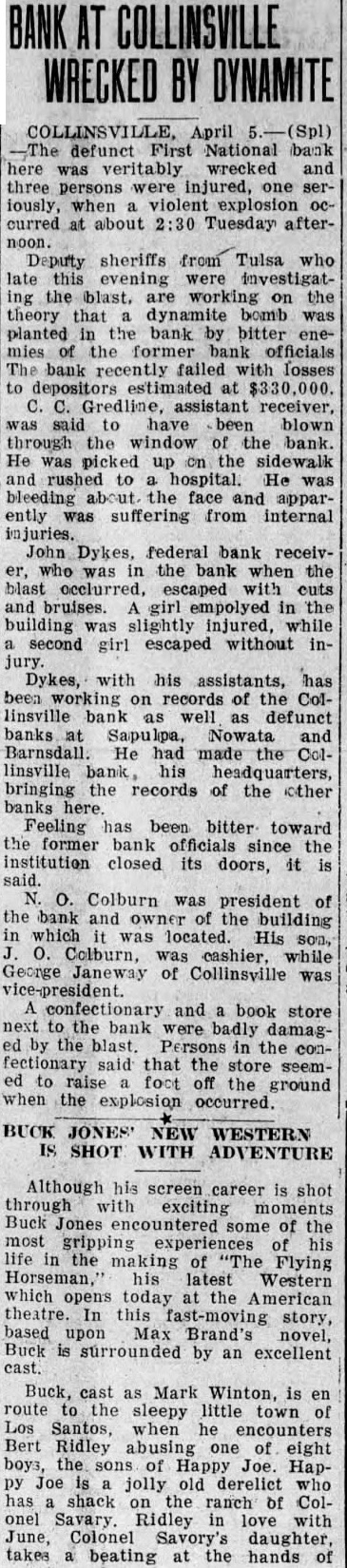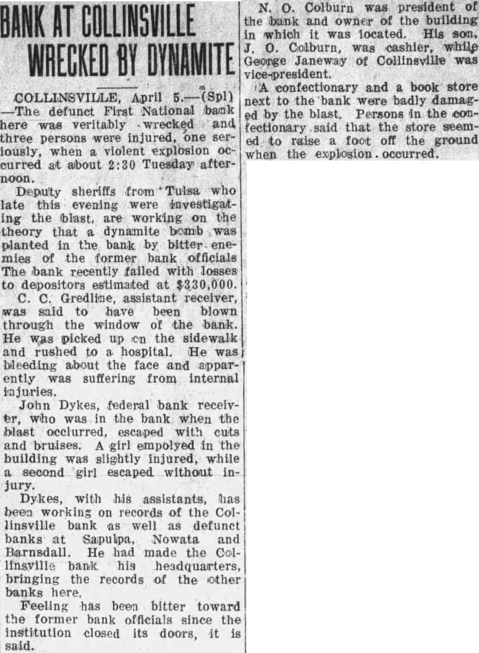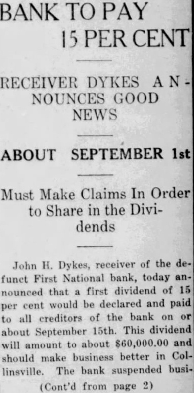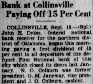RECEIVER OPENS FIRST NATIONAL CONSOLIDATED WITH OTHER INSOLVENT BANKS DYKES IS IN CHARGE Liquidated Parsons, Kan., Bank 100 Per Cent Plus 6 Per Cent Interest There has been considerable quandary since the closing of the First National Bank concerning its re-opening The bank is now open under the direction of John H. Dykes, the receiver, who with his assistants consisting of J. H. Smith, L. E. Bredine, E. F. Bollinger and Miss Kathryn Klotzbach, will endeavor to liquidate the bank in speedy manner and make as little loss to the depositors as possible. Mr. Dykes is also ceiver for the Nowata National Bank, the First National Bank of Sapulpa, and the First National Bank of Barnsdall. He is national bank receiver by profession. This is the sixth insolvent national bank that he has liquidated, the first bank being the Farmers National bank at Parsons, Kansas, which he liquidated 100 per cent to the creditors plus 6 per cent interest on their money. Mr. Dykes will make his headquarters in Collinsville and handle all the banks from this point. The Comptroller of Currency in the interest of economy consolidates failed banks under one receiver as in this instance,, and the receiver is paid a flat salary per year to handle as many as he can. Mr. Dykes states that the creditors of the First National are fortunate in this respect as his salary is just the same now with four banks as it was with three before he was placto ed in charge of the local institution. All debtors are urged to call for an interview with Mr. Dykes at once. Those having property left in safekeeping should call for the same immediately as the receiver will not be responsible for it. All depositors may call at the bank and obtain their cancelled checks and statements and prove up their claims. Mr. Dykes appears to be very congenial person but under the condition it makes it necessary for him to be a bit "hard boiled" if the case necessitates. He has the power of both federal and state courts to enforce the collection of debts due the bank. He appears to want to be fair with those having notes with the bank and would like to have them call and Total make arrangements to take care of their paper at once. The News gets the impression that he expects to be fair with those who wish to be fair Deposits with the bank. pledge Collinsville is getting the reputation of having the coolest headed people possible. They have not beDeposits come excited about the losing of any of the industries and there was no great excitement apparent when the last calamity hit the town, although some of the business firms have been compelled to postpone payments to their wholesale houses on this ac849.10 count. However, that is the only thing they could do for any demonTotal strations of violence to any one would not get their money for them any sooner. ter is good as well as vocalist, having played saxaphone and bass in the local bands while merely boy. In fact he started in the boys band organized by the News editor the year the war took all the older band men into the service and boys were all that were left to make up a band. This band was very popular at the Confederate Veterans reunion held at Tulsa that year, and at which time Collinsville was well advertised by her bands. The News is surely glad to see these young musicians making good at their work It only proves that many of our young people at the present time are wasting opportunity by not taking up something useful in their spare time.