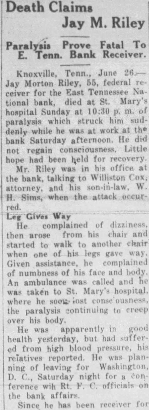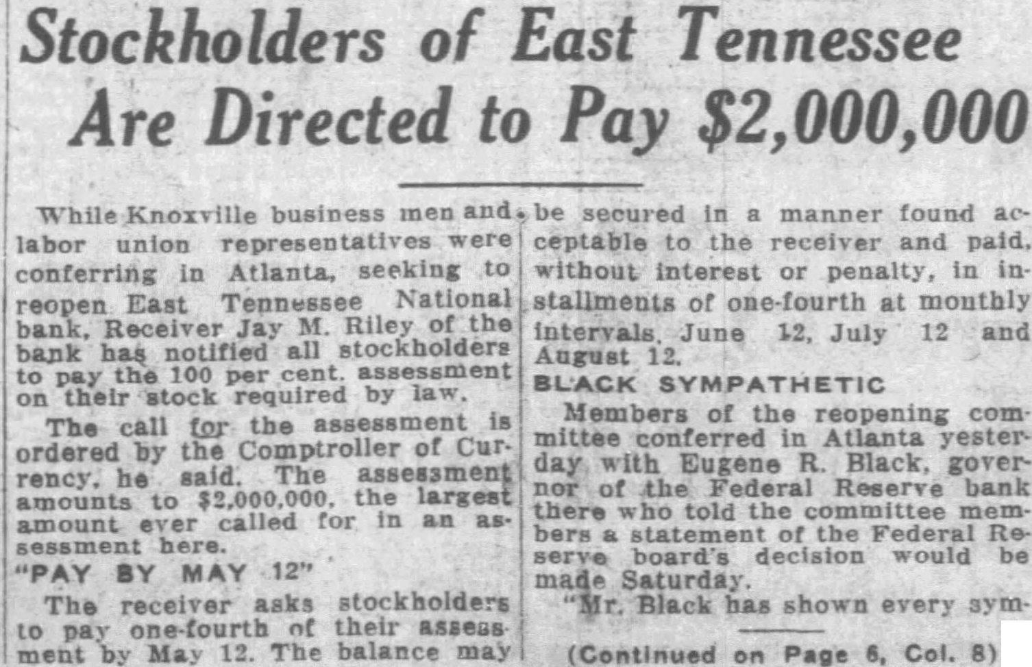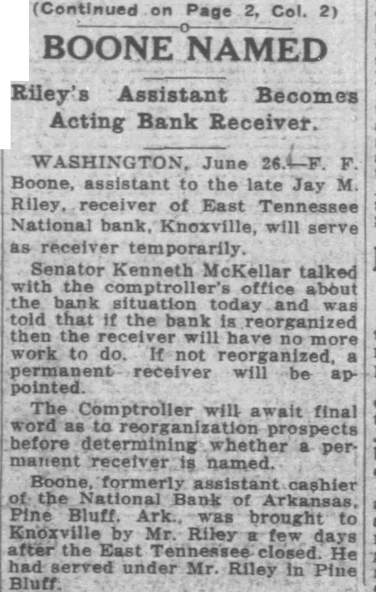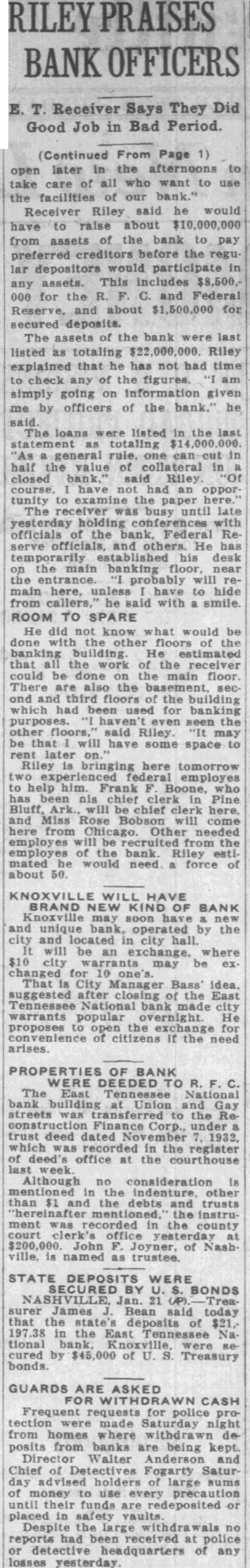 Finishing Co. bonds of $75,000. Alabama Mills Co. bonds of $75,000 and Frank Silk Mills $75,000. Holston-Union, the bill avers. actually paid Caldwell and Co. $300,000 in cash for the bonds and describes a "round robin of paper transactions' whereby Caldwell & Co. took the $300,000 and purchased bonds from the state of Mississippi. The state of Mississippi placed the money on deposit in the Capital National Bank, of Jackson, Miss., and that bank, in turn, deposited it in the Holston-Union, the bill says. Thus, according to the bill "Caldwell and Co. obtained $300, 000 of bonds of the state of Mississippi and Holston-Union became indebted to the Capital National Bank for $300,000 and had, to offset this obligation, only these worthless bonds of par value of $300,000." "Helped Each Other" Ramsey, according to the bill. had business connections with Rogers Caldwell and the Bank of Tennessee and the two "were accustomed to favoring each other in matters pertaining to their personal affairs, their co-operation consisting principally of aidIng each other financially by loans of money. Said Caldwell caused companies in which he was interested to lend said Ramsey money and the latter, without authority, frequently caused the Hoiston-Union to lend or advance money to said Caldwell and companies in which he was interested." Luke Lea also was described as henchman of Ramsey's in that the two helped each other financially Ramsey thru Holston funds. "On Sept. 26, reads the bill. "Ramsey was insolvent and desired to procure the sum of $14,500. He caused the said HolstonUnion Bank to deliver the sum of $14,500 to the Bank of Tennessee and immediately borrowed said sum from latter bank which was at the time hopelessly insolvent, which said Ramsey fully knew. Said Ramsey knew that at the time the Bank of Tennessee was indebted to the said HolstonUnion Bank by note in the principal sum of $100,000 and that note. Said note, in fact, never has been paid. Said Ramsey also knew that said Bank of Tennessee was also indebted to a corporation known as the Knoxville Journat, Inc., in the proximate amount of $100,000 and said Bank of Tennessee was wholly unable to pay said indebtedness. The $14,500 which Ramsey is alleged to have caused the Holston-Union to deliver to the Bank of Tennessee was done by Ramsey without authority, the bill declared. The act was not approved by the Board of Directors or the bank's Finance Committee, it is alleged. On Feb. 21, 1930, according to Pearson's bill, Ramsey presented application for a loan of $150,000 to be evidenced by a note executed by persons known as William White, Edward Potter and Rogers Caldwell The loan was to be secured by 510 shares of the capital stock of East Tennessee National Bank Ramsey it is set out, was authorized by the Finance Committee to make the loan in reliance upon a note executed by White, Potter and Caldwell to be secured by the stock collateral. Ramsey "with dishonest Intent and in violation and advanced said sum in consideration of a note signed only by said William White with the described collateral deposited as security, reads the bill. The collateral at that time was of sufficient value to fully secure payment of the note. Pearson's bill declares, and continued to be 60 until after May 28, 1930, when Ramsey "with dishonest intent, surrendered said collateral upon receiving a payment of $110,000 on said note, leaving unpaid balance in principal amount of $40,000. Said William White at that time was insolvent and is insolvent now." This transaction was described in the bill among many others as a favor to Luke Lea, al-
