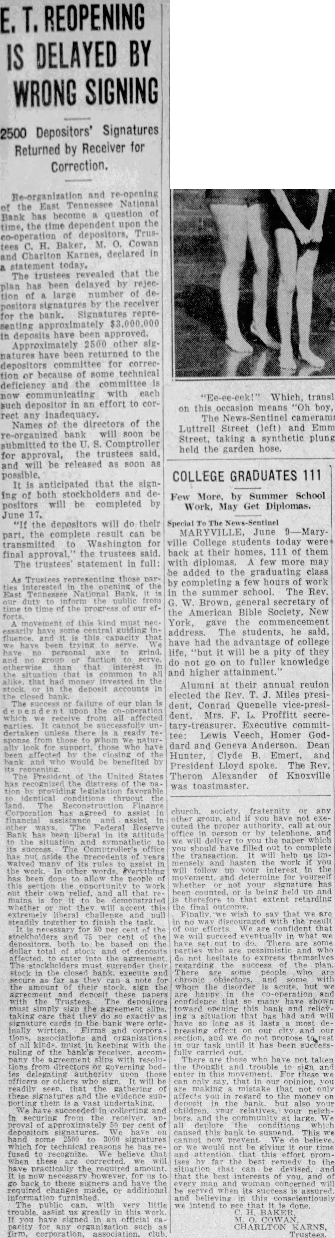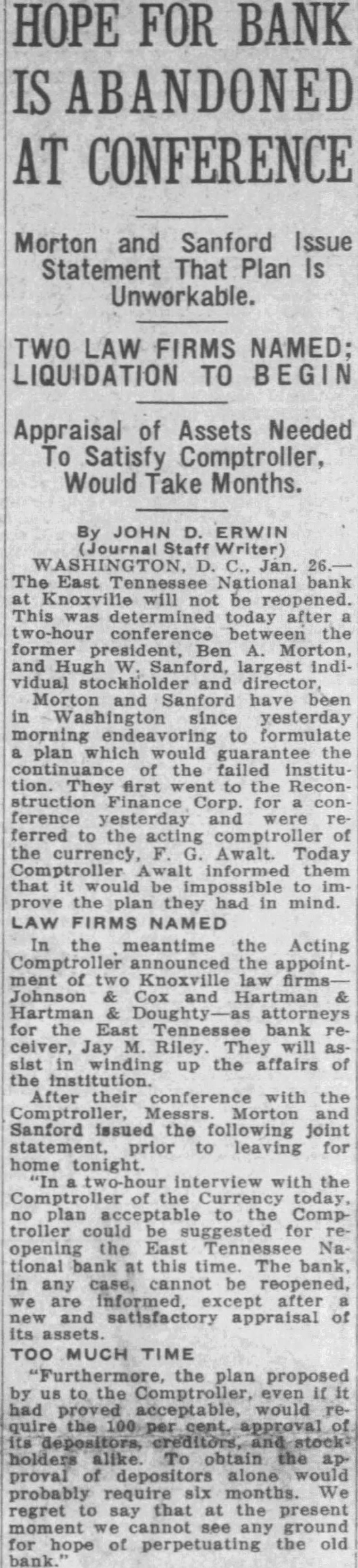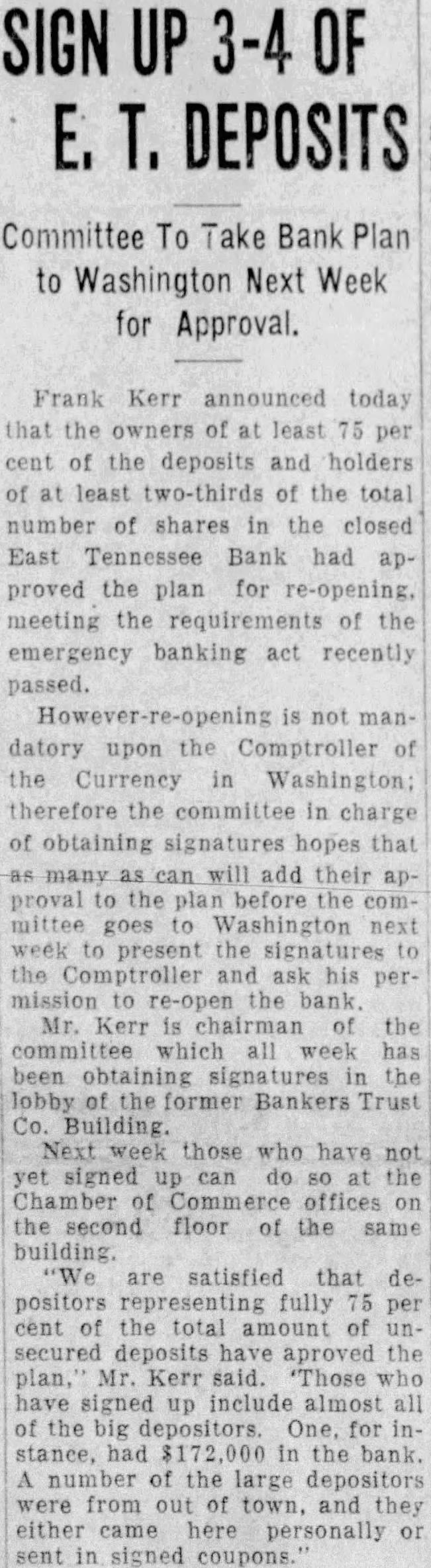 Finishing Co. bonds of $75,000. Alabama Mills Co. bonds of $75,000 and Frank Silk Mills $75,000. Holston-Union, the bill avers. actually paid Caldwell and Co. $300,000 in cash for the bonds and describes a "round robin of paper transactions' whereby Caldwell & Co. took the $300,000 and purchased bonds from the state of Mississippi. The state of Mississippi placed the money on deposit in the Capital National Bank, of Jackson, Miss., and that bank, in turn, deposited it in the Holston-Union, the bill says. Thus, according to the bill "Caldwell and Co. obtained $300, 000 of bonds of the state of Mississippi and Holston-Union became indebted to the Capital National Bank for $300,000 and had, to offset this obligation, only these worthless bonds of par value of $300,000." "Helped Each Other" Ramsey, according to the bill. had business connections with Rogers Caldwell and the Bank of Tennessee and the two "were accustomed to favoring each other in matters pertaining to their personal affairs, their co-operation consisting principally of aidIng each other financially by loans of money. Said Caldwell caused companies in which he was interested to lend said Ramsey money and the latter, without authority, frequently caused the Hoiston-Union to lend or advance money to said Caldwell and companies in which he was interested." Luke Lea also was described as henchman of Ramsey's in that the two helped each other financially Ramsey thru Holston funds. "On Sept. 26, reads the bill. "Ramsey was insolvent and desired to procure the sum of $14,500. He caused the said HolstonUnion Bank to deliver the sum of $14,500 to the Bank of Tennessee and immediately borrowed said sum from latter bank which was at the time hopelessly insolvent, which said Ramsey fully knew. Said Ramsey knew that at the time the Bank of Tennessee was indebted to the said HolstonUnion Bank by note in the principal sum of $100,000 and that note. Said note, in fact, never has been paid. Said Ramsey also knew that said Bank of Tennessee was also indebted to a corporation known as the Knoxville Journat, Inc., in the proximate amount of $100,000 and said Bank of Tennessee was wholly unable to pay said indebtedness. The $14,500 which Ramsey is alleged to have caused the Holston-Union to deliver to the Bank of Tennessee was done by Ramsey without authority, the bill declared. The act was not approved by the Board of Directors or the bank's Finance Committee, it is alleged. On Feb. 21, 1930, according to Pearson's bill, Ramsey presented application for a loan of $150,000 to be evidenced by a note executed by persons known as William White, Edward Potter and Rogers Caldwell The loan was to be secured by 510 shares of the capital stock of East Tennessee National Bank Ramsey it is set out, was authorized by the Finance Committee to make the loan in reliance upon a note executed by White, Potter and Caldwell to be secured by the stock collateral. Ramsey "with dishonest Intent and in violation and advanced said sum in consideration of a note signed only by said William White with the described collateral deposited as security, reads the bill. The collateral at that time was of sufficient value to fully secure payment of the note. Pearson's bill declares, and continued to be 60 until after May 28, 1930, when Ramsey "with dishonest intent, surrendered said collateral upon receiving a payment of $110,000 on said note, leaving unpaid balance in principal amount of $40,000. Said William White at that time was insolvent and is insolvent now." This transaction was described in the bill among many others as a favor to Luke Lea, al-
