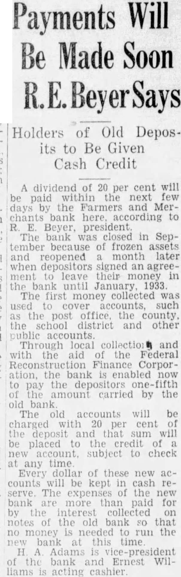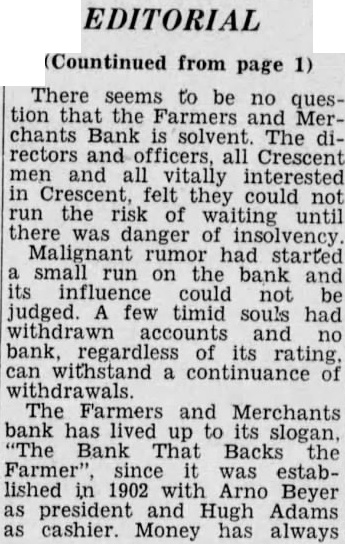 THE Farmers and Merchants Bank of Crescent was closed last week, with the state banking department taking charge. Farm loans which could not readily be liquidated were given as the cause for the bank's trou- ble. It is considered, however, that a high per cent of the loans are collectible, and that there will be little or no loss to deposi- tors when the bank is liquidated.