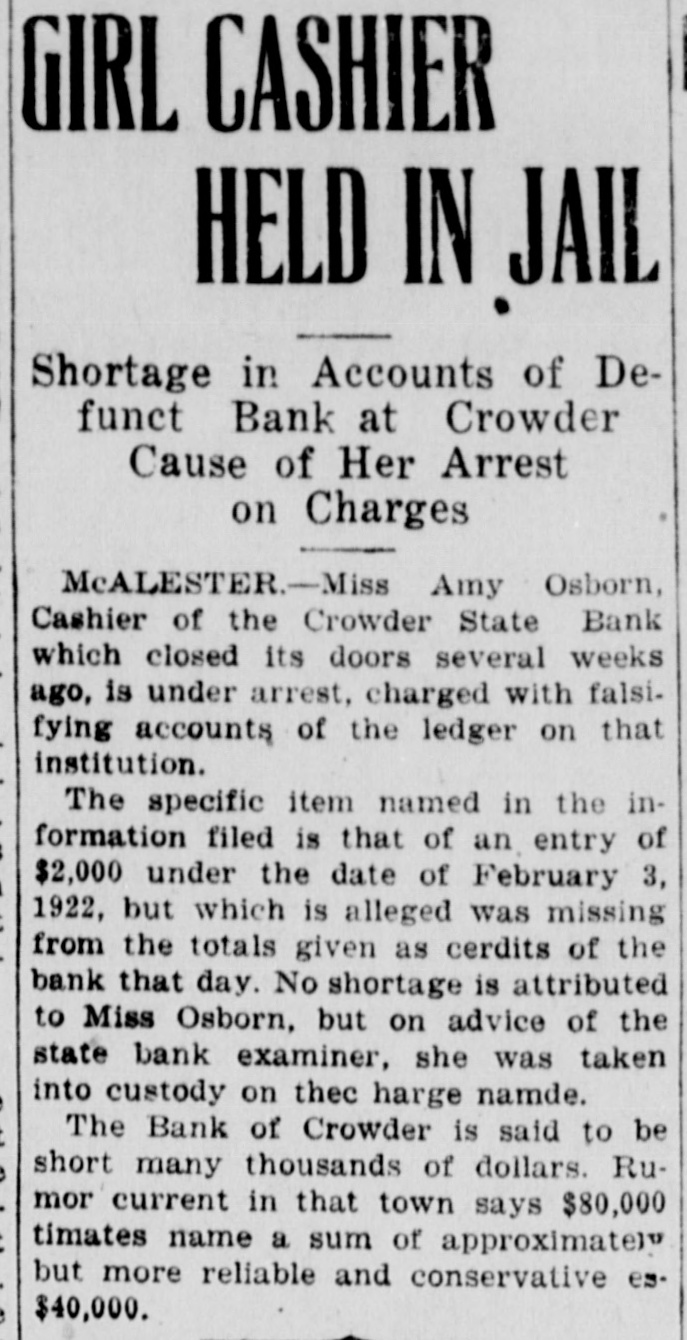 # GIRL CASHIER # HELD IN JAIL Shortage in Accounts of Defunct Bank at Crowder Cause of Her Arrest on Charges MCALESTER. - Miss Amy Osborn, Cashier of the Crowder State Bank which closed its doors several weeks ago, is under arrest, charged with falsifying accounts of the ledger on that institution. The specific item named in the information filed is that of an entry of $2,000 under the date of February 3, 1922, but which is alleged was missing from the totals given as cerdits of the bank that day. No shortage is attributed to Miss Osborn, but on advice of the state bank examiner, she was taken into custody on the charge namde. The Bank of Crowder is said to be short many thousands of dollars. Rumor current in that town says $80,000 timates name a sum of approximately but more reliable and conservative es- $40,000.