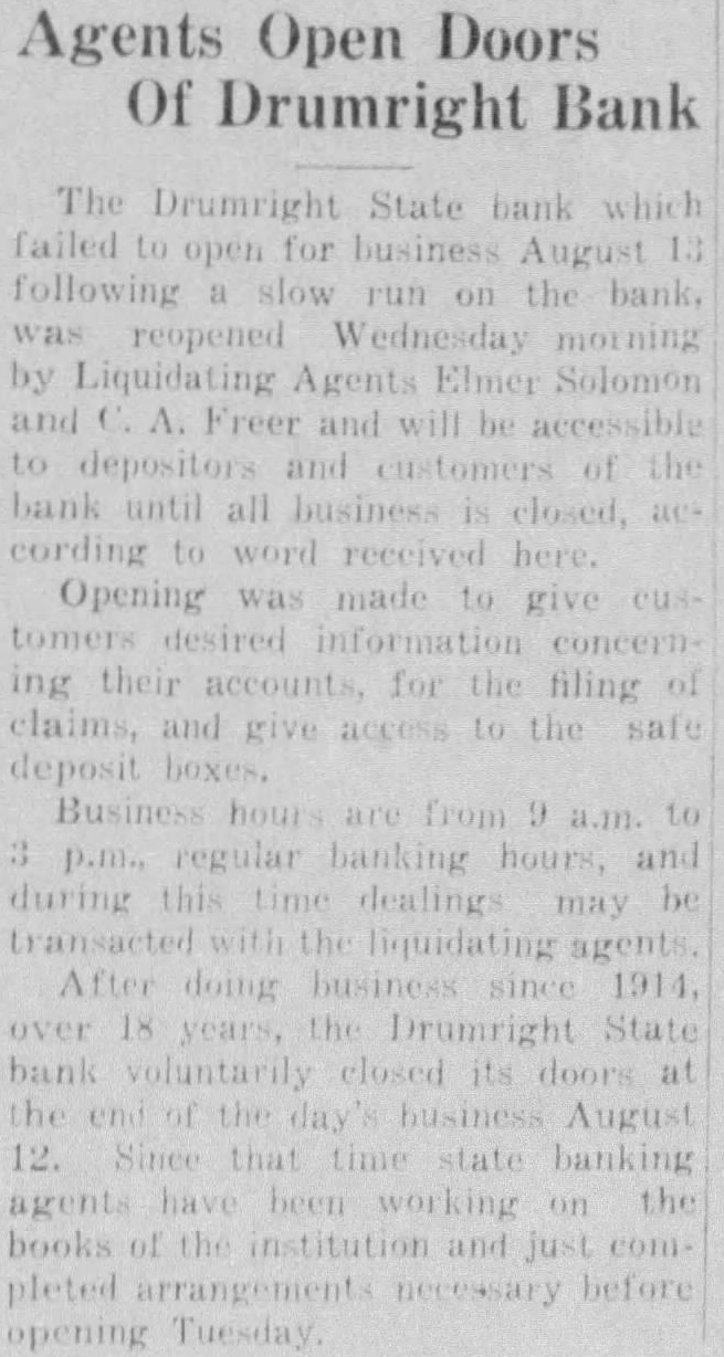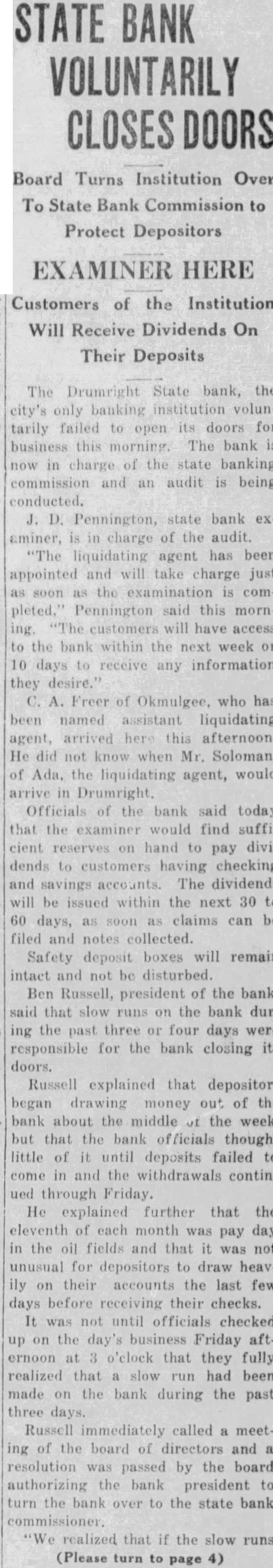 STATE BANK VOLUNTARILY Board Turns Institution Over To State Bank Commission to Protect Depositors EXAMINER HERE Customers of the Institution Will Receive Dividends On Their Deposits The Drumright State bank, the city's only banking institution voluntarily failed to open its doors for business this morning. The bank now in charge of the state banking commission and an audit being conducted. Pennington, state bank examiner, in charge of the audit. liquidating agent has been appointed and will take charge just as soon the examination is completed," Pennington said this morncustomers will have access to the bank within the next week or 10 days to receive any information they desire." Okmulgee, who has been named assistant liquidating agent, arrived here this afternoon. He did not know when Mr. Soloman, of Ada, the liquidating agent, would arrive in Drumright. Officials of the bank said today that the examiner would find sufficient reserves on hand to pay dividends to customers having checking and savings The dividends will be issued within the next 30 to 60 days, as soon as claims can be filed and notes collected. Safety deposit boxes will remain intact and not be disturbed. Ben Russell, president of the bank, said that slow runs on the bank during the past three or four days were responsible for the bank closing its doors. Russell explained that depositors began drawing money out of the bank about the middle the week, but that the bank thought little of it until deposits failed to come in and the withdrawals continued through Friday. explained further that the eleventh of each month was pay day the oil fields and that it was not unusual for depositors to draw heavily on their accounts the last few days before receiving their checks. It was not until officials checked up on the day's business Friday afternoon at o'clock that they fully realized that slow run had been made the bank during the past three days. Russell immediately called meeting of the board of directors and resolution was passed by the board authorizing the bank president to turn the bank to the state bank commissioner. realized that if the slow runs (Please turn to page