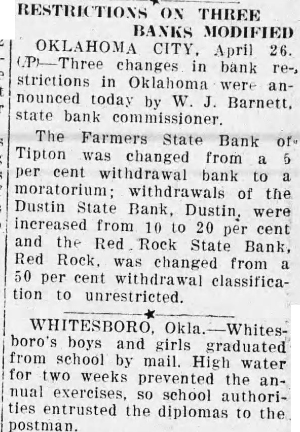 THREE BANKS MODIFIED April 26. changes in bank re-, strictions in Oklahoma were nounced today by Barnett, state bank commissioner. Bank Tipton was changed from per cent withdrawal bank moratorium; withdrawals of the Dustin State Bank, Dustin, were increased from 10 to 20 per cent and the Red Rock State Bank, Red Rock, was changed from 50 per cent withdrawal classification to unrestricted. boro's boys and girls graduated from school by mail. High water for two weeks the nual exercises, school authorities entrusted the diplomas to the postman.