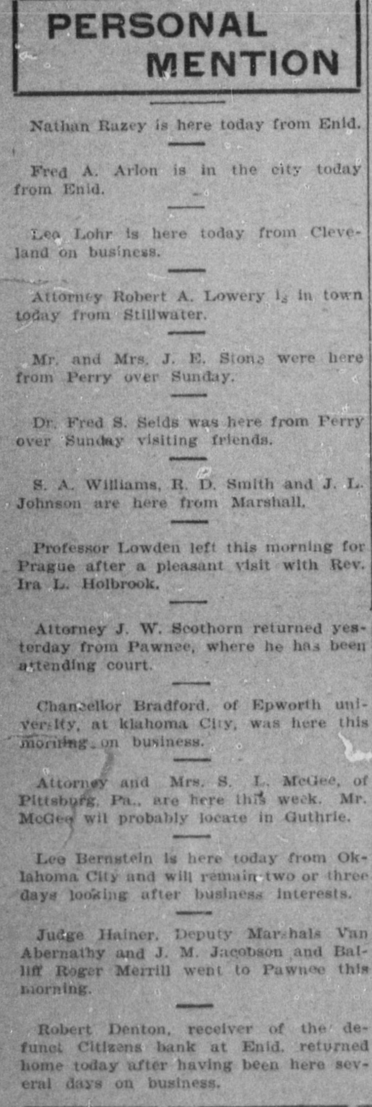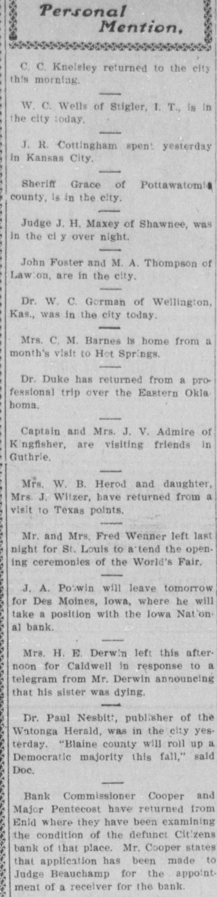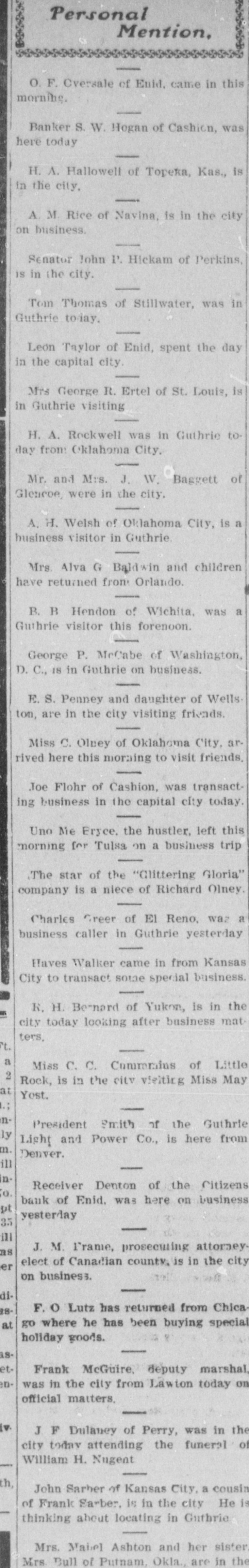 Mention, O. F. Oversale of Enid. came in this morning. | Banker S. W. Hogan of Cashion, was here today H. Л. Hallowell of TopeKa, Kas,, is in the city, | A. M. Rice of Navina, is in the city on business. Senator John P. Hickam of Perkins, is in the city. Tom Thomas of Stillwater, was in Guthrie today. Leon Taylor of Enid, spent the day in the capital city. Mrs George R. Ertel of St. Louis, is in Guthrie visiting H. A. Rockwell was in Guthrie today from Oklahoma City. Mr. and Mrs. J. W. Baggett of Glencoe, were in the city. A. H. Welsh of Oklahoma City, is a business visitor in Guthrie Mrs. Alva G Baldwin and children have returned from Orlando. B. B Hendon of Wichita. was a Guthrie visitor this forenoon. George P. McCabe of Washington, D. C., IS in Guthrie on business. E. S. Penney and daughter of Wellston, are in the city visiting friends. Miss C. Olney of Oklahoma City, arrived here this morning to visit friends. Joe Flohr of Cashion, was transacting business in the capital city today. Uno Me Eryce, the hustler, left this morning for Tulsa on a business trip The star of the "Clittering Gloria" company is a niece of Richard Olney. Charles Green of El Reno, waz a business caller in Guthrie yesterday Haves Walker came in from Kansas City to transact some special business. R. H. Bernard of Yukon, is in the city today looking after business mat ters, 7. | a Miss C. C. Commrains of Little 2 Rock, is in the city visiting Miss May at Yest. I nPresident Smith of the Guthrie ly Light and Power Co., is here from m. Denver. ill n. Receiver Denton of the Citizens O. bank of Enid. was here on business pt yesterday 35 ill J. M. Prame, prosecuting attorney as elect of Canadian county, is in the city er on business. — diF. o Lutz has returned from Chica 18go where he has been buying special at holiday goods. asFrank McGuire, deputy marshal, enwas in the city from Lawton today on official matters. (v. J F Dulaney of Perry, was in the city today attending the funeral of William H. Nugent th, John Sarher of Kansas City, a cousin of Frank Sarber, is in the city He is thinking about locating in Guthrie Mrs. Mabel Ashton and her sister Mrs. Bull of Putnam Okla., are in the