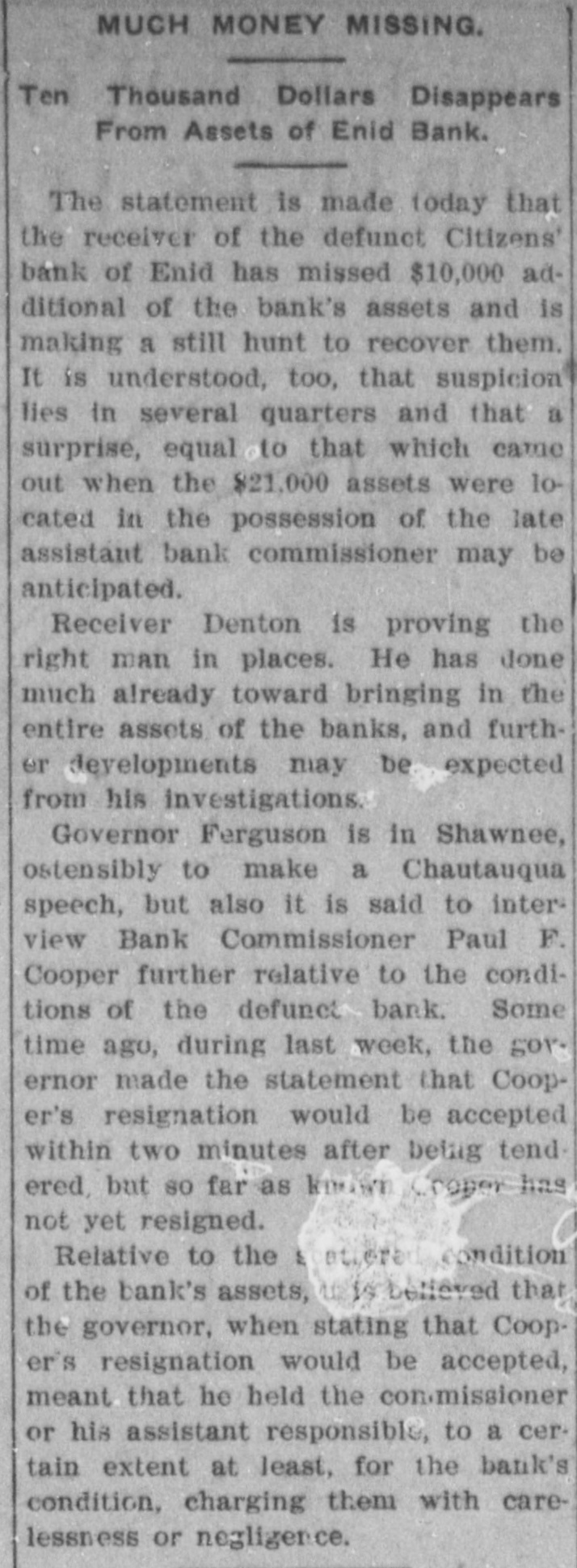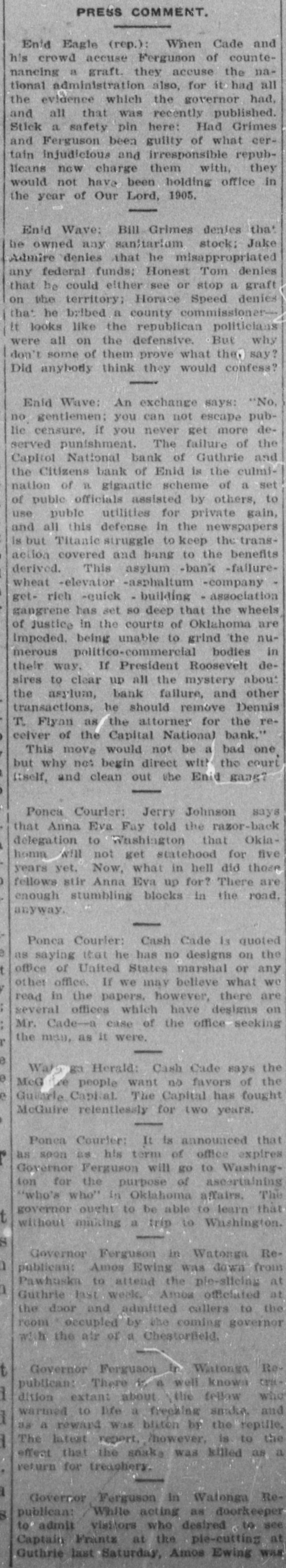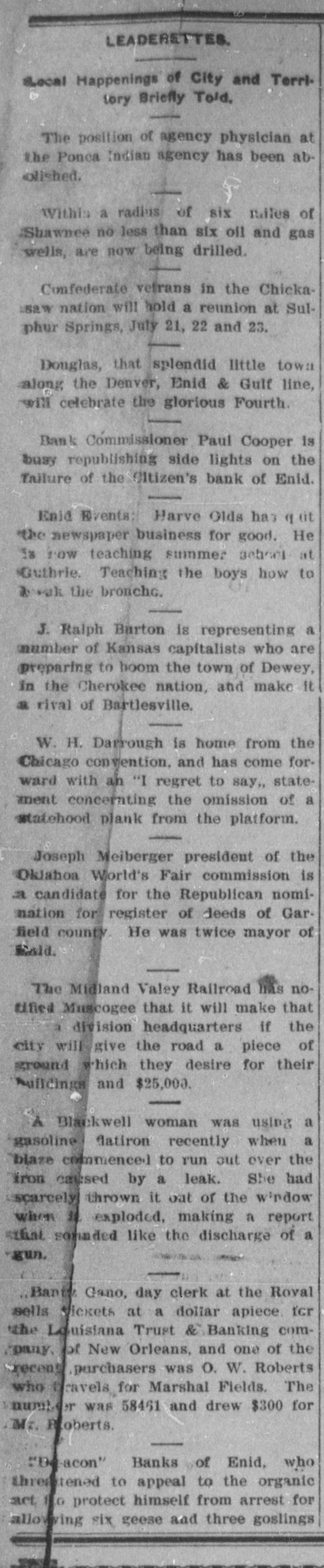 Mention, O. F. Oversale of Enid. came in this morning. | Banker S. W. Hogan of Cashion, was here today H. Л. Hallowell of TopeKa, Kas,, is in the city, | A. M. Rice of Navina, is in the city on business. Senator John P. Hickam of Perkins, is in the city. Tom Thomas of Stillwater, was in Guthrie today. Leon Taylor of Enid, spent the day in the capital city. Mrs George R. Ertel of St. Louis, is in Guthrie visiting H. A. Rockwell was in Guthrie today from Oklahoma City. Mr. and Mrs. J. W. Baggett of Glencoe, were in the city. A. H. Welsh of Oklahoma City, is a business visitor in Guthrie Mrs. Alva G Baldwin and children have returned from Orlando. B. B Hendon of Wichita. was a Guthrie visitor this forenoon. George P. McCabe of Washington, D. C., IS in Guthrie on business. E. S. Penney and daughter of Wellston, are in the city visiting friends. Miss C. Olney of Oklahoma City, arrived here this morning to visit friends. Joe Flohr of Cashion, was transacting business in the capital city today. Uno Me Eryce, the hustler, left this morning for Tulsa on a business trip The star of the "Clittering Gloria" company is a niece of Richard Olney. Charles Green of El Reno, waz a business caller in Guthrie yesterday Haves Walker came in from Kansas City to transact some special business. R. H. Bernard of Yukon, is in the city today looking after business mat ters, 7. | a Miss C. C. Commrains of Little 2 Rock, is in the city visiting Miss May at Yest. I nPresident Smith of the Guthrie ly Light and Power Co., is here from m. Denver. ill n. Receiver Denton of the Citizens O. bank of Enid. was here on business pt yesterday 35 ill J. M. Prame, prosecuting attorney as elect of Canadian county, is in the city er on business. — diF. o Lutz has returned from Chica 18go where he has been buying special at holiday goods. asFrank McGuire, deputy marshal, enwas in the city from Lawton today on official matters. (v. J F Dulaney of Perry, was in the city today attending the funeral of William H. Nugent th, John Sarher of Kansas City, a cousin of Frank Sarber, is in the city He is thinking about locating in Guthrie Mrs. Mabel Ashton and her sister Mrs. Bull of Putnam Okla., are in the
